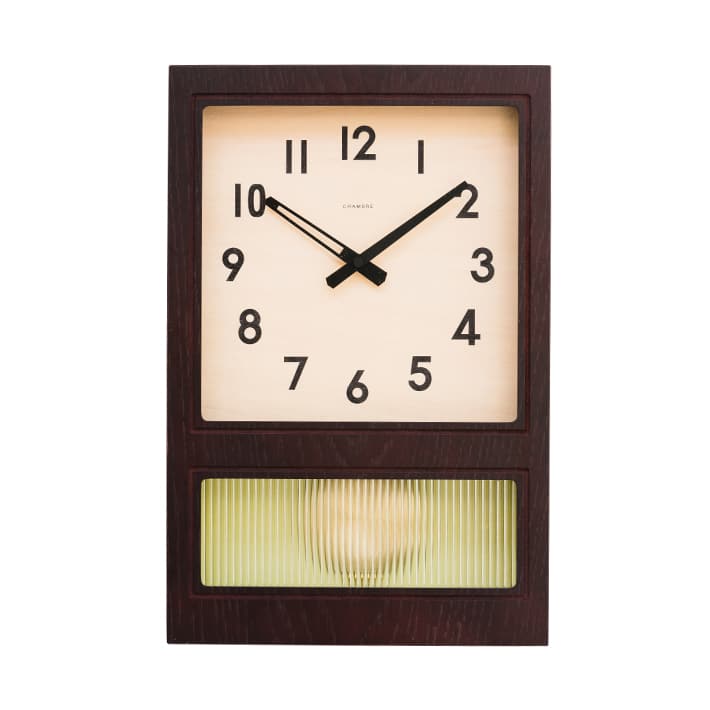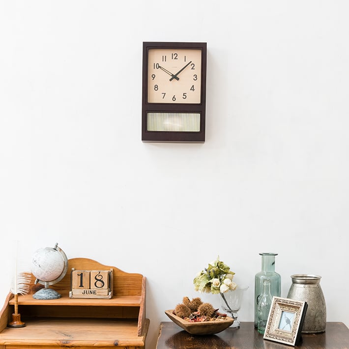 あまり見られないゼンマイ式の振り子時計をクオーツ時計として再現しました。文字盤にはシナ材を使用。ストライプ状のアンティークガラスからうっすら見える振り子がノスタルジックな雰囲気を演出します。