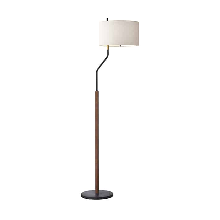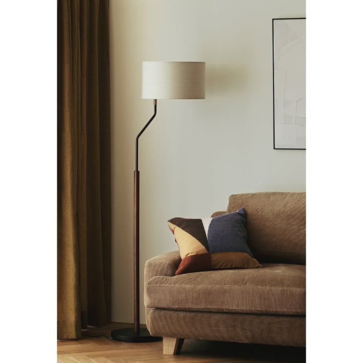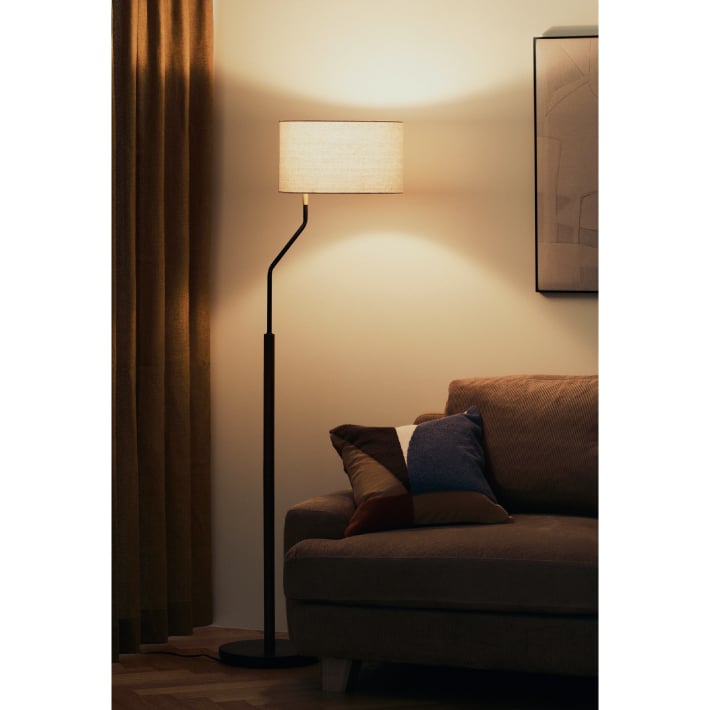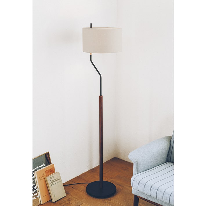 印象的なシルエットが魅力のフロアスタンドライト。ファブリックシェードの上下から光が抜けるので、空間全体をやさしく照らしてくれます。可動式のシェードなので、ソファやデスクの横に置いたり、読書灯や手元灯にしたりと、シーンに合わせてお使いいただけるのもポイントです。※ライトの種類、必要な配線器具、お部屋に合った明るさの目安についてはこちら