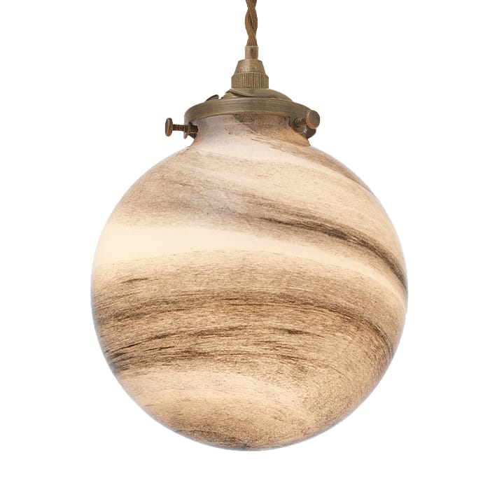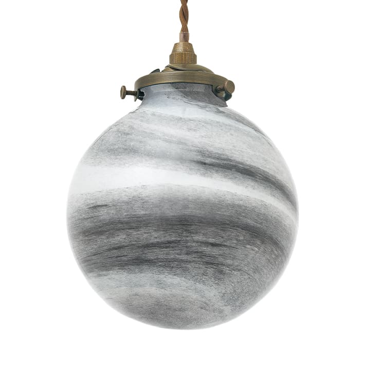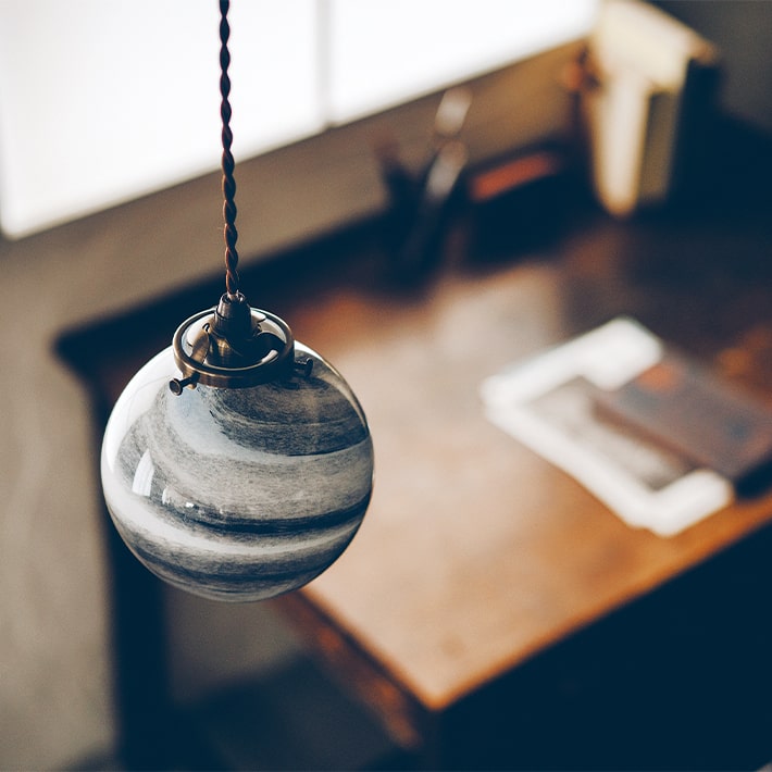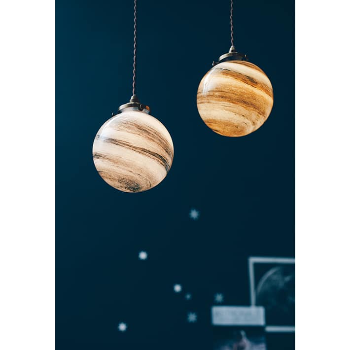 宇宙に浮かぶ惑星をモチーフにした、ガラスのシェードが独創的なペンダントライト。消灯時にはオブジェのようなインテリアアイテムとして。点灯時にはマーブル模様が浮かび上がり、幻想的な光がじんわりと広がります。明かりをつけているときと、消しているときで、異なる表情や色合いの違いを楽しめるので、多灯使いもおすすめです。※ライトの種類、必要な配線器具、お部屋に合った明るさの目安についてはこちら