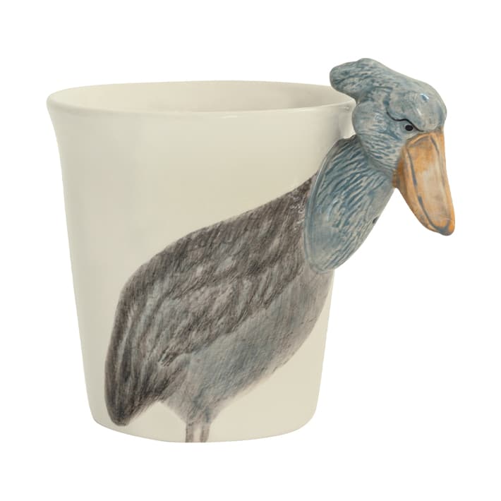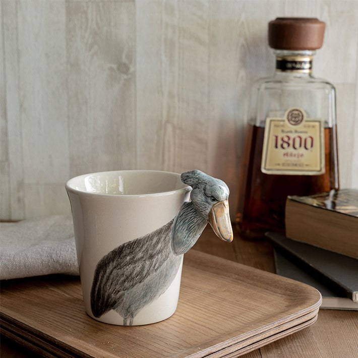 ハシビロコウをモチーフにしたマグカップ。手や顔がマグからはみ出たような立体感のあるデザインがポイントです。一点一点にていねいに手作業でペイントされた、ハンドメイドならではの温もりを感じられます。マグカップとしてはもちろん、ペン立てや歯ブラシホルダーとしてもおすすめです。