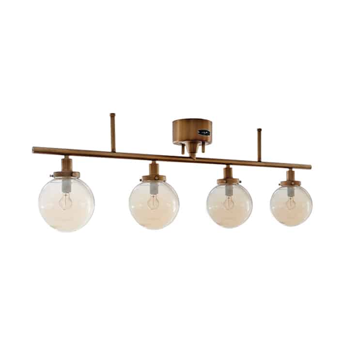 真鍮のような濃淡のあるゴールドフレームと球体ガラスが、アメリカ西海岸のアンティーク照明を思わせるシーリングライト。ガラスにはアンバー(琥珀)カラーが内側から吹き付け塗装され、やさしい光を放ちます。明るさを4段階で調節できる便利なリモコン付き。ヴィンテージテイストやカフェスタイルなど、お部屋の個性を引き立てるポイントアイテムとしておすすめです。※ライトの種類、必要な配線器具、お部屋に合った明るさの目安についてはこちら