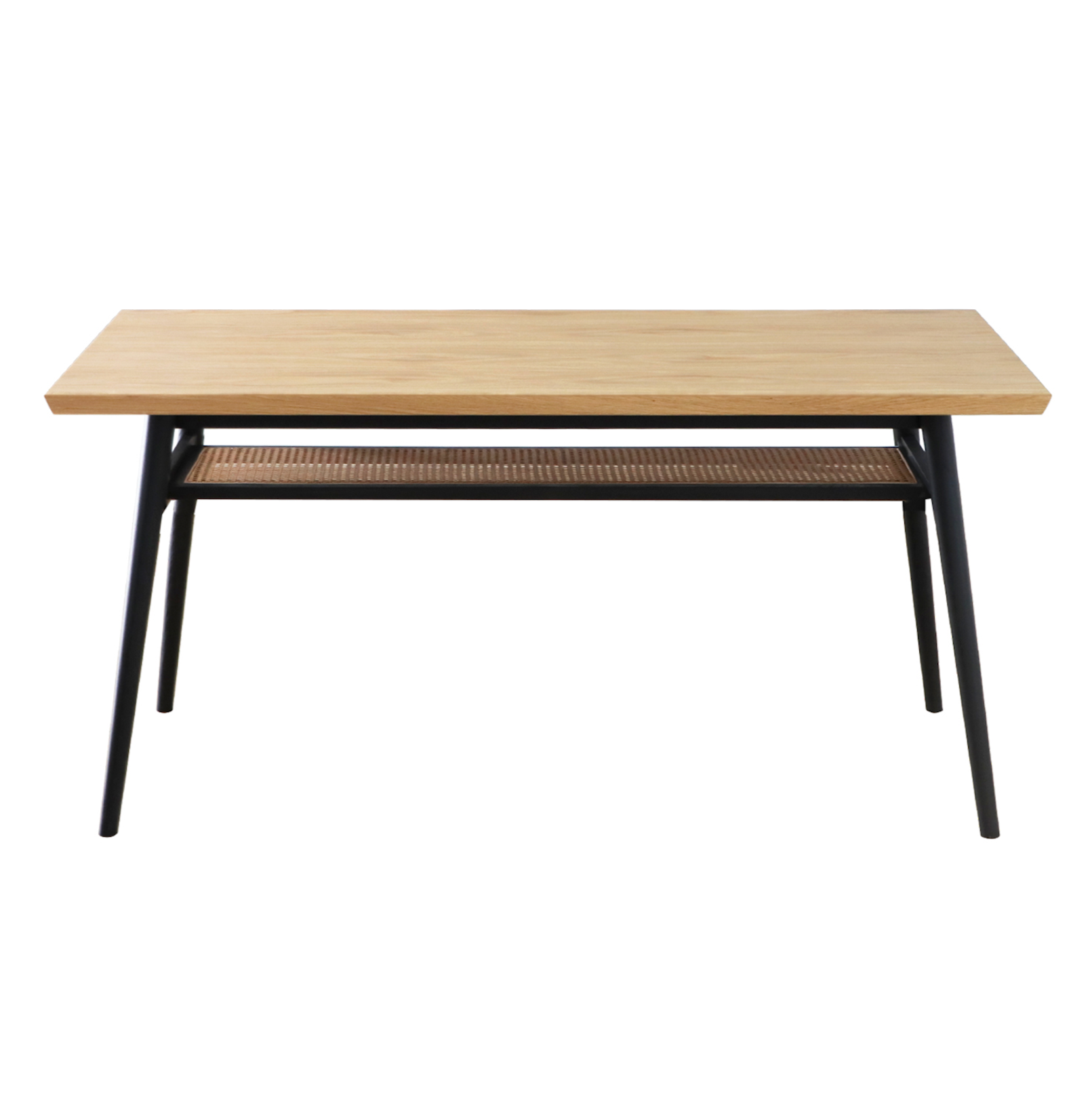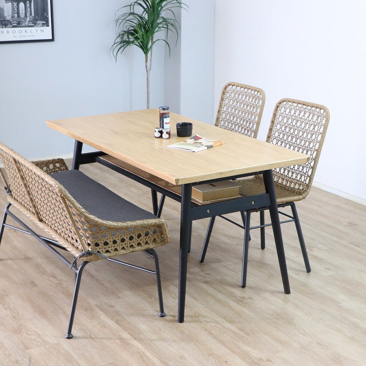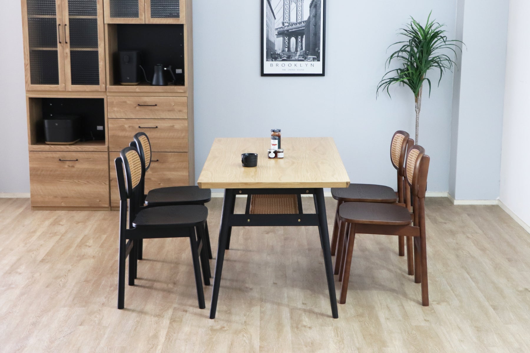 オーク突板の美しい木目と隙間から見えるラタンが絶妙に映えるダイニングテーブルです。広いお部屋やワンルームなどお部屋の広さを選ばず置いていただけます。4人で囲む団欒にぴったりのサイズ感です。
