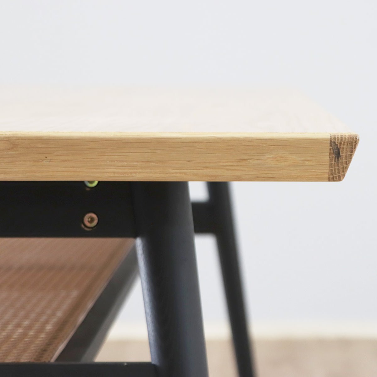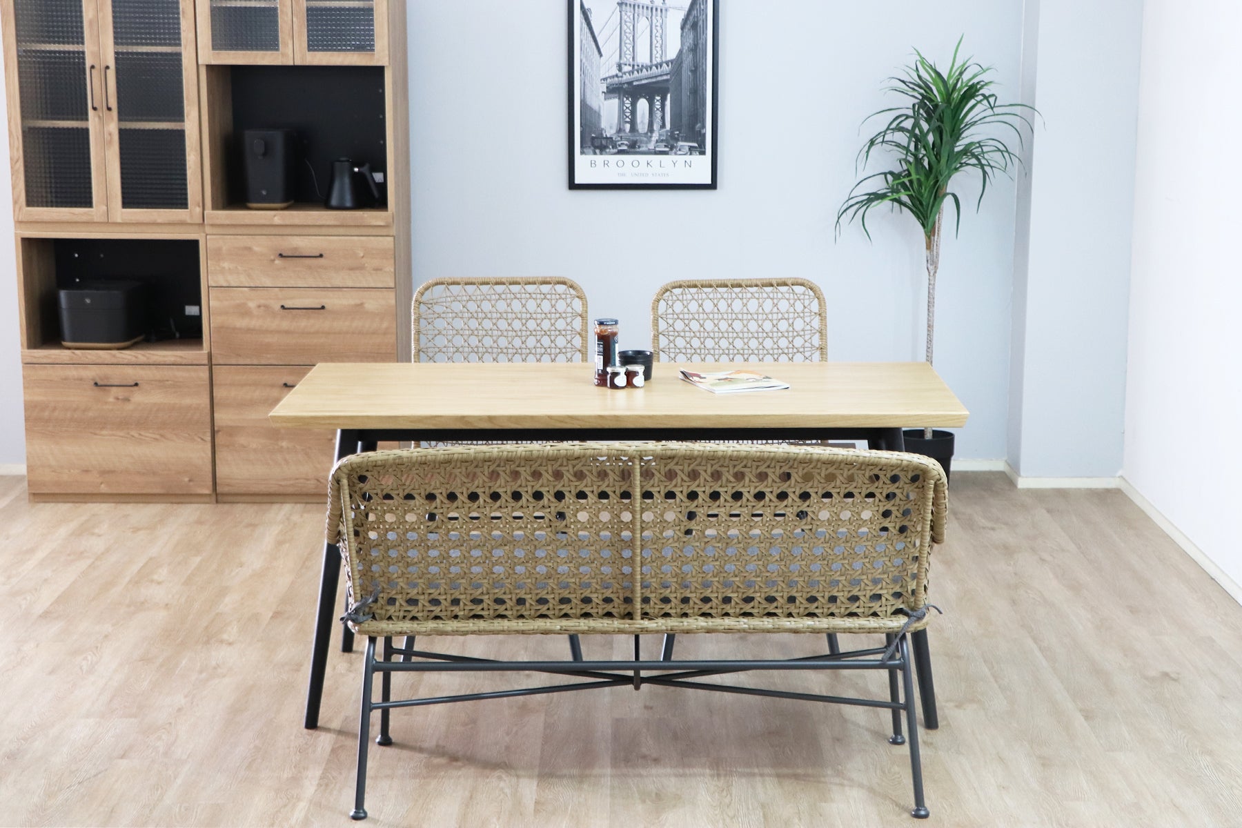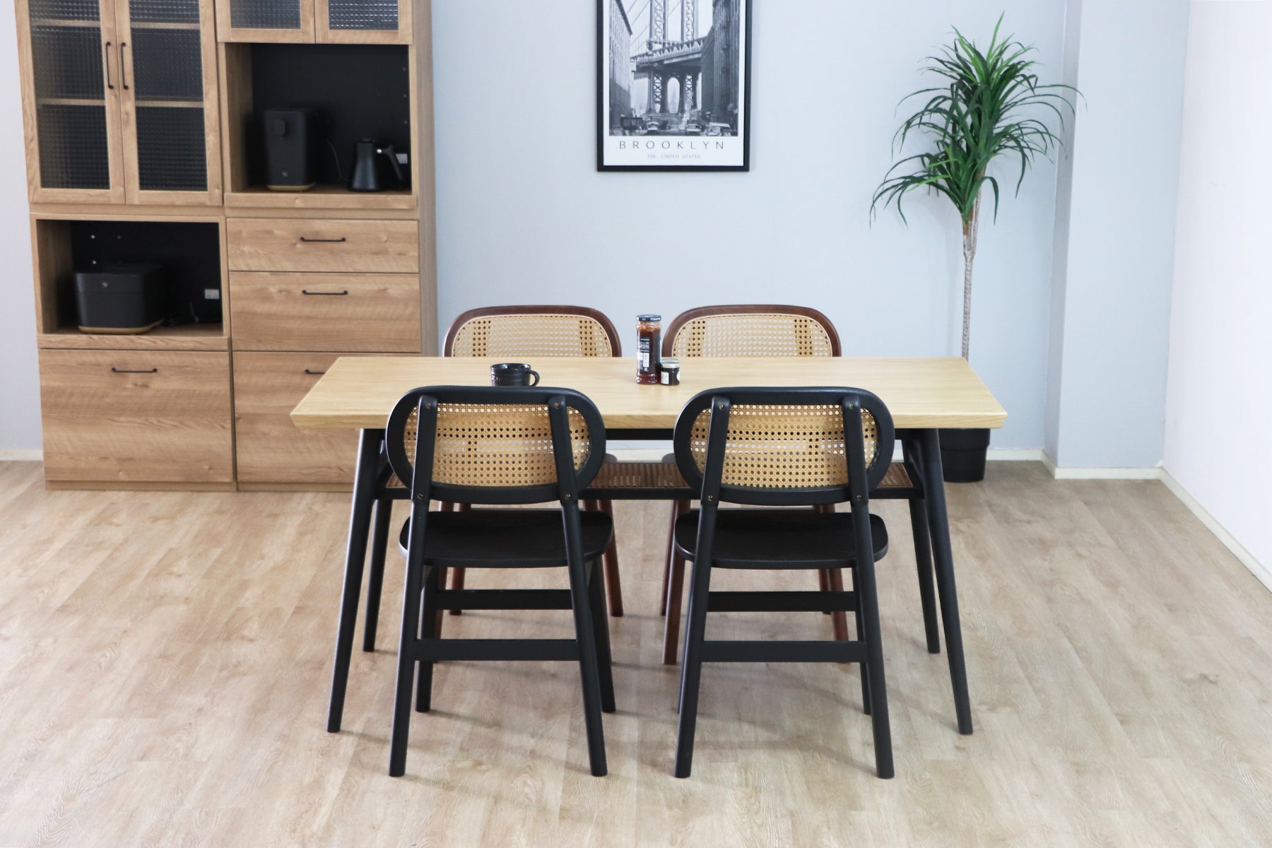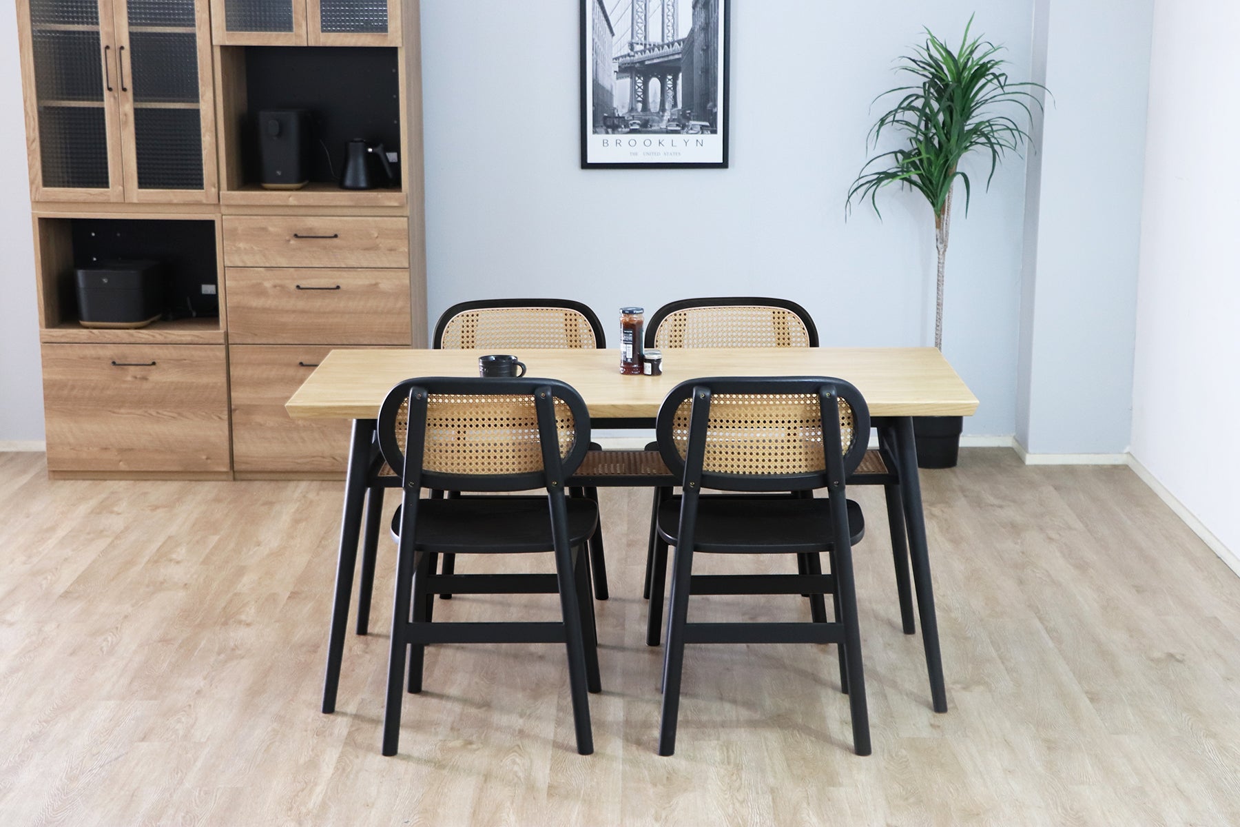 オーク突板の美しい木目と隙間から見えるラタンが絶妙に映えるダイニングテーブルです。広いお部屋やワンルームなどお部屋の広さを選ばず置いていただけます。4人で囲む団欒にぴったりのサイズ感です。