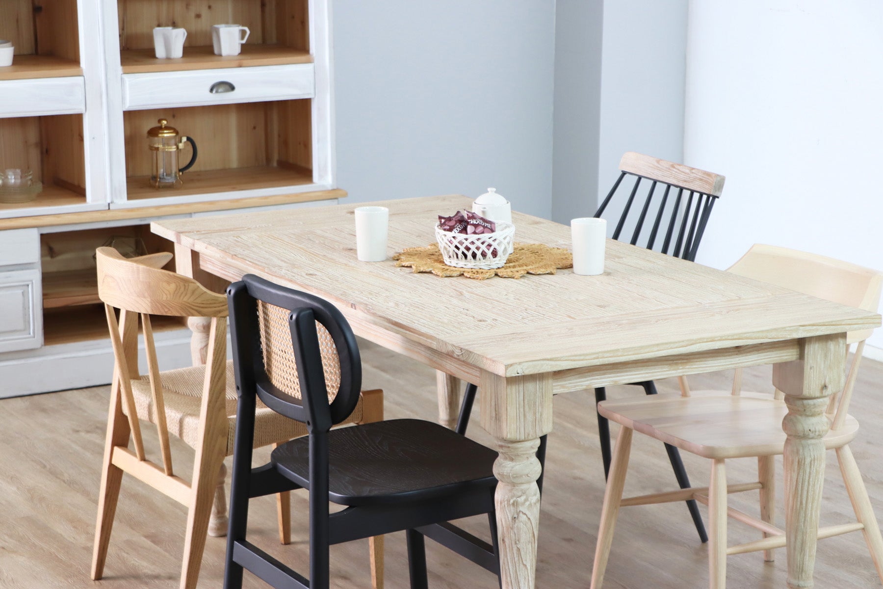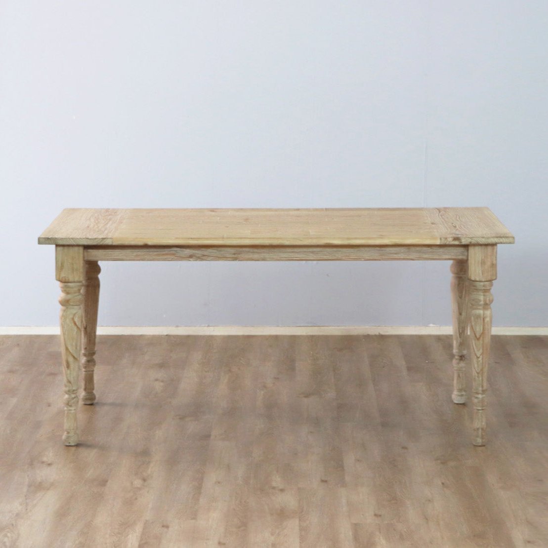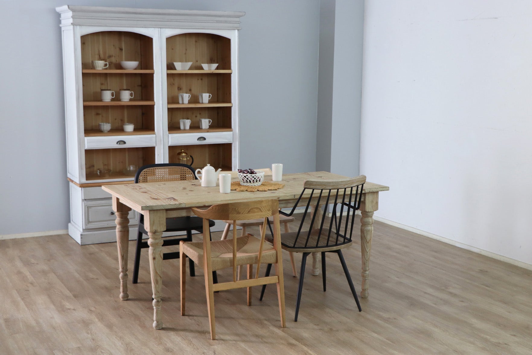 ヘビーさとフレンチカントリーの可愛らしさを融合させた新しいダイニングテーブルです。ゴツく重い印象に女性らしさをプラスした新シリーズのアイテムです。フレンチカントリーな色合いと脚の形状に、シャビーな質感がマッチした、特別感のある一品です。食卓を華やかにする木目の質感に愛着がわきます。