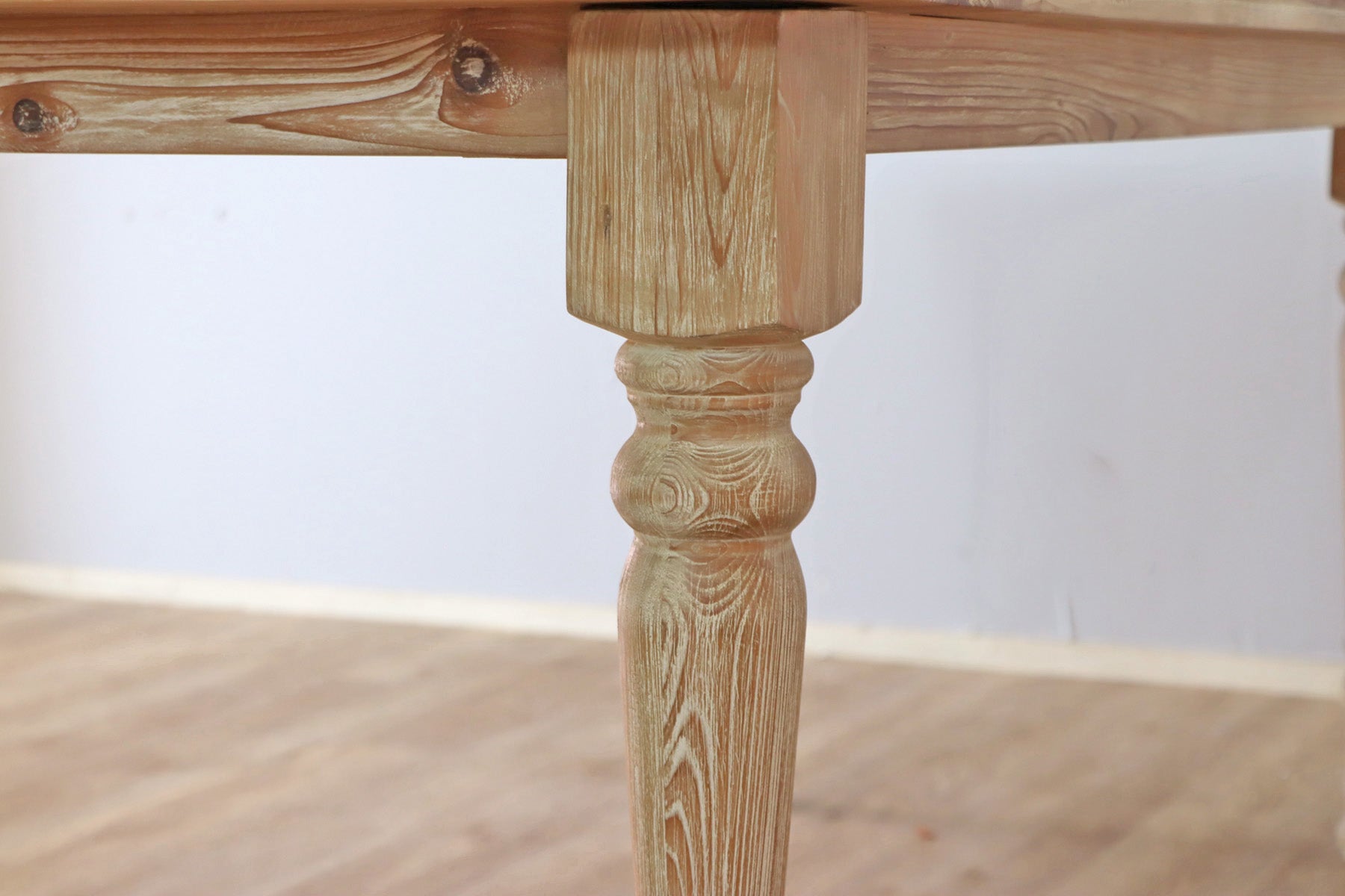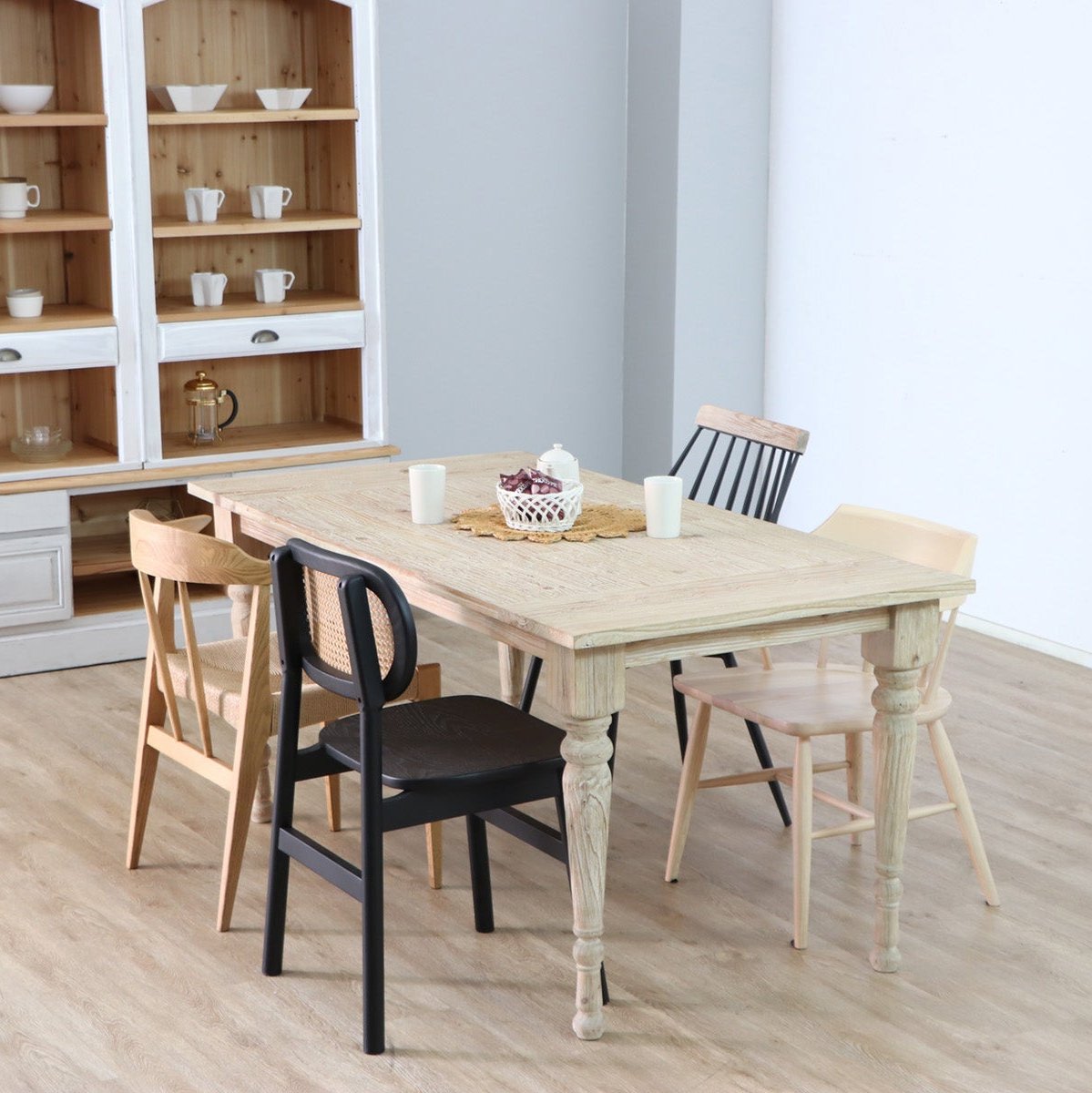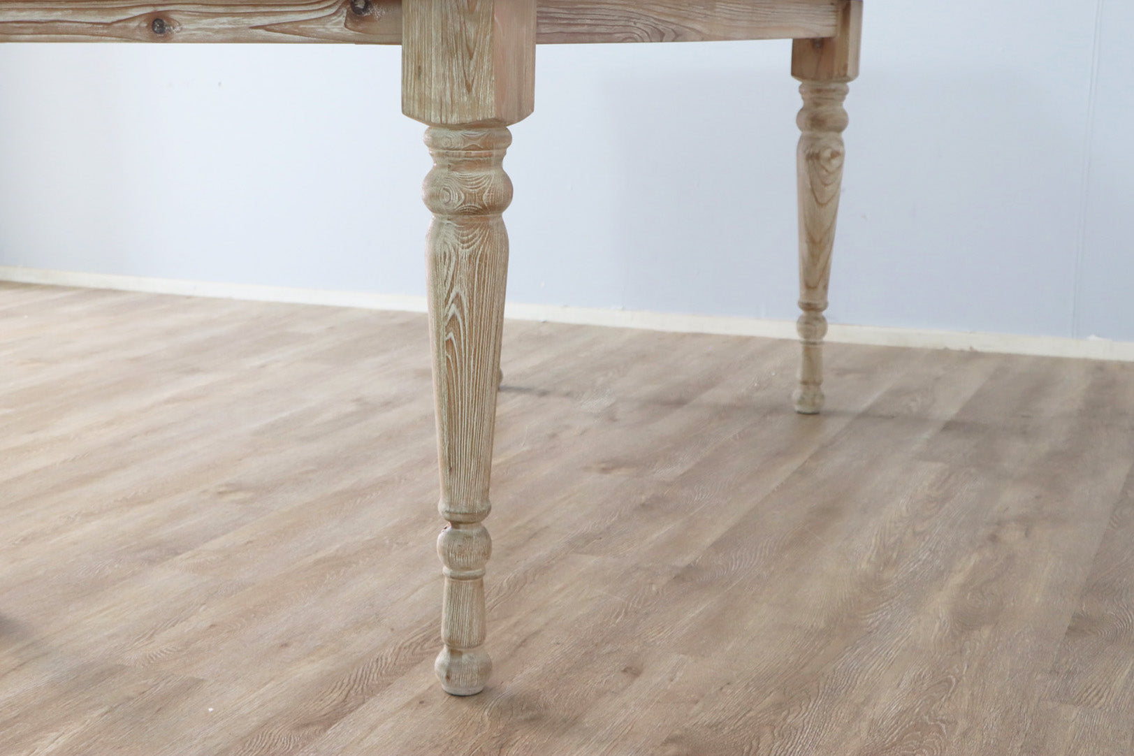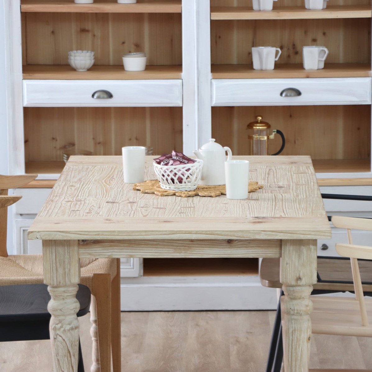 ヘビーさとフレンチカントリーの可愛らしさを融合させた新しいダイニングテーブルです。ゴツく重い印象に女性らしさをプラスした新シリーズのアイテムです。フレンチカントリーな色合いと脚の形状に、シャビーな質感がマッチした、特別感のある一品です。食卓を華やかにする木目の質感に愛着がわきます。