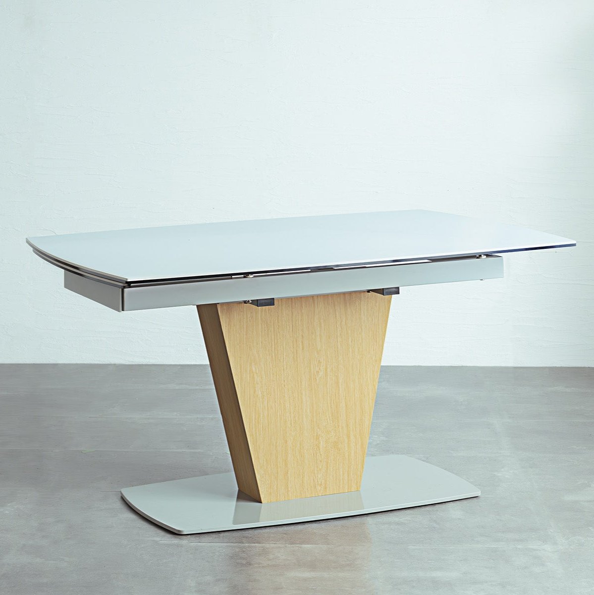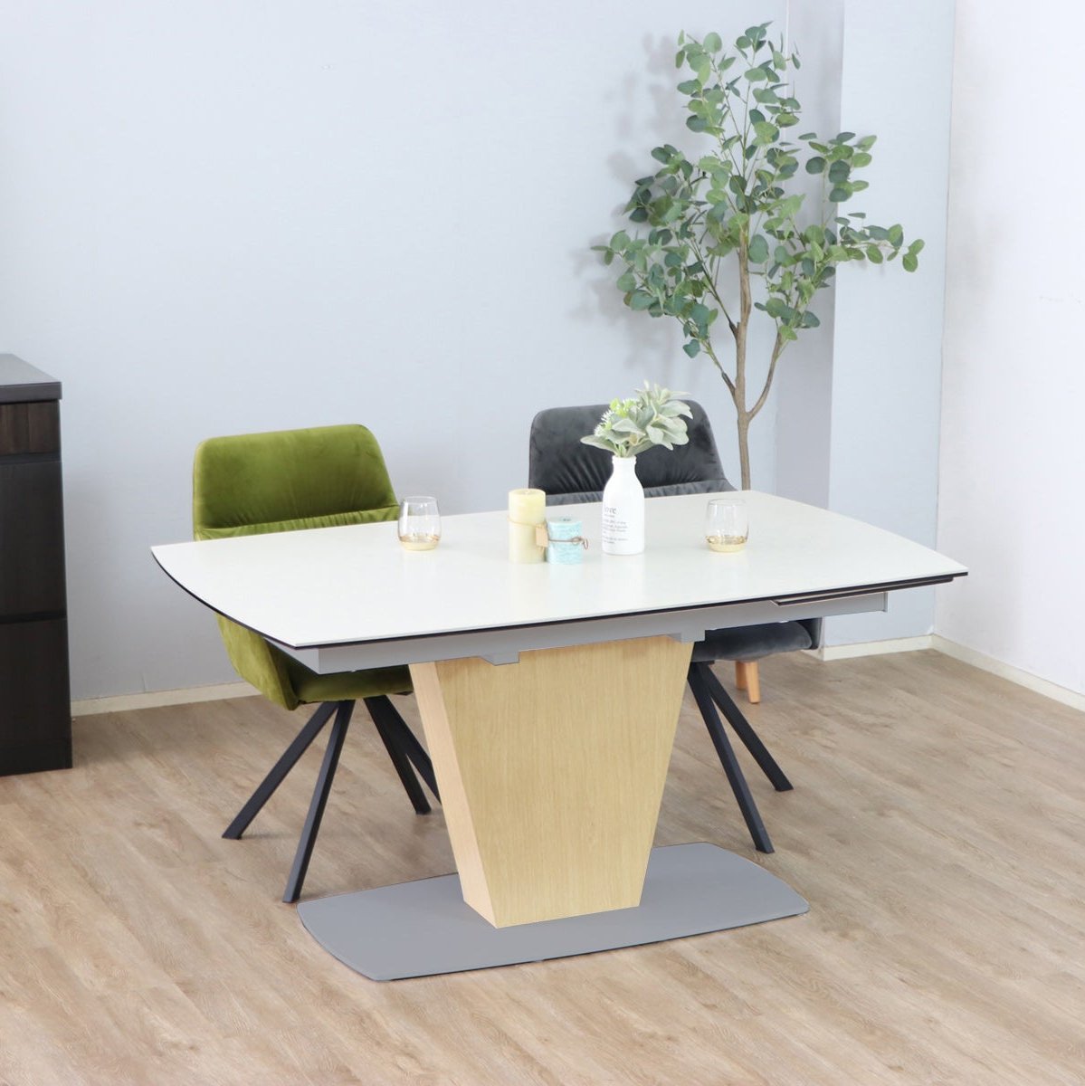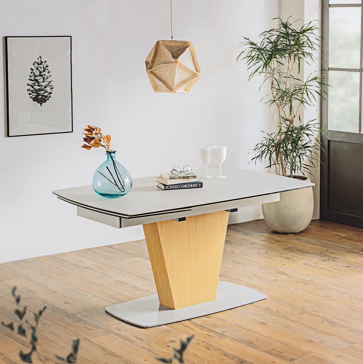 一本脚で片側伸長のセラミックダイニングテーブルです。1本脚テーブルでさらに片側が伸長するので急な来客にも、家族が増えても対応可能です。片側慎重なので壁付けで配置しても問題ありません。さらに清潔と頑丈さを兼ね備えたセラミックテーブルは近年のトレンドとなっています。