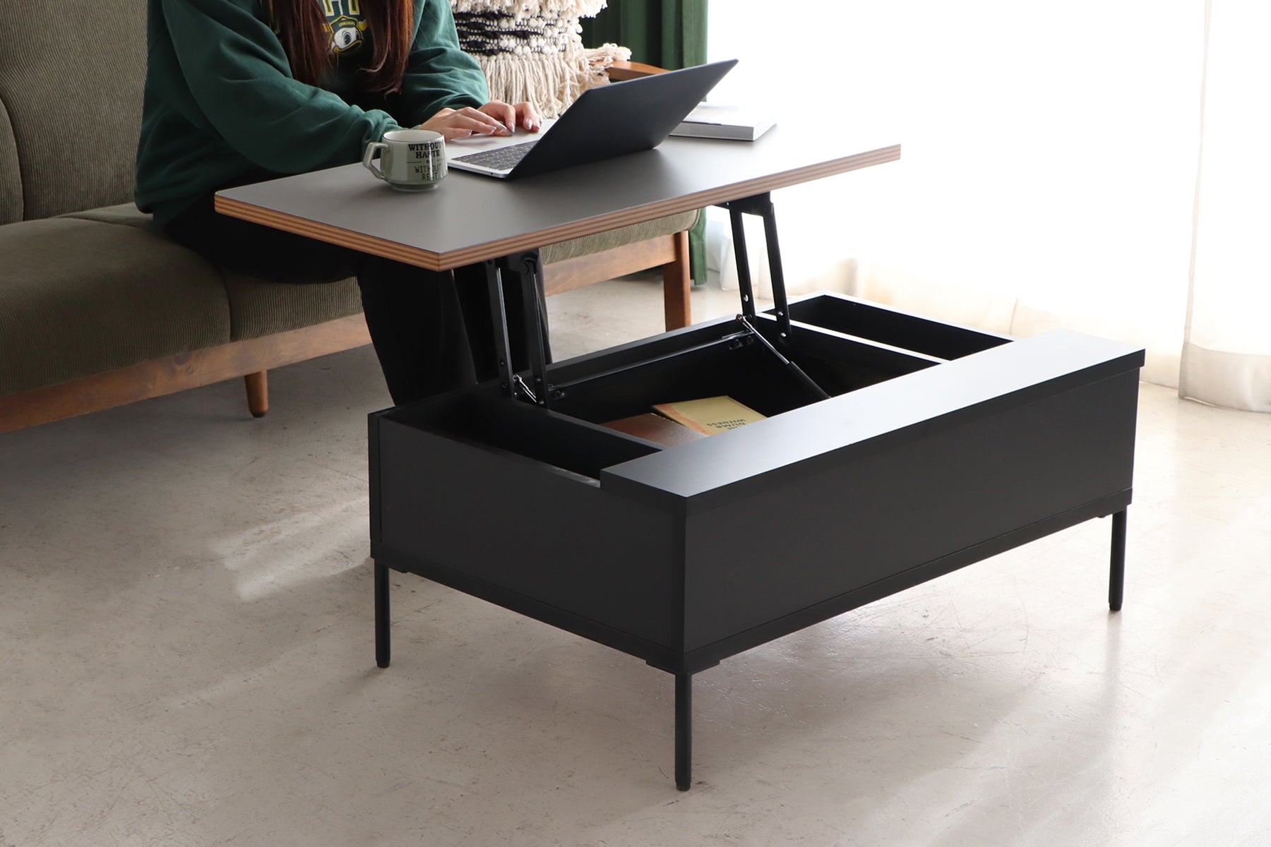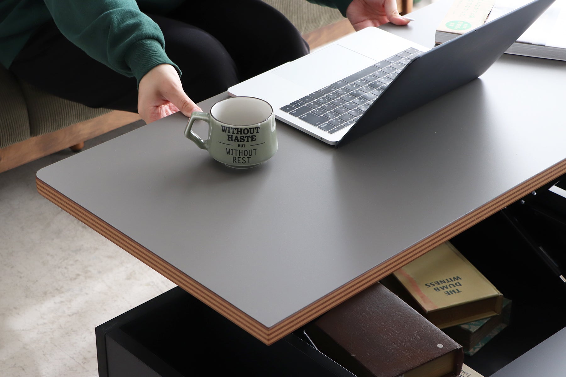 モダンな雰囲気から想像を超える機能性を備えたリモートワークに最適解な2WAYテーブルです。ローテーブルやデスクトして活用可能で、天板下には収納スペースもあります。中の大収納にパソコンを入れておくとリビングですぐに仕事に取り掛かることが可能です。