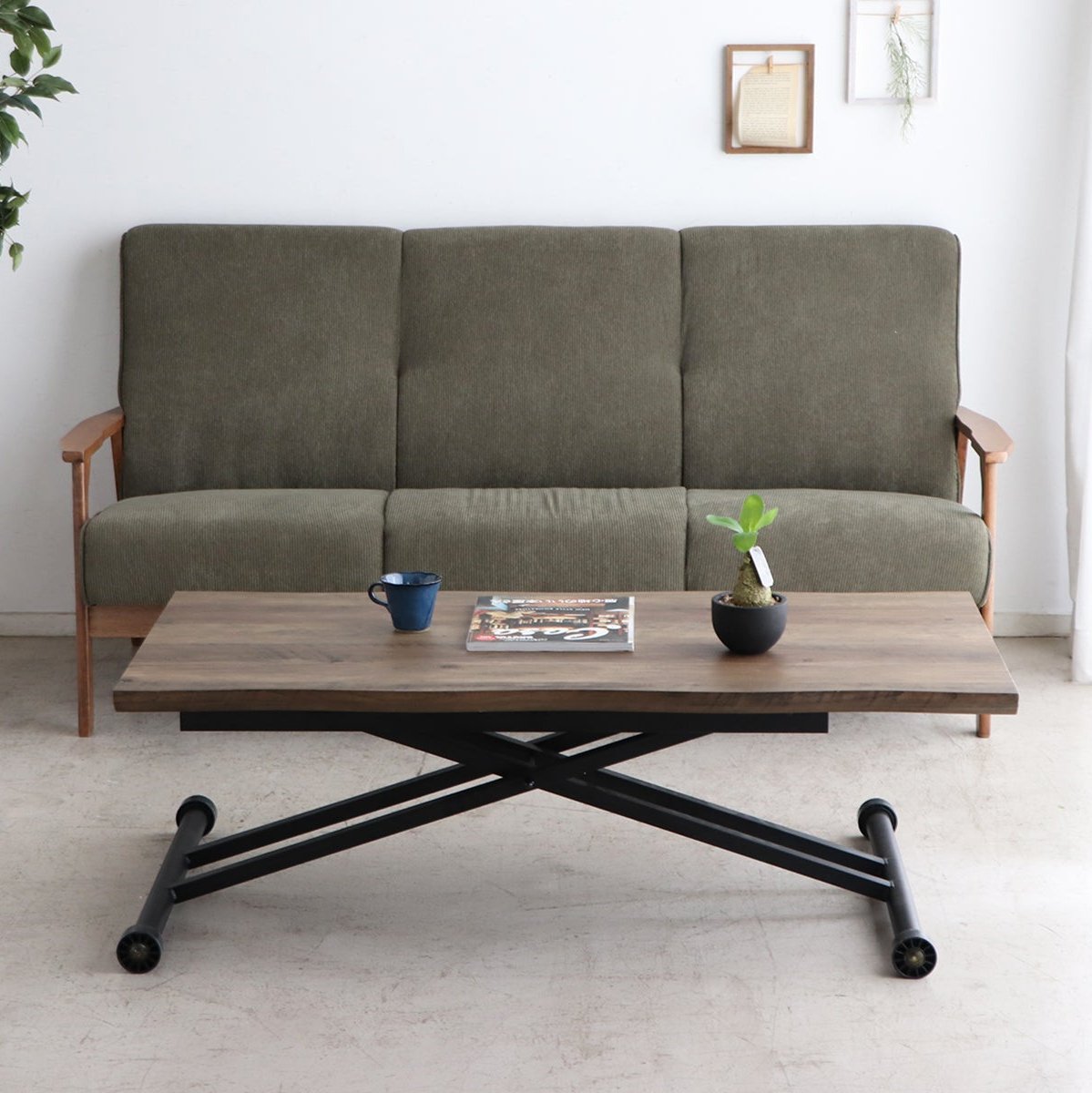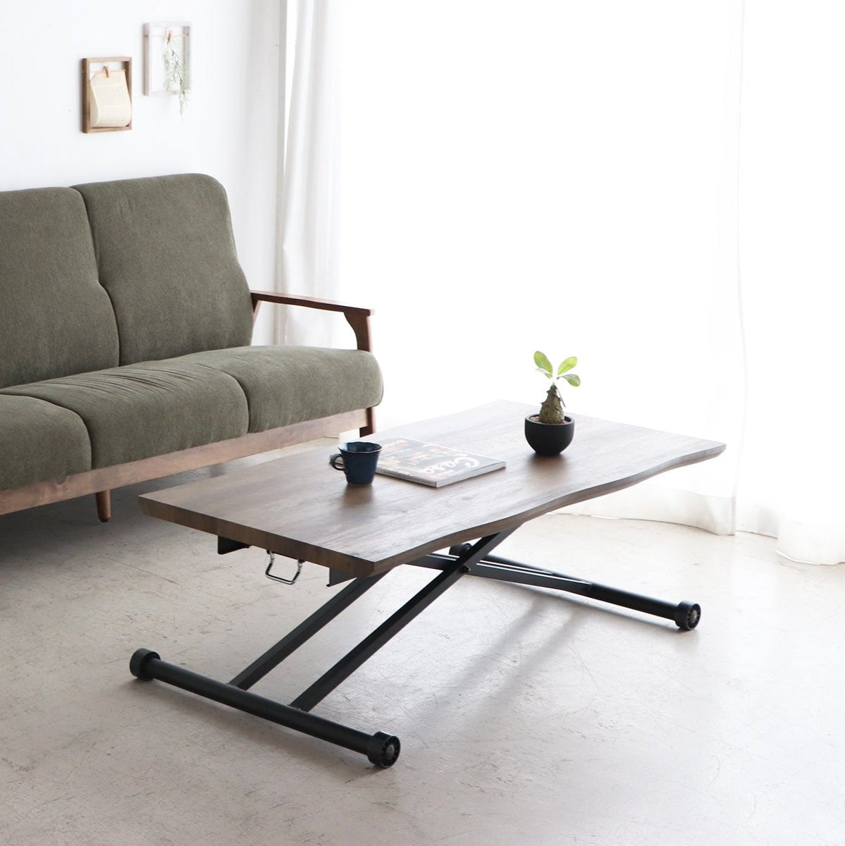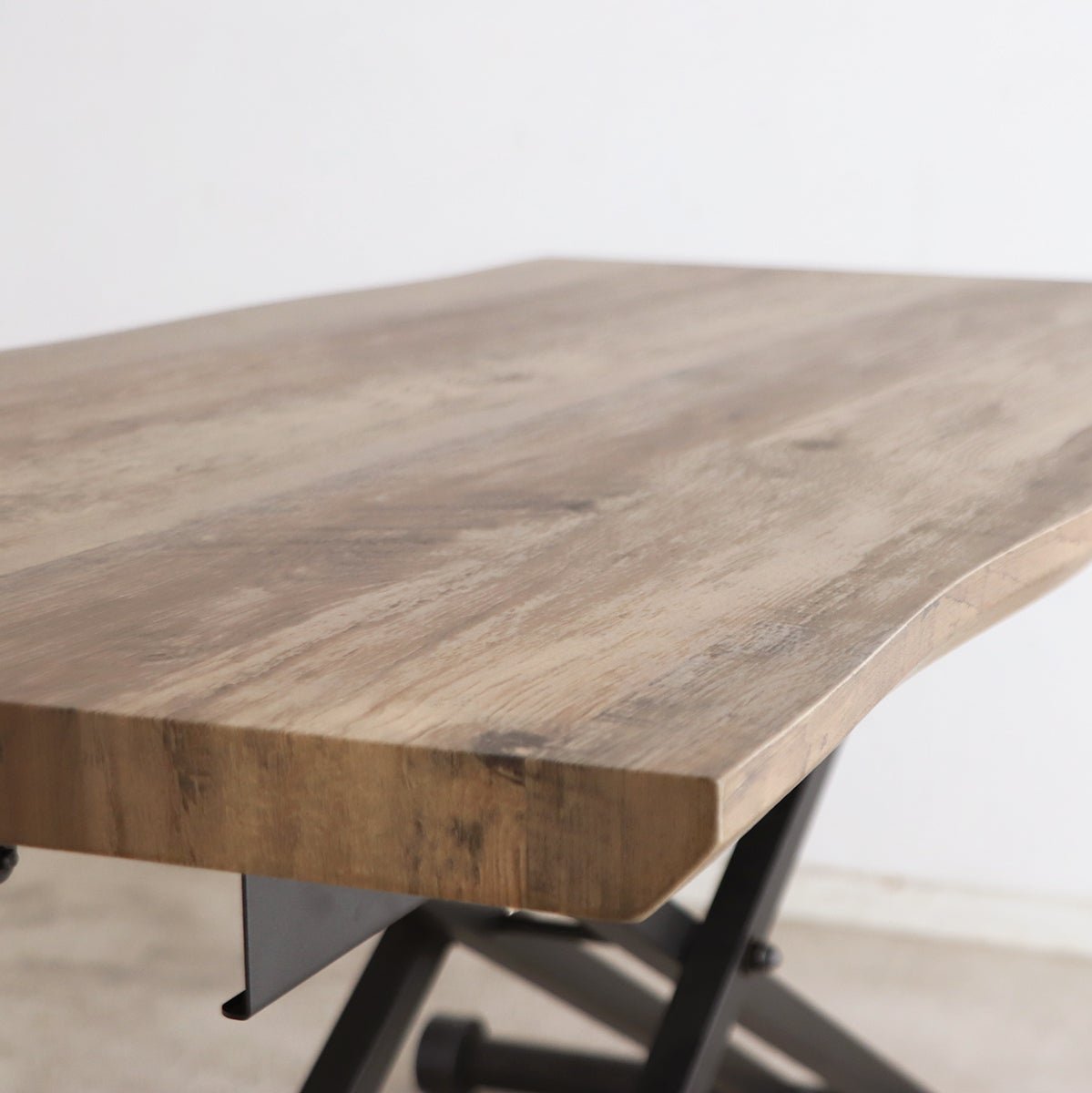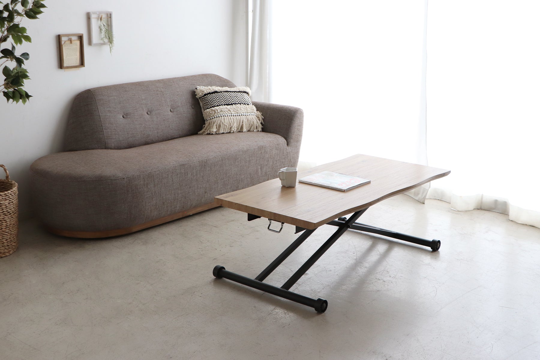 まるで本物の一枚板に見えるリアルシートを使った天板に、波打った小口がリアルで高見えするテーブルです。昇降機能も付いているのでさまざまな使い方が可能です。