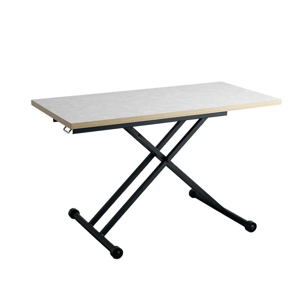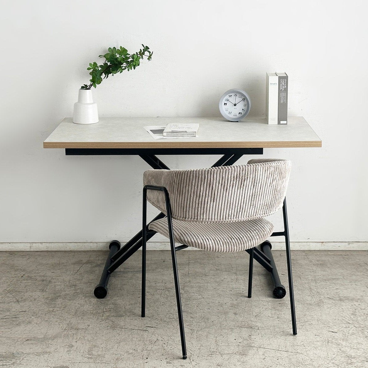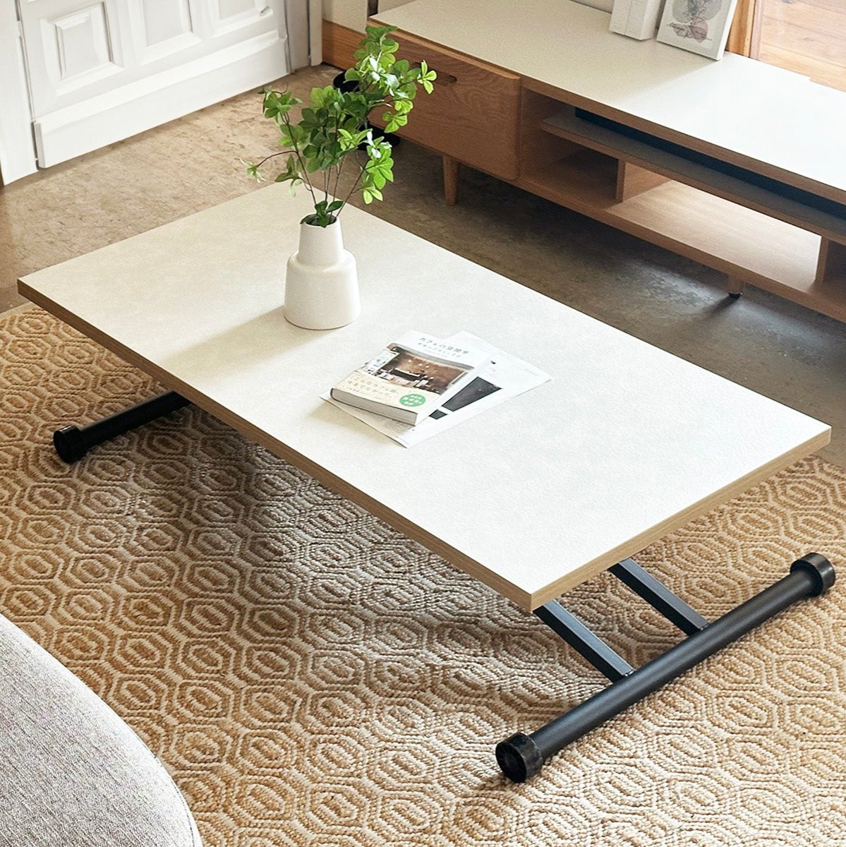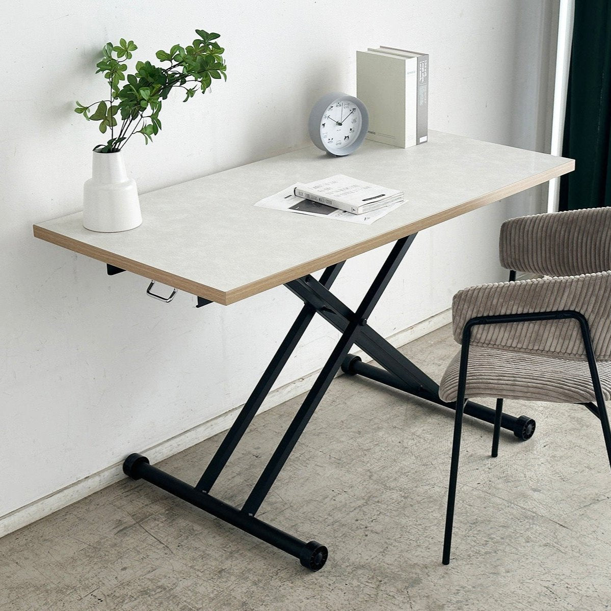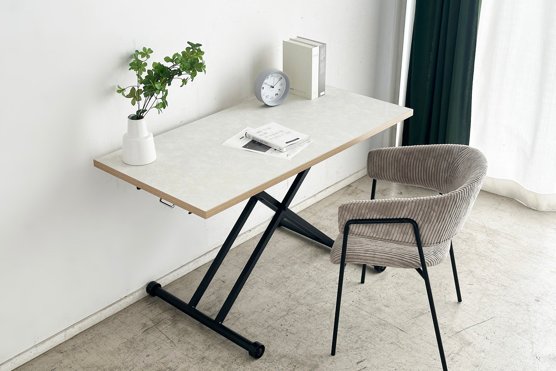 新素材のダップ天版を使った昇降テーブルです。アクセントの小口の木目がおしゃれさを演出しています。昇降するので使う場面もフレキシブルに活用できます。