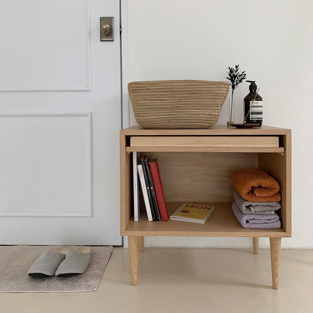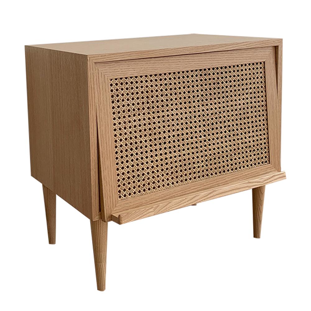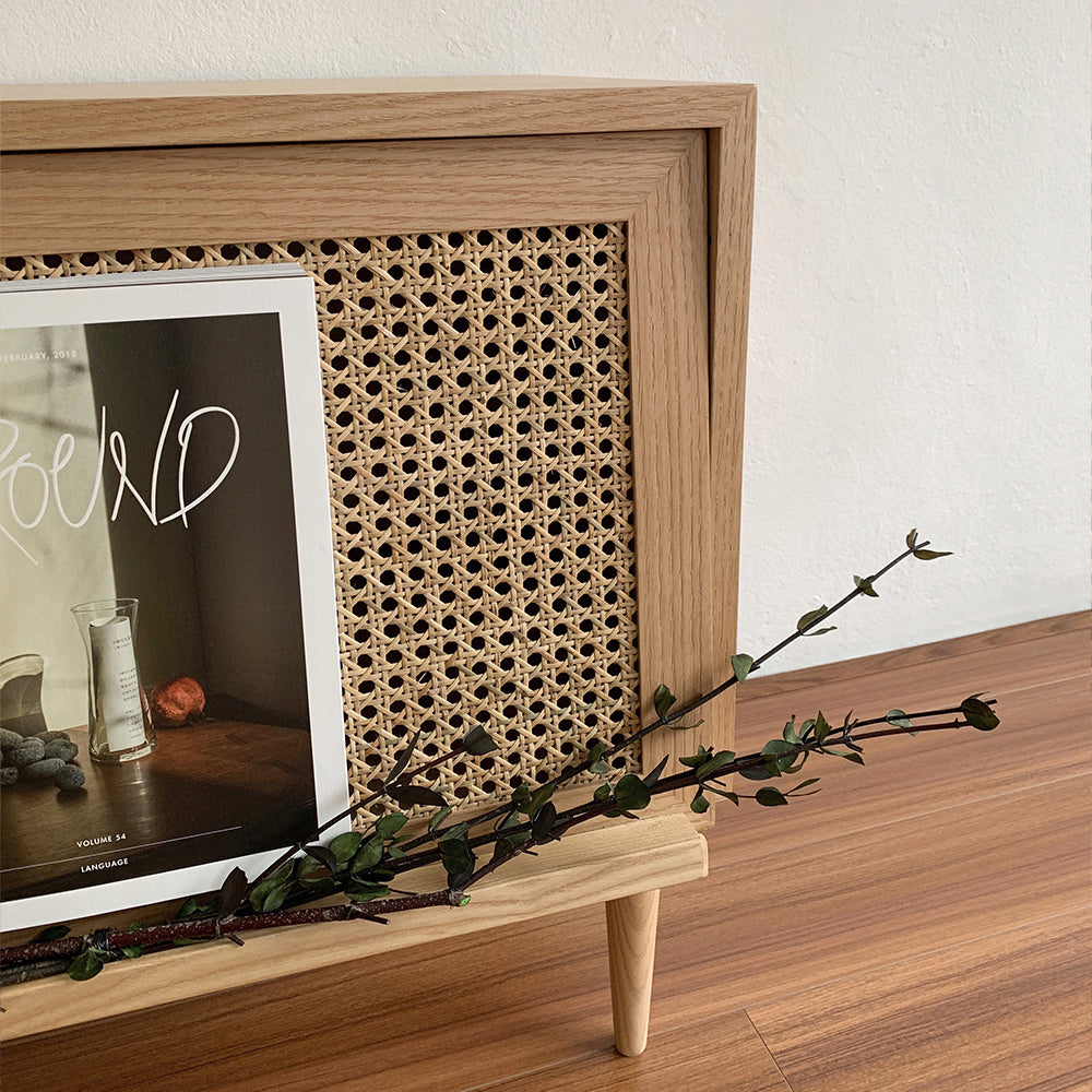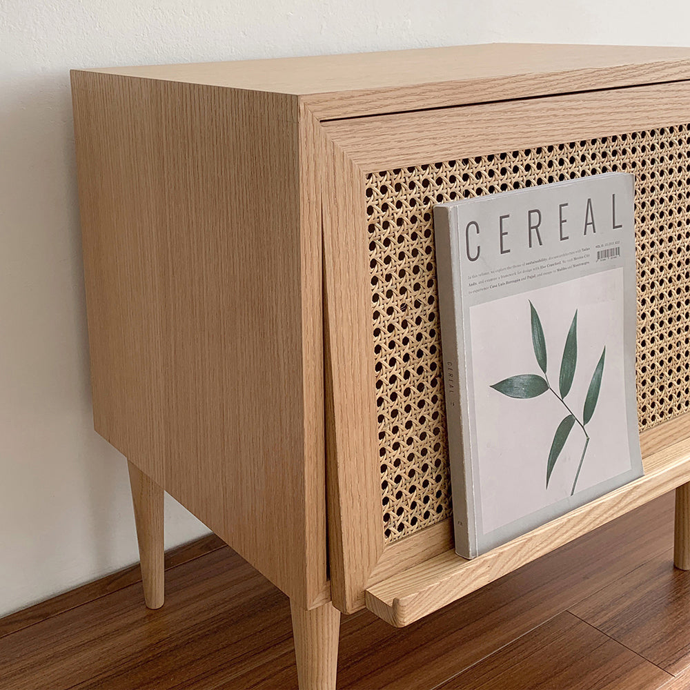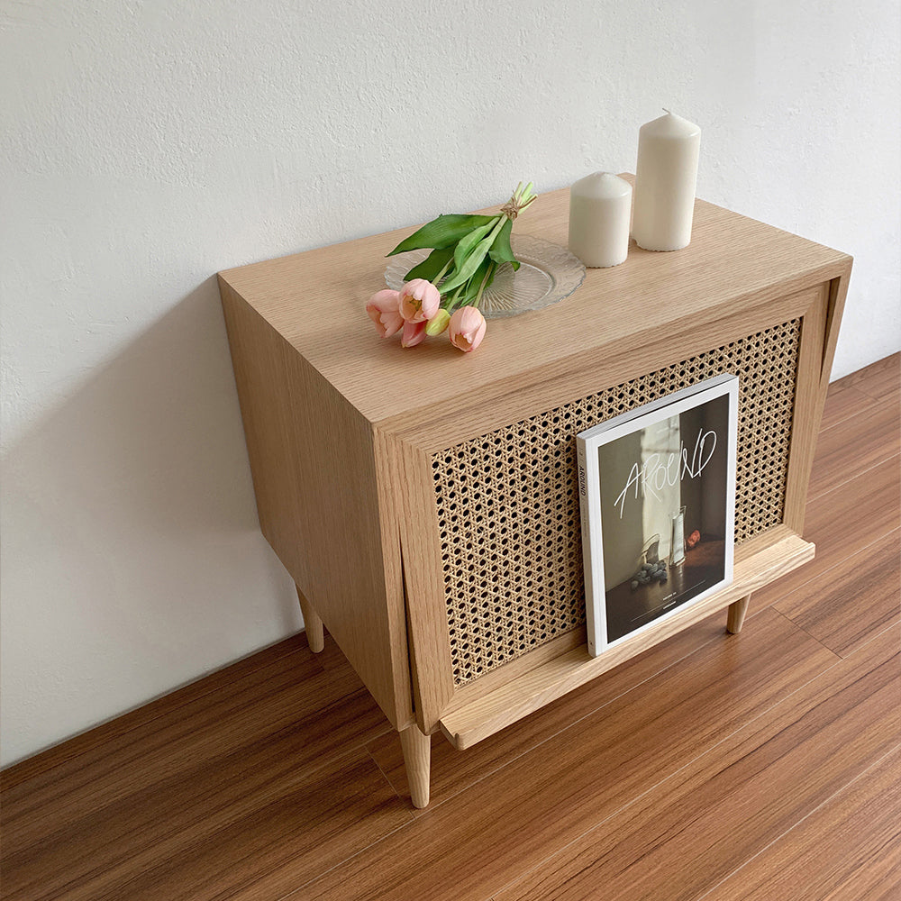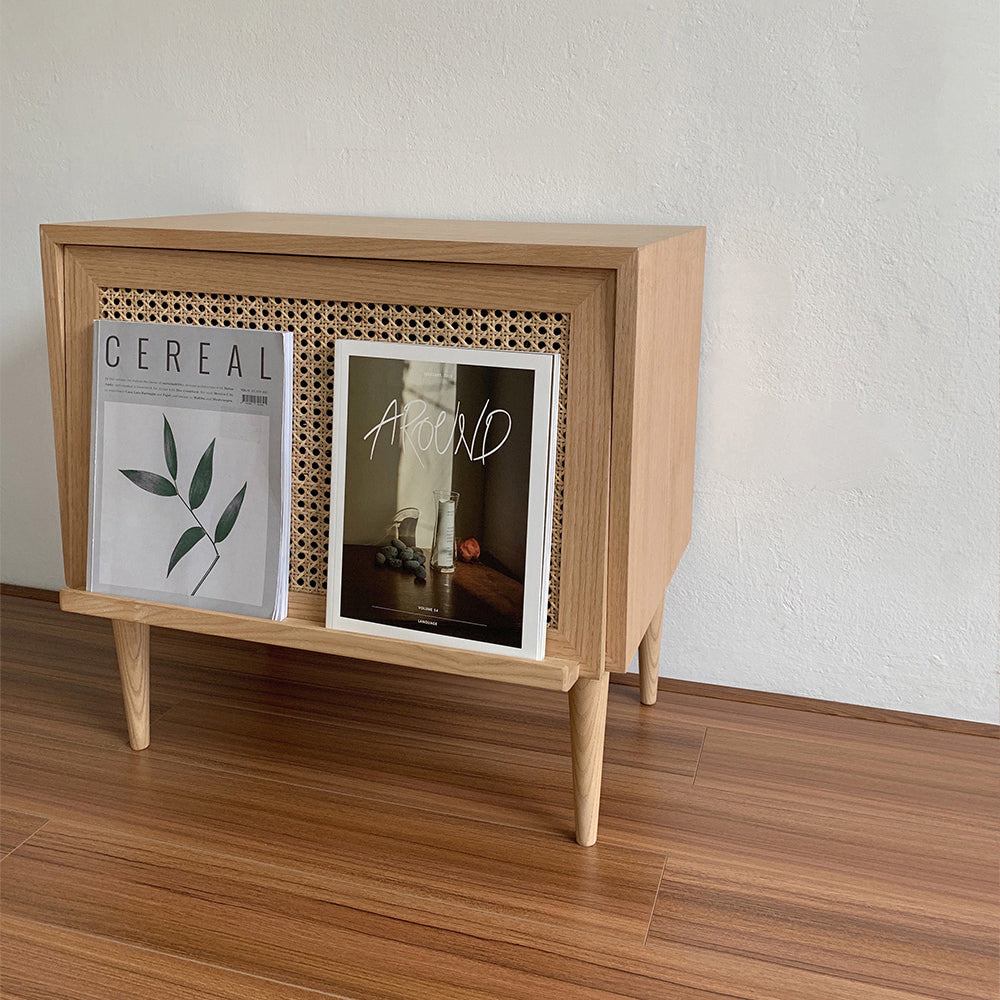 VAMIR ケーンマガジンラック サイドテーブルは、天然素材とスライド式ドアで雑誌を美しく収納です。リビングや玄関に温もりを添える実用的なサイド家具です。