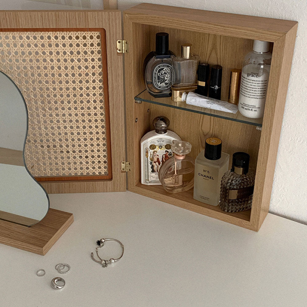 香水や小物を美しく収納でき、壁掛けもできるスリム設計で、空間にさりげない上品さを添えるVAMIRの整理ボックスです。