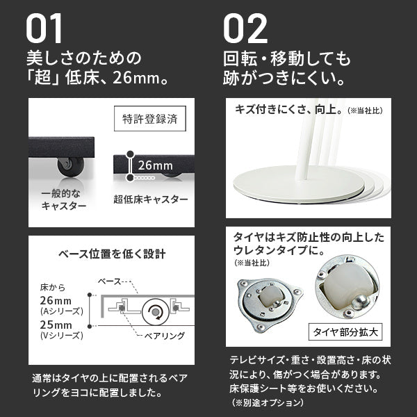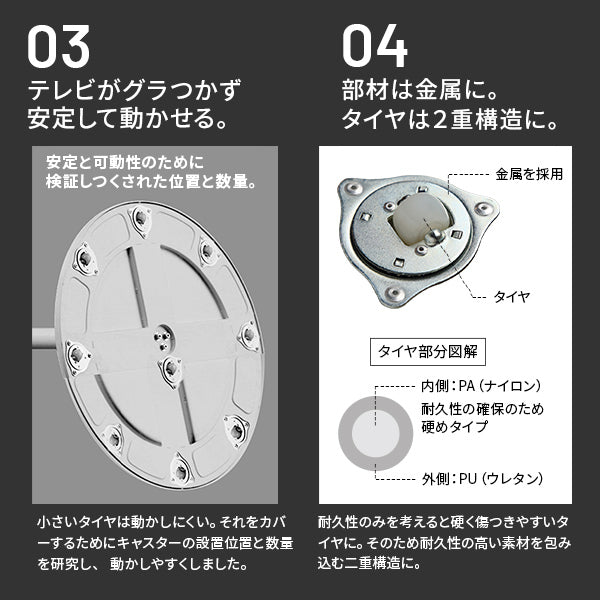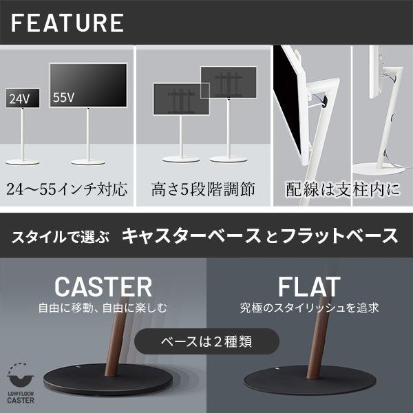 使いたい場所、見たい場所に移動できるテレビスタンドです。力をかけずに自在に移動や回転が可能なので、お部屋のあらゆる場所に設定できます。高さは5段階調節で見やすい高さに、震度7まで耐震試験をクリアしています。