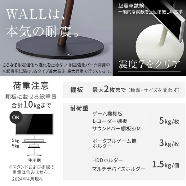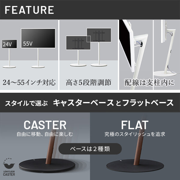 使いたい場所、見たい場所に移動できるテレビスタンドです。力をかけずに自在に移動や回転が可能なので、お部屋のあらゆる場所に設定できます。高さは5段階調節で見やすい高さに、震度7まで耐震試験をクリアしています。