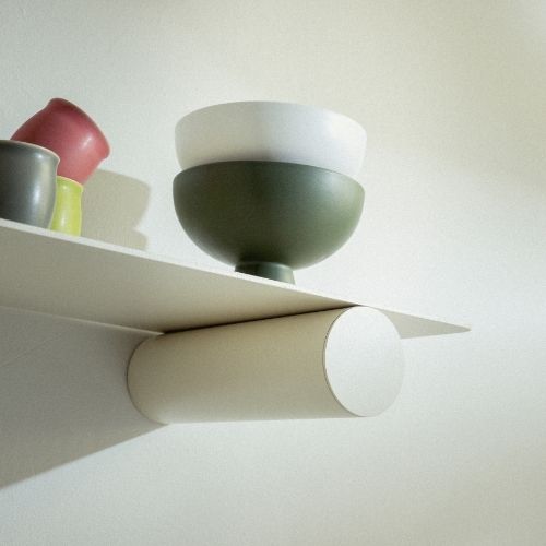 線と円という2つの基本的な幾何学形状を用いたデザインが特徴的なウォールシェルフです。各オブジェクトは平らなアルミニウムプレートとボリュームのあるチューブを組み合わせて作られています。