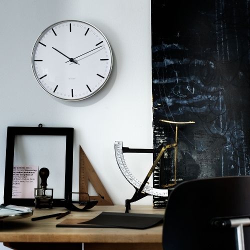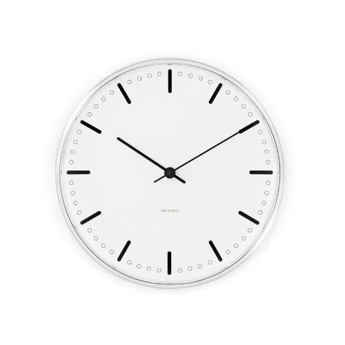 20世紀を代表する北欧デンマークの建築家・デザイナー、ARNE JACOBSEN(アルネ・ヤコブセン)が、自然の中に溶け込んだ直線的な建物との絶妙なコントラストが美しいルードブレ市庁舎を設計した際に手掛けたウォールクロックです。磨き抜かれたポリッシュケースと、50年代らしい一切の無駄を排除した緻密でミニマリズムを有するクールなデザインが、モダニズムを代表した作品となっています。