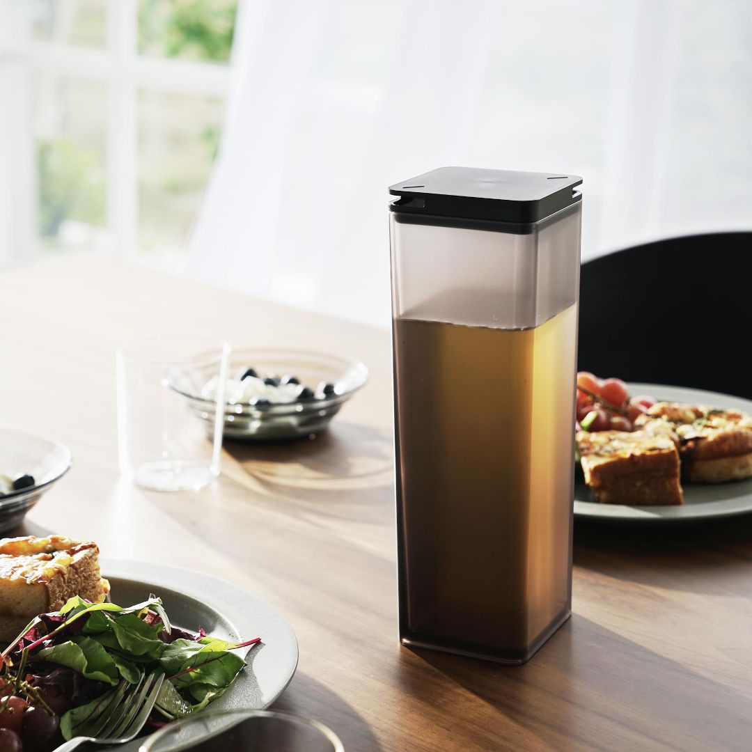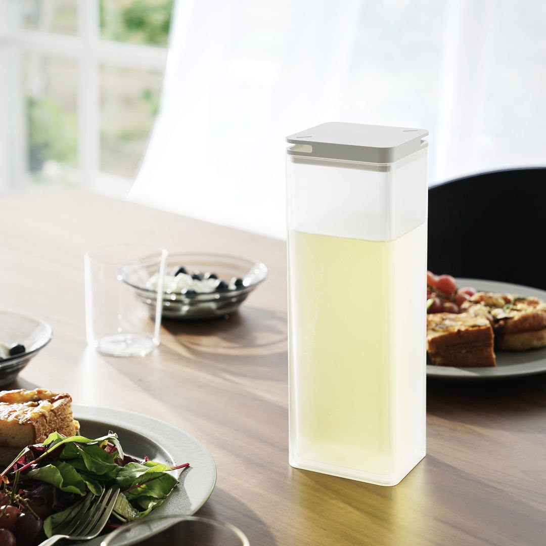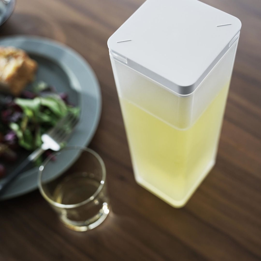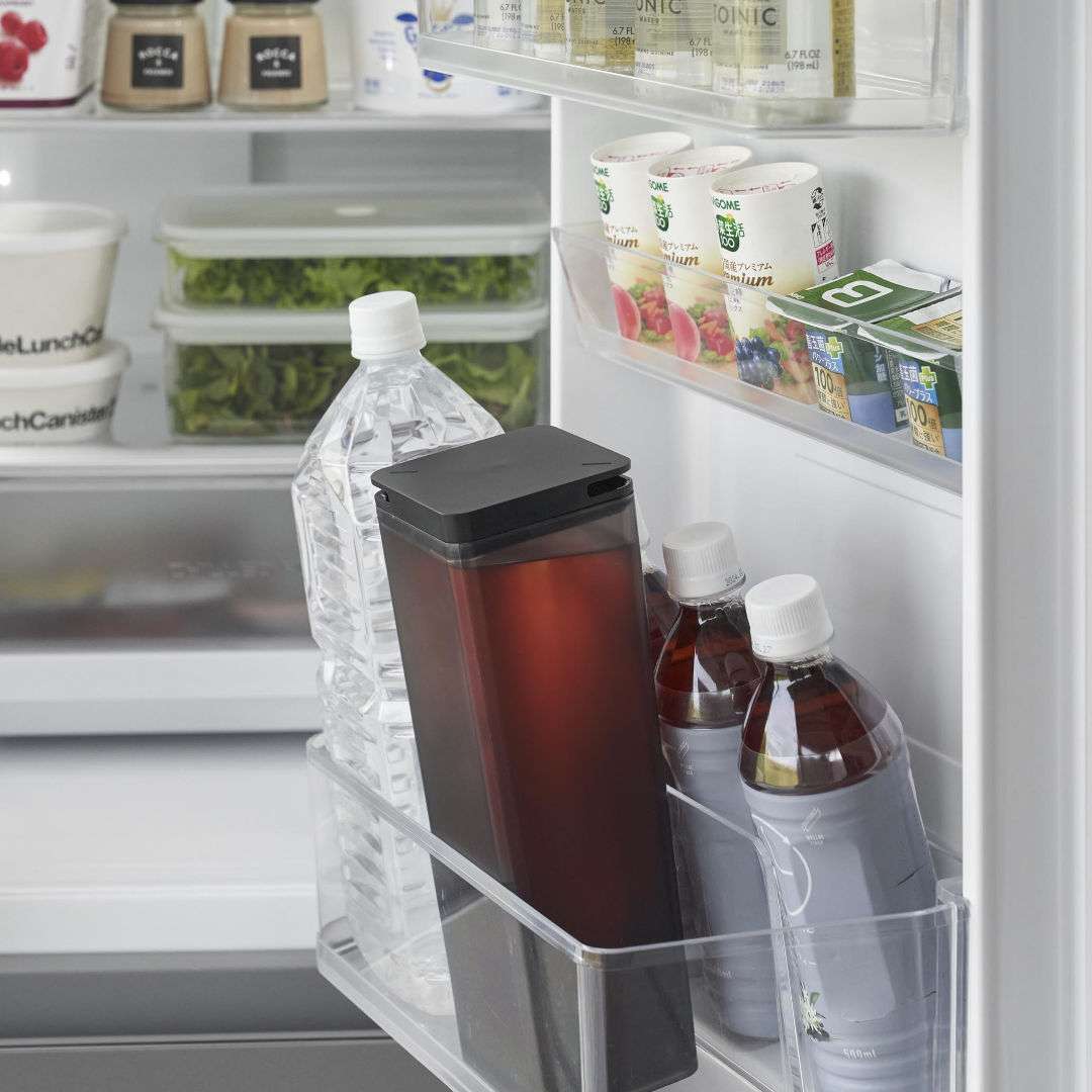 どこからでも注げる、くるっと便利な両口設計実は対角に注ぎ口があるので手に取ったらそのまま注げてとってもスムーズ。さりげないフタのデザインで注ぎ口が感覚的にわかります。空間になじむ、シンプルな2色のカラーカラーは、スタイリッシュなホワイトとブラックをご用意。四角いフォルムで半透明なボディは、おしゃれなだけじゃなく残量が一目でわかります。ドアポケットにすっぽり収まるスリムボディ無駄をそぎ落とした角型の冷水筒はドアポケットにスッキリ収まります。パーツは3つのみで食洗機OK。お手入れもカンタンです。水はねガードで冷蔵庫もキレイをキープドアの開け閉めでドリンクが飛び出さないように、水はね防止フィルターがついてるのが新しい。うっかり冷蔵庫を汚してしまうことを防げます。1.2Lのちょうどいいサイズ 毎日の水分補給にぴったり。一人暮らしからファミリーまで使いやすい1.2Lサイズ。麦茶、緑茶、水出しコーヒー等、ドリンクによって複数使いするのもおすすめです。