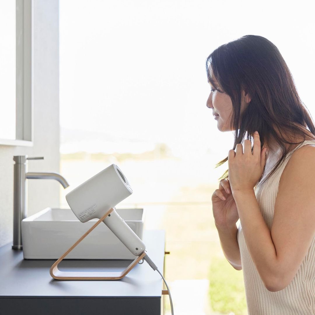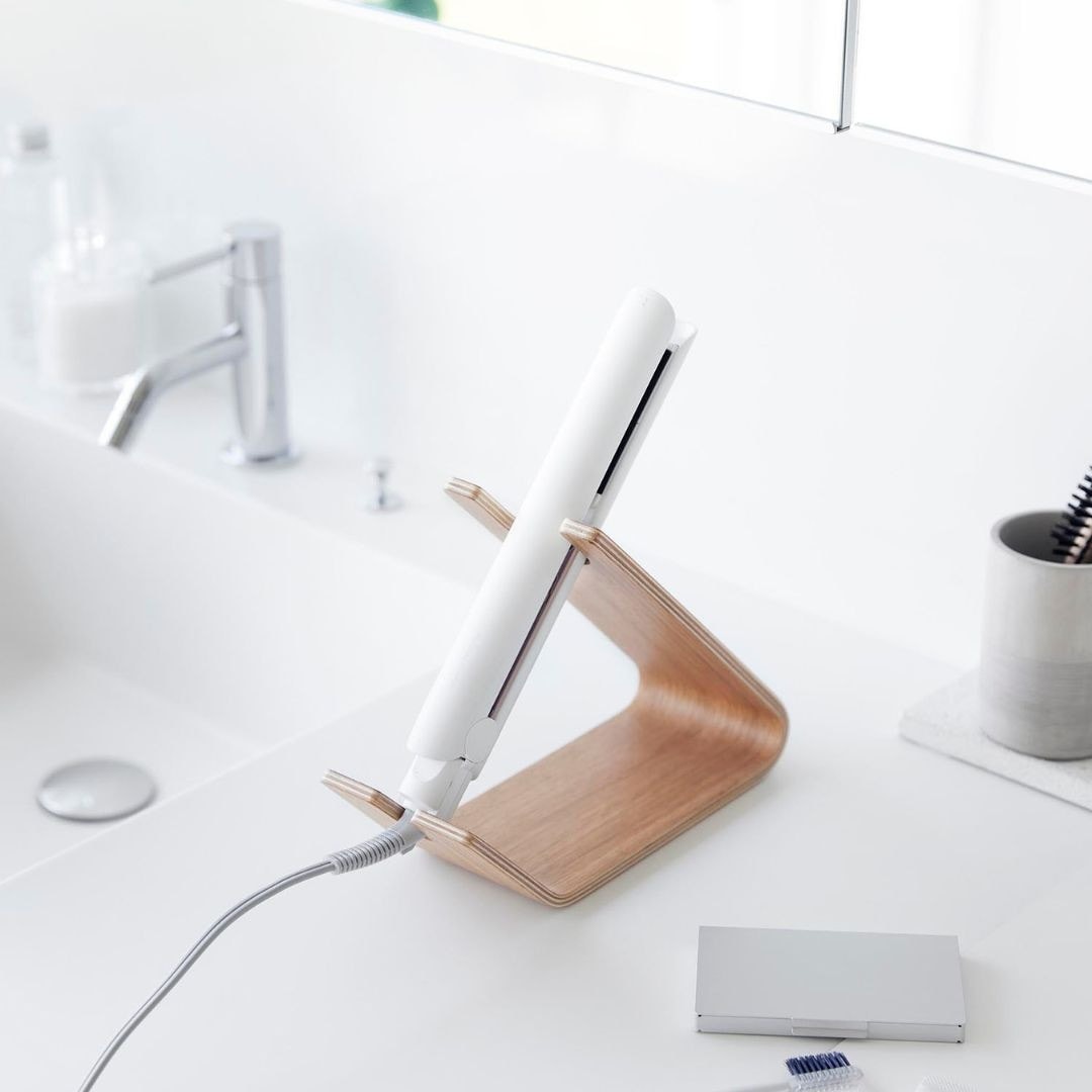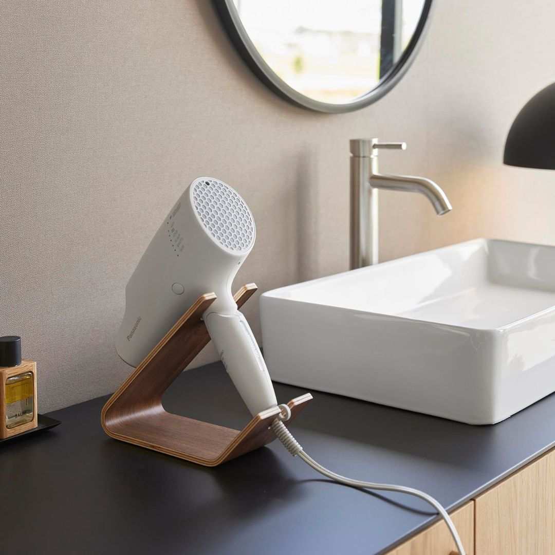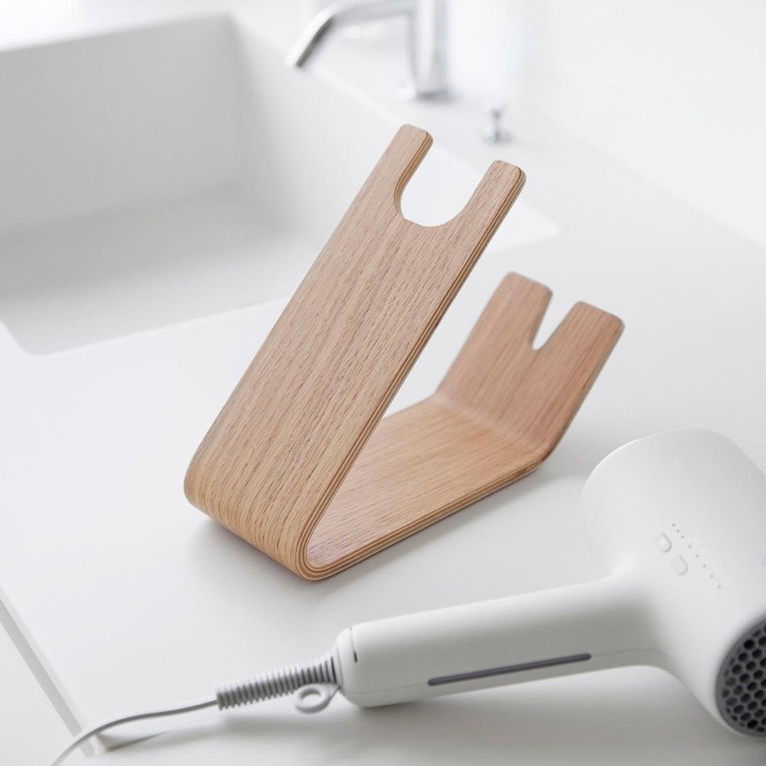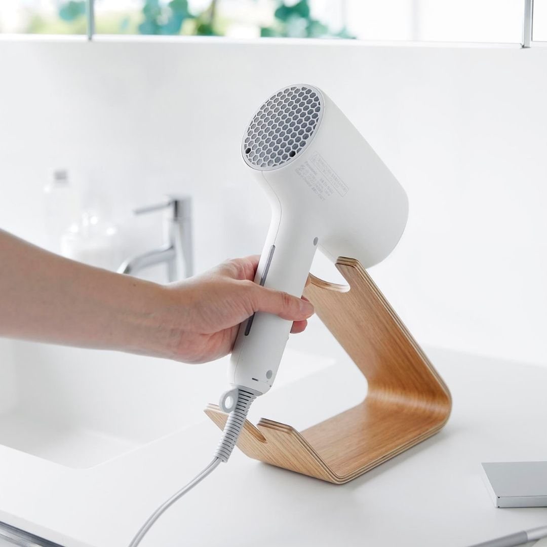 スタンドに置くだけ。 ホテルライクなドライヤー収納ドライヤーを立て掛けるだけの収納スタンドです。薄い天然木を何枚も重ねられたスタンドは木目模様が美しく、一枚板ではつくれない優美な曲線が魅力です。まとめるのに困っていた電源コードもスマートに収納できるから洗面所がすっきりと片付きます。洗面所に置きやすい、2色のカラーバリエーションカラーは、高級感のあるブラウン、明るい印象のナチュラルをご用意しました。木目調が映えるカラーリングです。洗面所の雰囲気やお持ちのドライヤーのお色味などに合わせてお好みのカラーをお選びください。ヘアアイロンも立て掛けられるドライヤーを斜めに安定して立て掛けられます。使いたいときも手に取りやすく、置くだけ収納なのがお手軽で手間なし。ストレートアイロンやヘアアイロン置き場としてもご活用いただけます。※使用中や使用直後で熱い状態のアイロンは収納しないでください。トレーにコードをすっきり収納底面のトレー部には電源コードを束ねて収納しておけます。お持ちのコードホルダーでまとめてから置くとすっきりとした見た目に整います。電源コードが散乱しがちな洗面所ではコードの定位置を定めておくのが収納上手のポイントです。立て掛ける向きを変えてハンズフリーで乾かすドライヤーの送風口を手前に向けてドライヤーを立て掛ければハンズフリーで髪を乾かすこともできます。ブラシで髪を梳かしながら、タオルで水分を拭き取りながら乾かせるのでブローがはかどります。