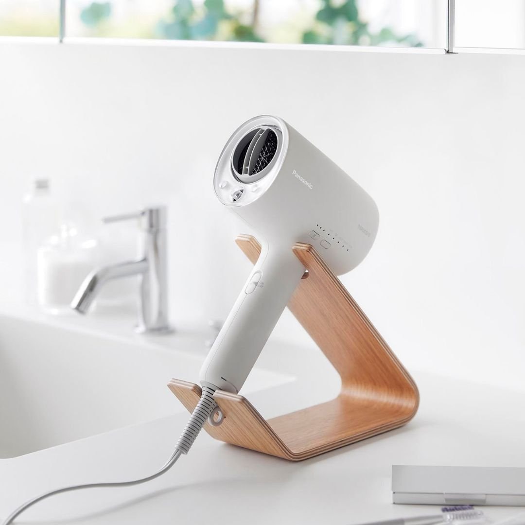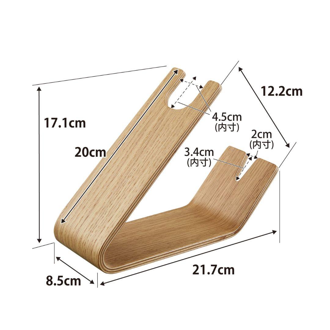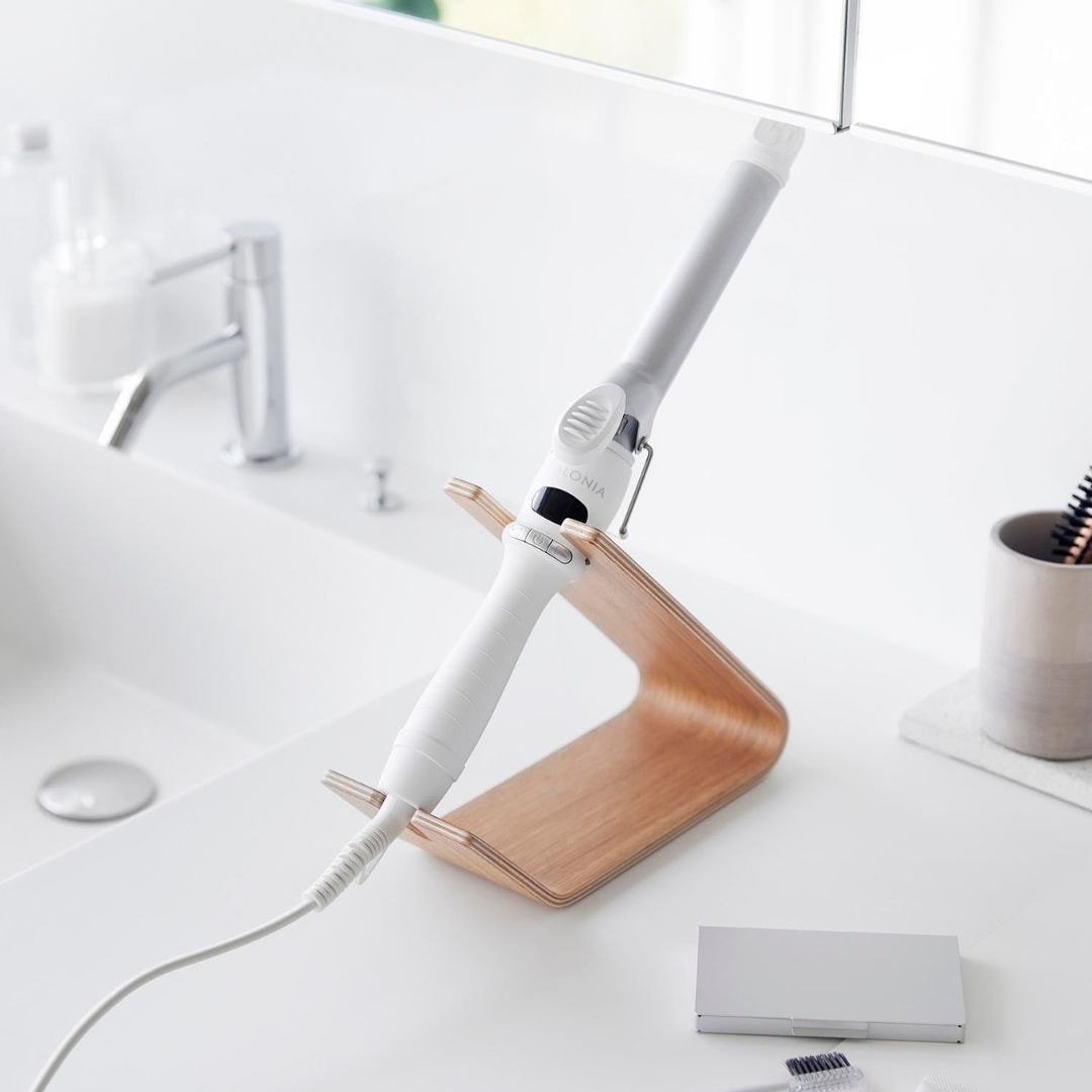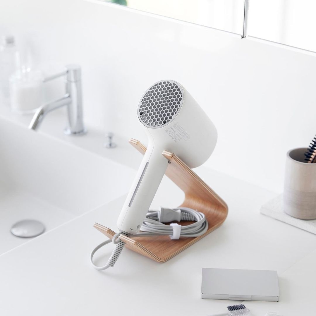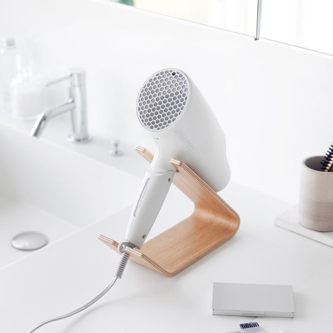スタンドに置くだけ。 ホテルライクなドライヤー収納ドライヤーを立て掛けるだけの収納スタンドです。薄い天然木を何枚も重ねられたスタンドは木目模様が美しく、一枚板ではつくれない優美な曲線が魅力です。まとめるのに困っていた電源コードもスマートに収納できるから洗面所がすっきりと片付きます。洗面所に置きやすい、2色のカラーバリエーションカラーは、高級感のあるブラウン、明るい印象のナチュラルをご用意しました。木目調が映えるカラーリングです。洗面所の雰囲気やお持ちのドライヤーのお色味などに合わせてお好みのカラーをお選びください。ヘアアイロンも立て掛けられるドライヤーを斜めに安定して立て掛けられます。使いたいときも手に取りやすく、置くだけ収納なのがお手軽で手間なし。ストレートアイロンやヘアアイロン置き場としてもご活用いただけます。※使用中や使用直後で熱い状態のアイロンは収納しないでください。トレーにコードをすっきり収納底面のトレー部には電源コードを束ねて収納しておけます。お持ちのコードホルダーでまとめてから置くとすっきりとした見た目に整います。電源コードが散乱しがちな洗面所ではコードの定位置を定めておくのが収納上手のポイントです。立て掛ける向きを変えてハンズフリーで乾かすドライヤーの送風口を手前に向けてドライヤーを立て掛ければハンズフリーで髪を乾かすこともできます。ブラシで髪を梳かしながら、タオルで水分を拭き取りながら乾かせるのでブローがはかどります。