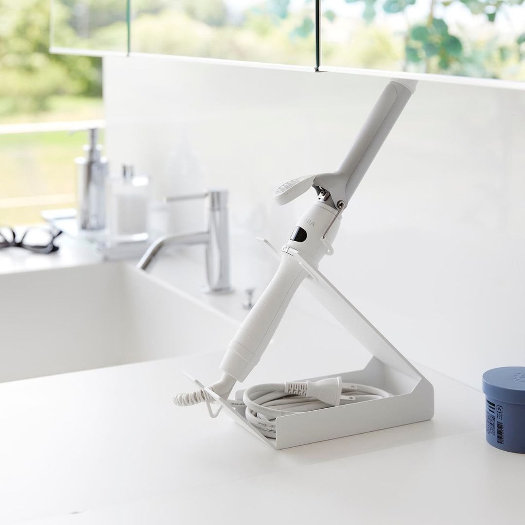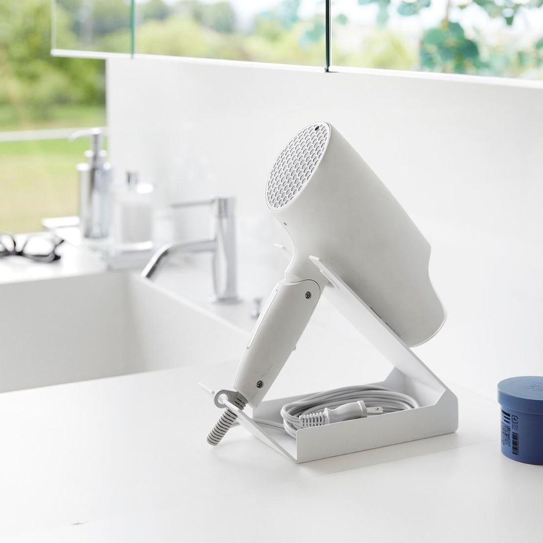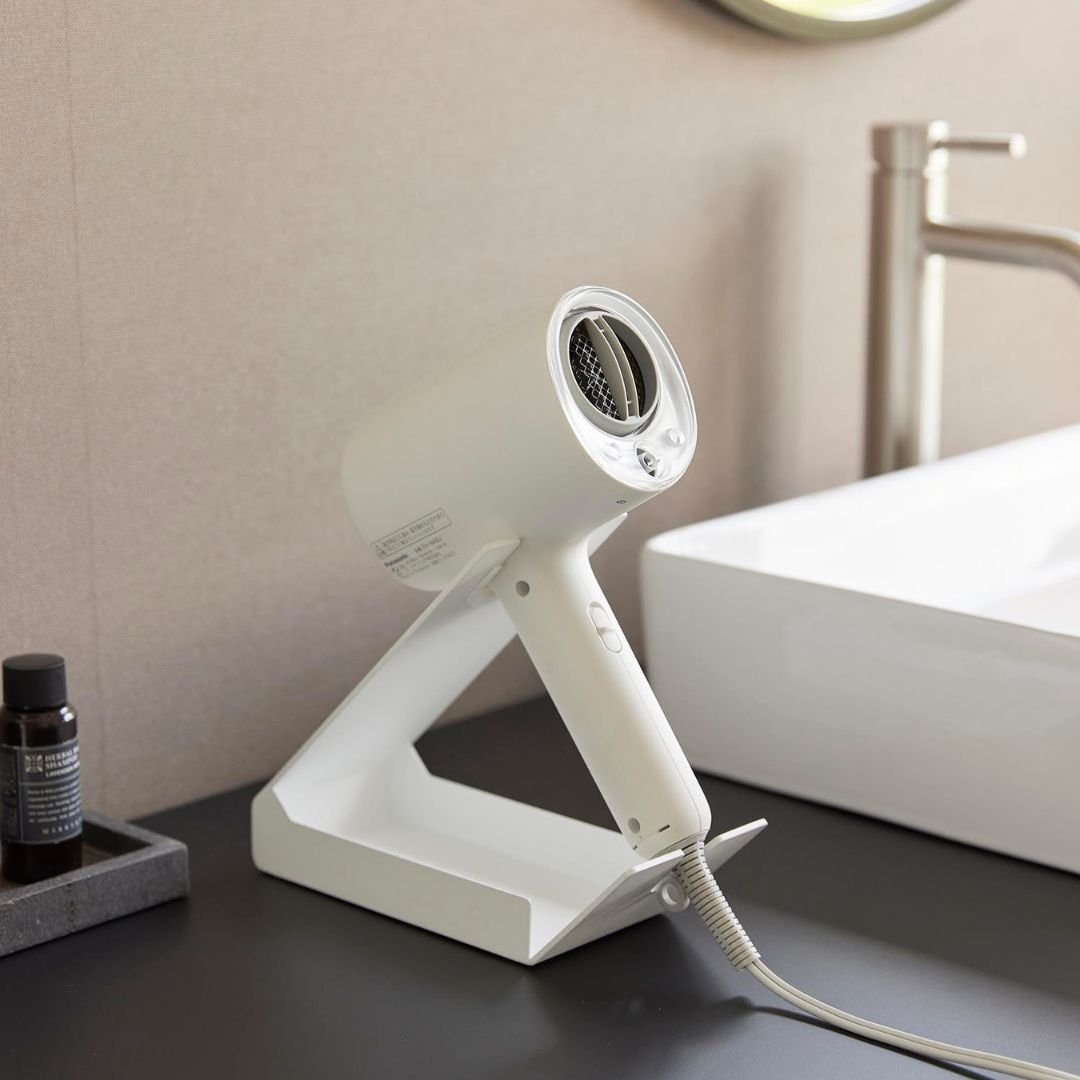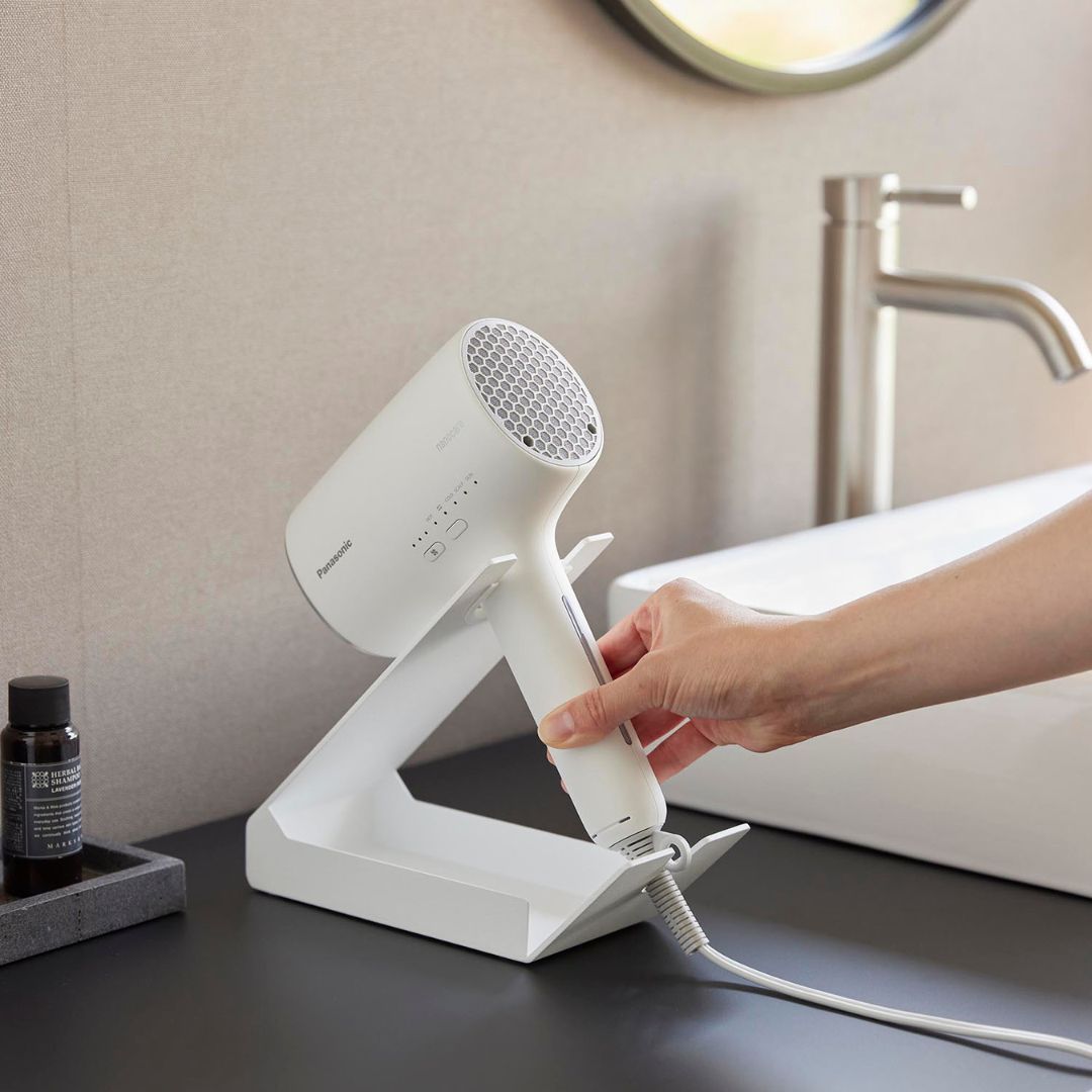スタンドに置くだけ。 ホテルライクなドライヤー収納ドライヤーを立て掛けるだけの収納スタンドです。まとめるのに困っていた電源コードもスマートに収納できるから洗面所がすっきりと片付きます。幅8.5cmで洗面台に設置しても邪魔にならないコンパクトなサイズ感です。洗面所に置きやすい、2色のカラーバリエーションカラーは、清潔感のあるホワイト、スタイリッシュなブラックをご用意しました。洗面所になじむシンプルなモノトーンカラーです。洗面所の雰囲気やお持ちのドライヤーのお色味などに合わせてお好みのカラーをお選びください。ヘアアイロンも立て掛けられるドライヤーを斜めに安定して立て掛けられます。使いたいときも手に取りやすく、置くだけ収納なのがお手軽で手間なし。ストレートアイロンやヘアアイロン置き場としてもご活用いただけます。※使用中や使用直後で熱い状態のアイロンは収納しないでください。立ち上がり部でコードをすっきり収納台座には立ち上がりが付いているため、電源コードを束ねて収納しておけます。コードがばらつかないので洗面台回りがすっきりしストレスフリーに。アメニティ用品、ヘアゴムやクリップなどの置き場にするのも◎立て掛ける向きを変えてハンズフリーで乾かすドライヤーの送風口を手前に向けてドライヤーを立て掛ければハンズフリーで髪を乾かすこともできます。ブラシで髪を梳かしながら、タオルで水分を拭き取りながら乾かせるのでブローがはかどります。