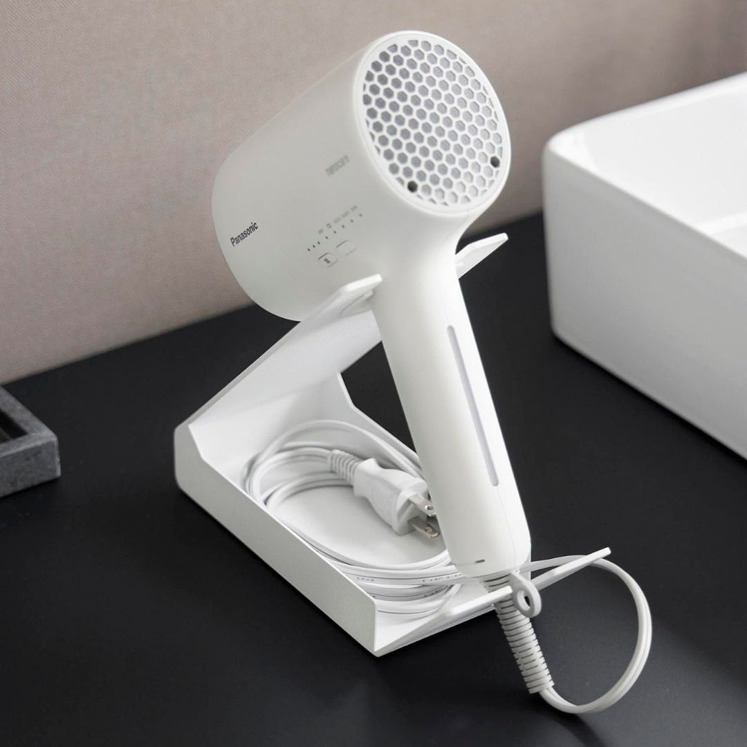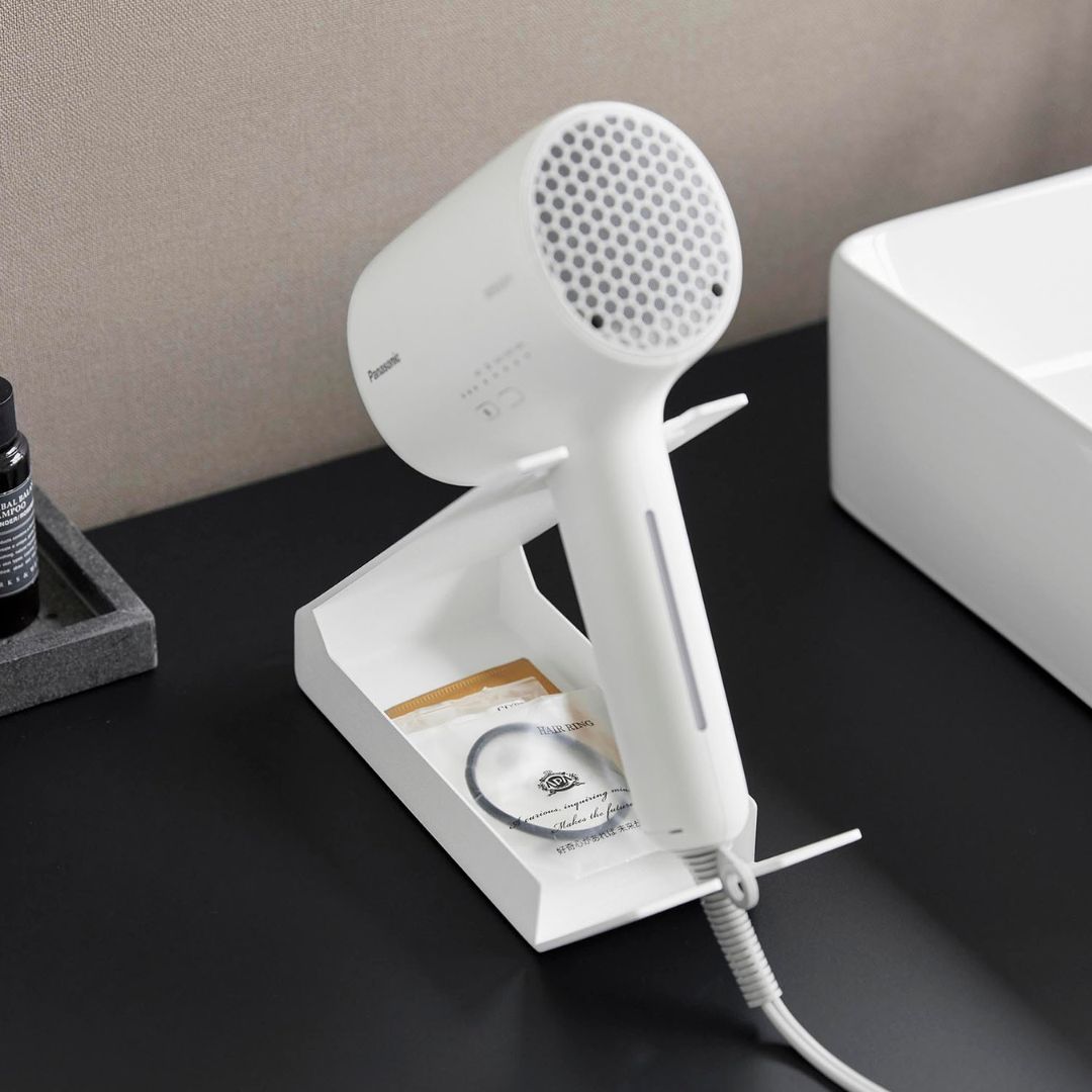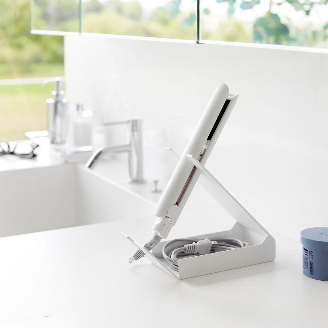 スタンドに置くだけ。 ホテルライクなドライヤー収納ドライヤーを立て掛けるだけの収納スタンドです。まとめるのに困っていた電源コードもスマートに収納できるから洗面所がすっきりと片付きます。幅8.5cmで洗面台に設置しても邪魔にならないコンパクトなサイズ感です。洗面所に置きやすい、2色のカラーバリエーションカラーは、清潔感のあるホワイト、スタイリッシュなブラックをご用意しました。洗面所になじむシンプルなモノトーンカラーです。洗面所の雰囲気やお持ちのドライヤーのお色味などに合わせてお好みのカラーをお選びください。ヘアアイロンも立て掛けられるドライヤーを斜めに安定して立て掛けられます。使いたいときも手に取りやすく、置くだけ収納なのがお手軽で手間なし。ストレートアイロンやヘアアイロン置き場としてもご活用いただけます。※使用中や使用直後で熱い状態のアイロンは収納しないでください。立ち上がり部でコードをすっきり収納台座には立ち上がりが付いているため、電源コードを束ねて収納しておけます。コードがばらつかないので洗面台回りがすっきりしストレスフリーに。アメニティ用品、ヘアゴムやクリップなどの置き場にするのも◎立て掛ける向きを変えてハンズフリーで乾かすドライヤーの送風口を手前に向けてドライヤーを立て掛ければハンズフリーで髪を乾かすこともできます。ブラシで髪を梳かしながら、タオルで水分を拭き取りながら乾かせるのでブローがはかどります。