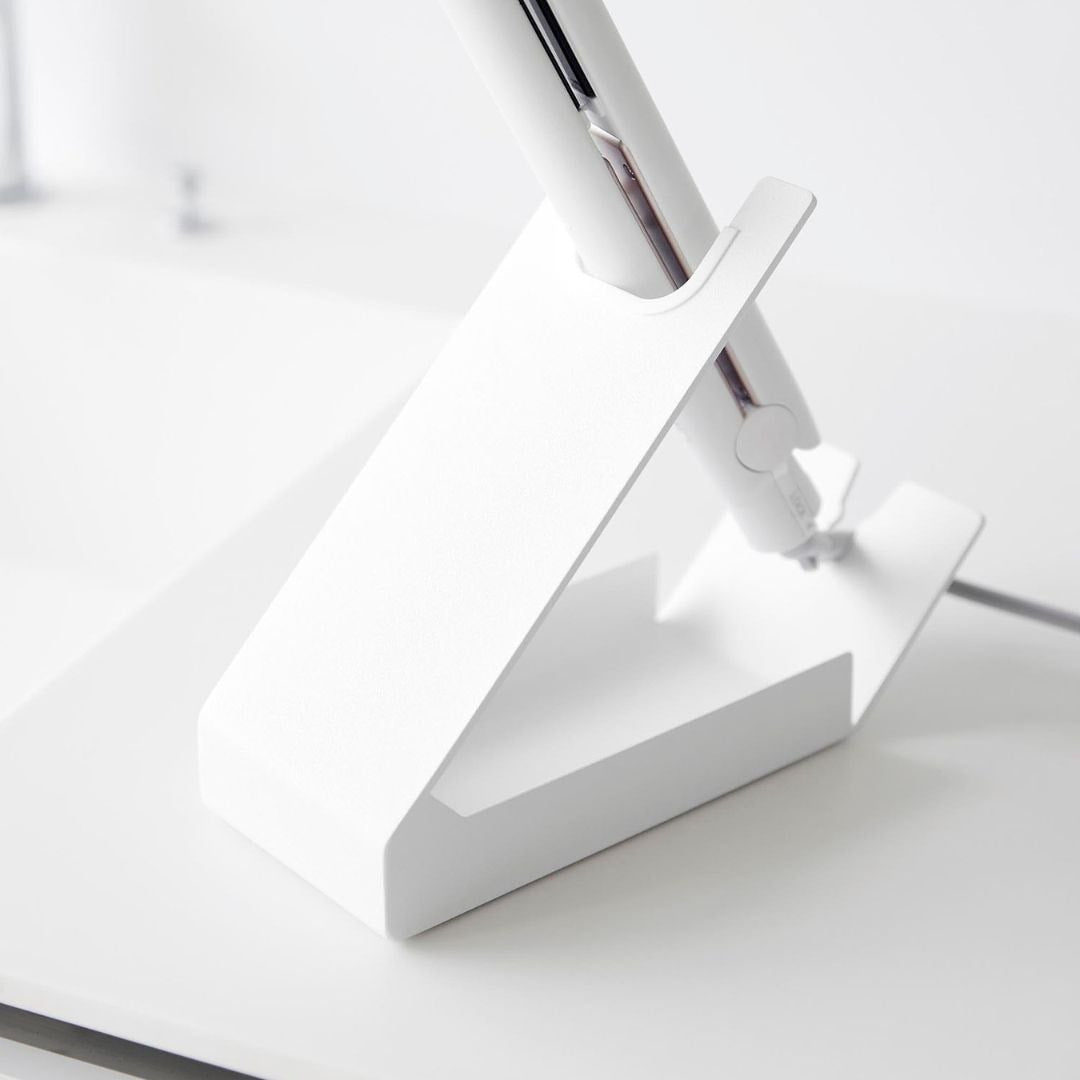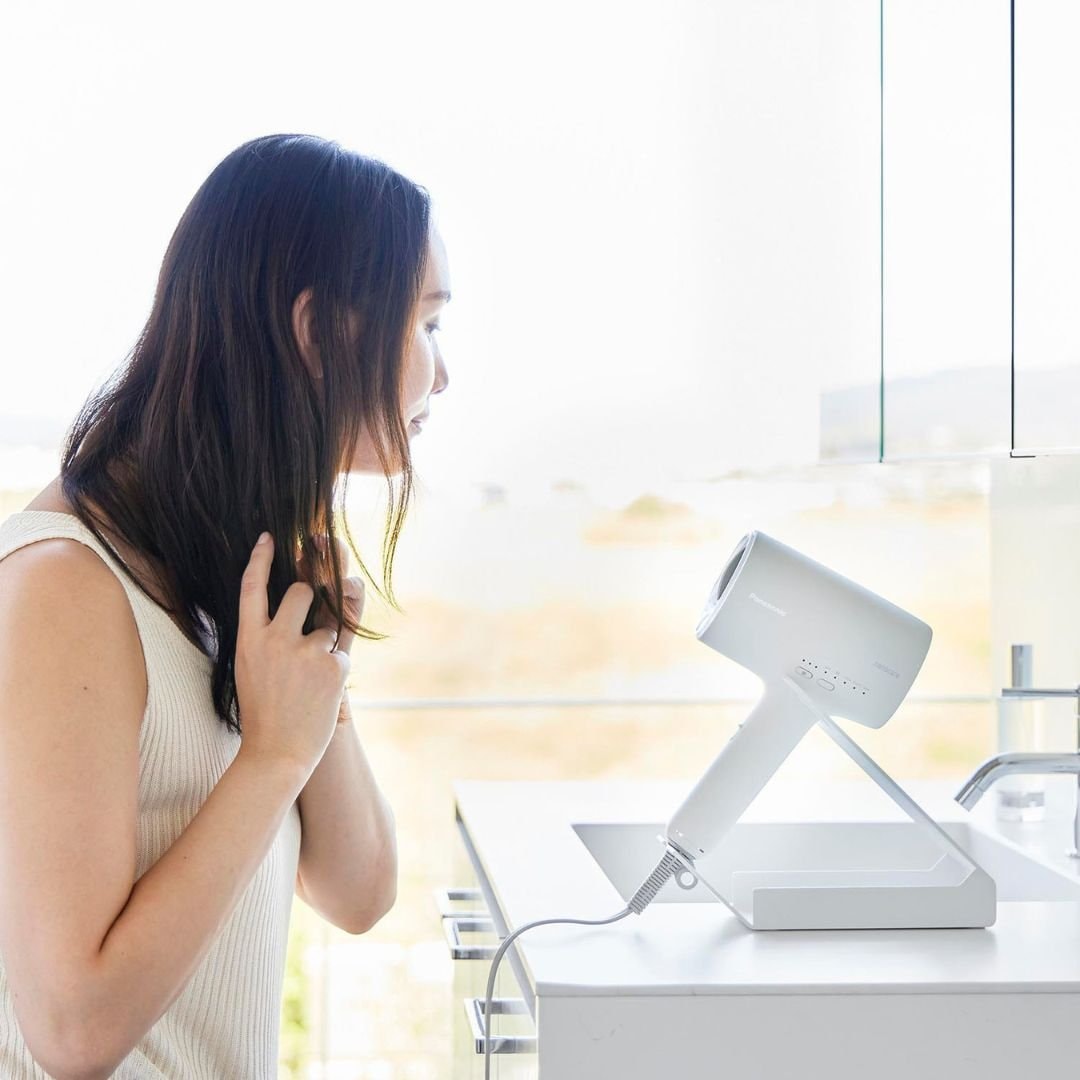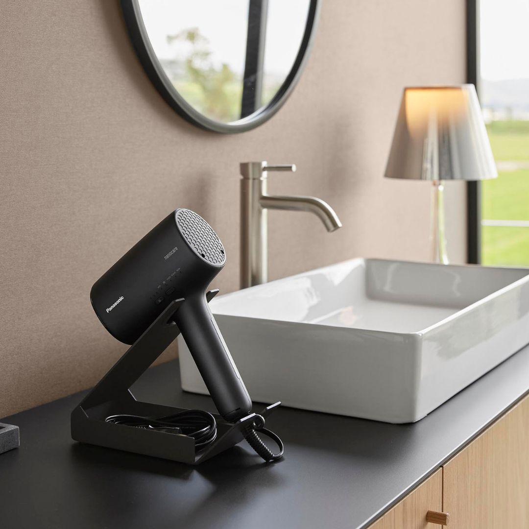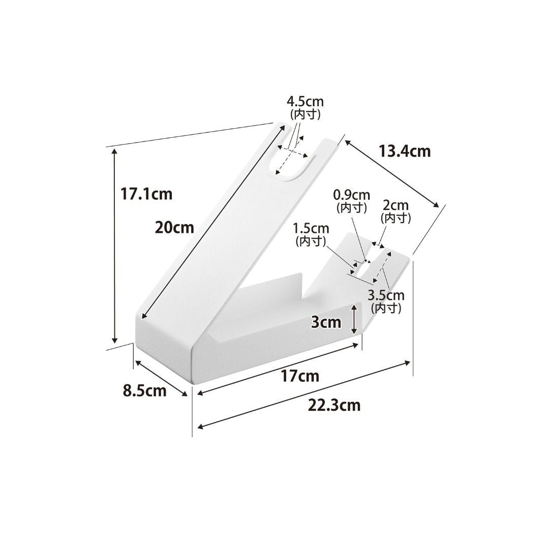 スタンドに置くだけ。 ホテルライクなドライヤー収納ドライヤーを立て掛けるだけの収納スタンドです。まとめるのに困っていた電源コードもスマートに収納できるから洗面所がすっきりと片付きます。幅8.5cmで洗面台に設置しても邪魔にならないコンパクトなサイズ感です。洗面所に置きやすい、2色のカラーバリエーションカラーは、清潔感のあるホワイト、スタイリッシュなブラックをご用意しました。洗面所になじむシンプルなモノトーンカラーです。洗面所の雰囲気やお持ちのドライヤーのお色味などに合わせてお好みのカラーをお選びください。ヘアアイロンも立て掛けられるドライヤーを斜めに安定して立て掛けられます。使いたいときも手に取りやすく、置くだけ収納なのがお手軽で手間なし。ストレートアイロンやヘアアイロン置き場としてもご活用いただけます。※使用中や使用直後で熱い状態のアイロンは収納しないでください。立ち上がり部でコードをすっきり収納台座には立ち上がりが付いているため、電源コードを束ねて収納しておけます。コードがばらつかないので洗面台回りがすっきりしストレスフリーに。アメニティ用品、ヘアゴムやクリップなどの置き場にするのも◎立て掛ける向きを変えてハンズフリーで乾かすドライヤーの送風口を手前に向けてドライヤーを立て掛ければハンズフリーで髪を乾かすこともできます。ブラシで髪を梳かしながら、タオルで水分を拭き取りながら乾かせるのでブローがはかどります。