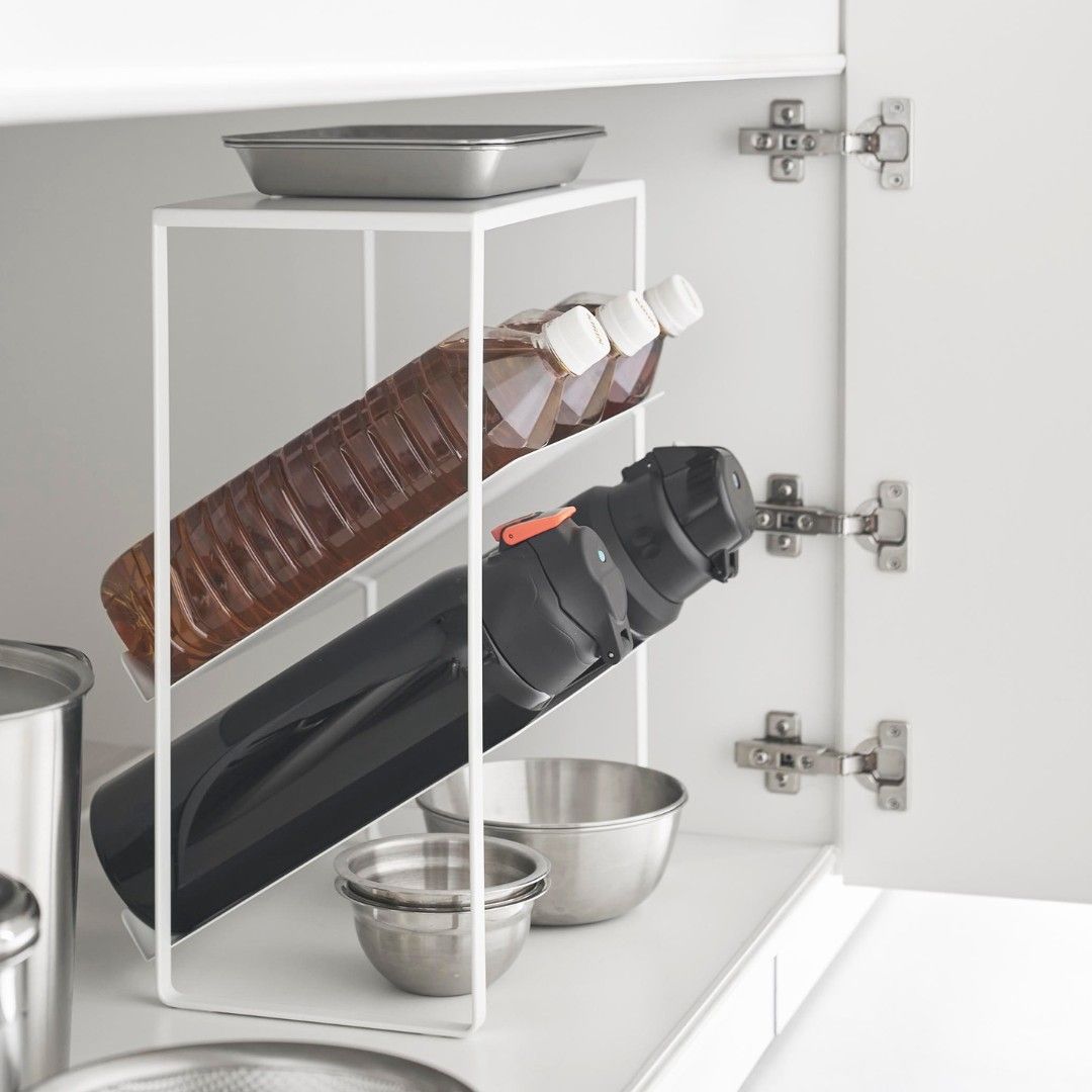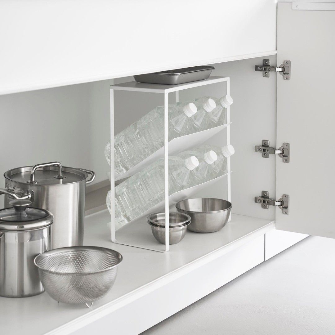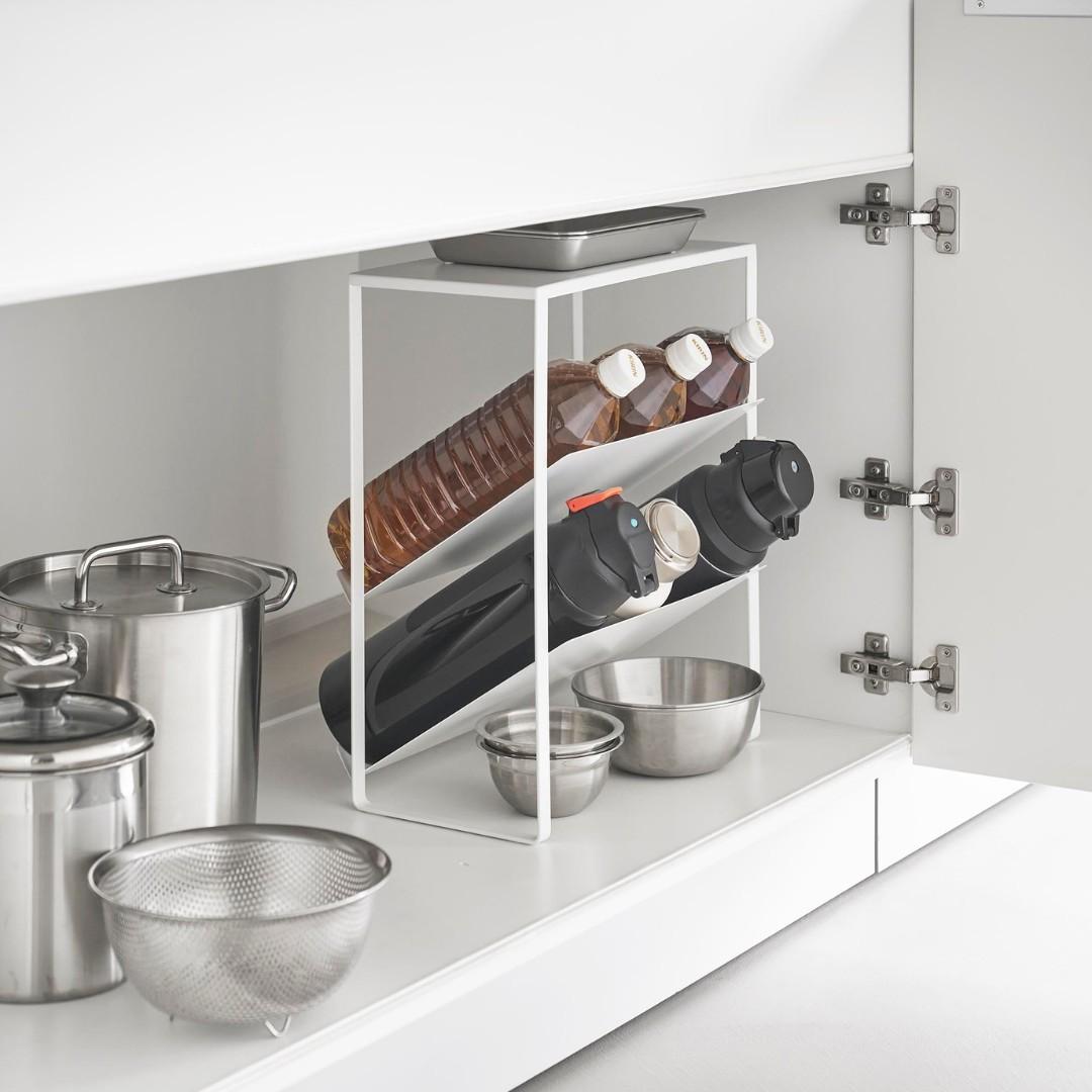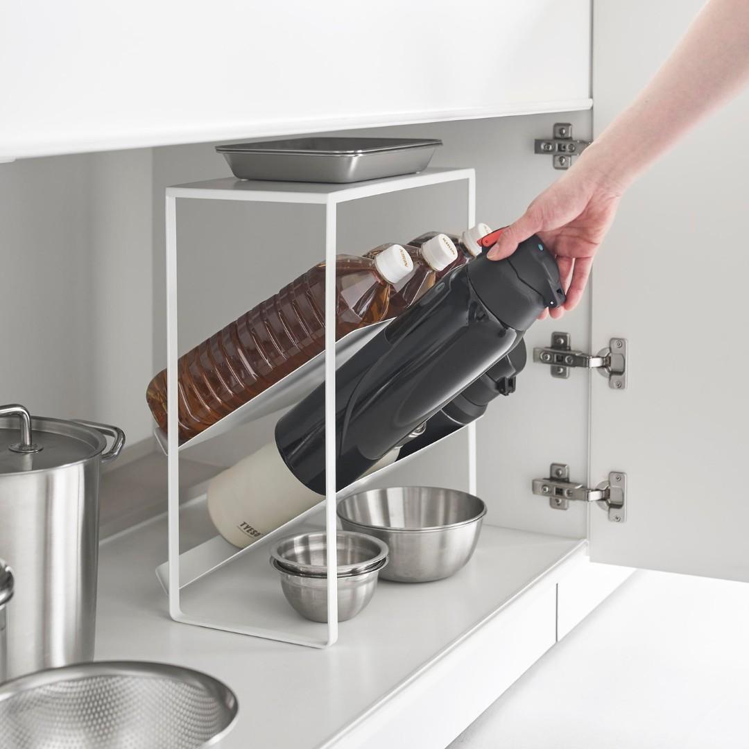 大きいサイズのボトルを収納できる、天板付きボトルストッカー1.5Lのスポーツジャグ・2Lペットボトル・洗剤類など、収納に困る大きいサイズのものを一括収納できる天板付きボトルストッカー。「斜めの棚」なので、取り出しやすさもバッチリ。インテリアに馴染みやすい、2色のカラーバリエーションカラーは、清潔感のあるホワイト、スタイリッシュなブラックをご用意しました。ストッカーを置く場所や、ストッカーに置くものの雰囲気に合わせてお好みのカラーをお選びください。たっぷり入って、取り出しやすい目安として、2Lのペットボトルなら6本まで収納可能。また棚が斜めになっているから、大きくて重いものでも出し入れしやすいです。ボトル類だけでなく、小物置きにもなる例えば、水筒の付属品・他のストック用品など…天板部分には小物も置くことができます。キッチン以外に、様々な場所で大活躍。キッチンに限らず、洗面台下に設置するのもおすすめ。シャンプーや洗剤・詰め替えボトルなどを一か所にまとめて収納しておくのもグッド。ゴチャゴチャしているものを、ストッカーを活用してスッキリ。