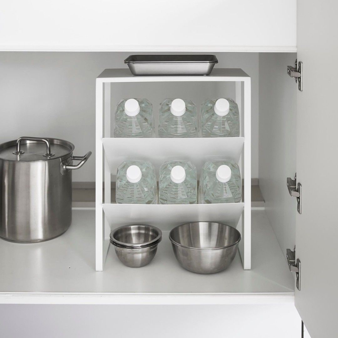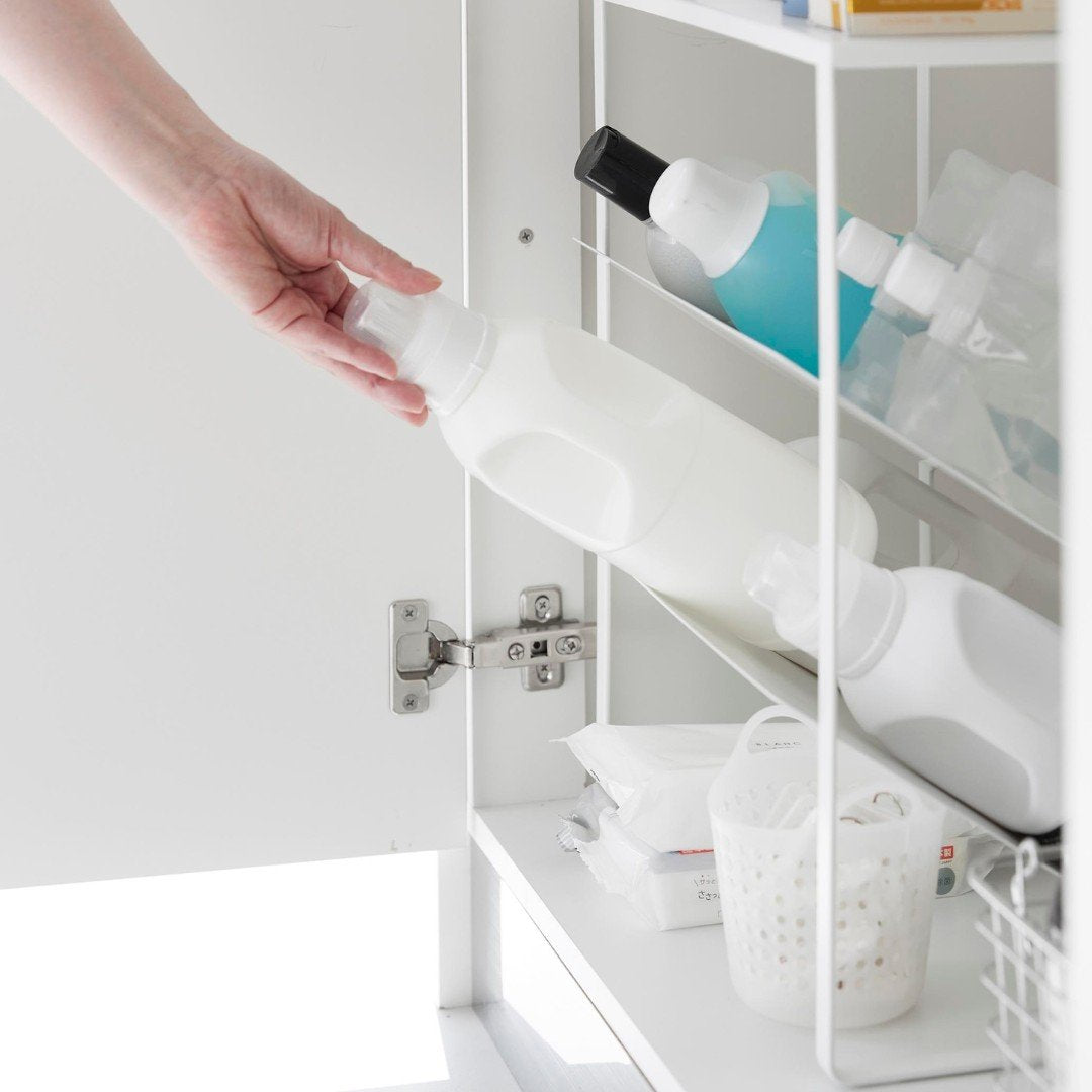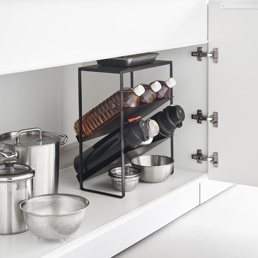 大きいサイズのボトルを収納できる、天板付きボトルストッカー1.5Lのスポーツジャグ・2Lペットボトル・洗剤類など、収納に困る大きいサイズのものを一括収納できる天板付きボトルストッカー。「斜めの棚」なので、取り出しやすさもバッチリ。インテリアに馴染みやすい、2色のカラーバリエーションカラーは、清潔感のあるホワイト、スタイリッシュなブラックをご用意しました。ストッカーを置く場所や、ストッカーに置くものの雰囲気に合わせてお好みのカラーをお選びください。たっぷり入って、取り出しやすい目安として、2Lのペットボトルなら6本まで収納可能。また棚が斜めになっているから、大きくて重いものでも出し入れしやすいです。ボトル類だけでなく、小物置きにもなる例えば、水筒の付属品・他のストック用品など…天板部分には小物も置くことができます。キッチン以外に、様々な場所で大活躍。キッチンに限らず、洗面台下に設置するのもおすすめ。シャンプーや洗剤・詰め替えボトルなどを一か所にまとめて収納しておくのもグッド。ゴチャゴチャしているものを、ストッカーを活用してスッキリ。
