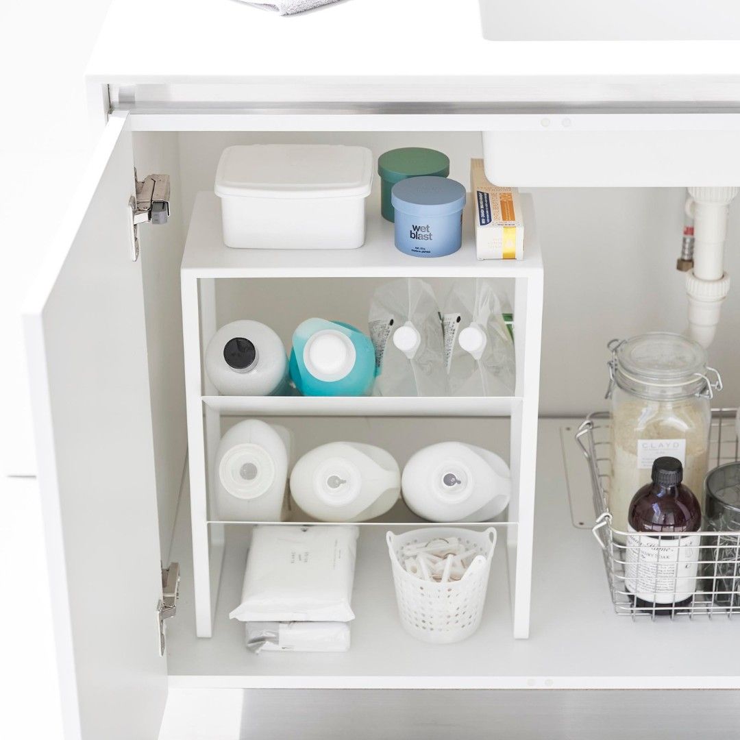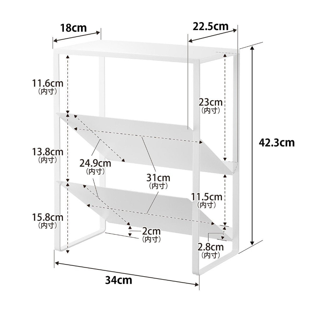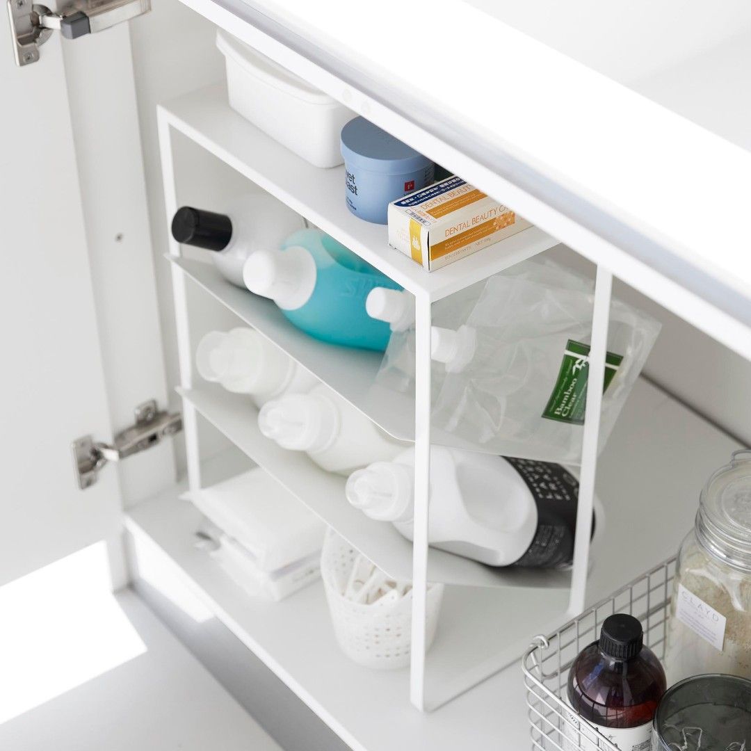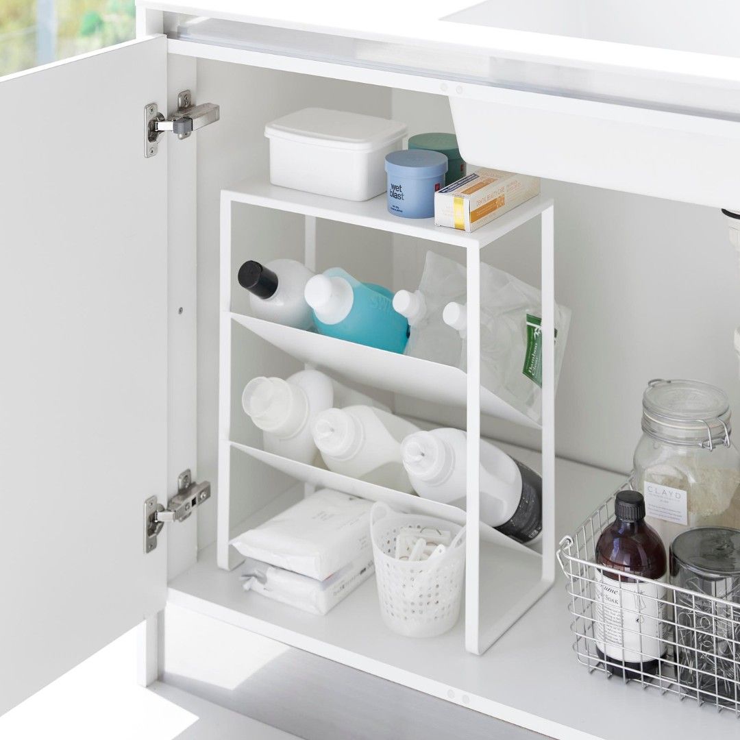 大きいサイズのボトルを収納できる、天板付きボトルストッカー1.5Lのスポーツジャグ・2Lペットボトル・洗剤類など、収納に困る大きいサイズのものを一括収納できる天板付きボトルストッカー。「斜めの棚」なので、取り出しやすさもバッチリ。インテリアに馴染みやすい、2色のカラーバリエーションカラーは、清潔感のあるホワイト、スタイリッシュなブラックをご用意しました。ストッカーを置く場所や、ストッカーに置くものの雰囲気に合わせてお好みのカラーをお選びください。たっぷり入って、取り出しやすい目安として、2Lのペットボトルなら6本まで収納可能。また棚が斜めになっているから、大きくて重いものでも出し入れしやすいです。ボトル類だけでなく、小物置きにもなる例えば、水筒の付属品・他のストック用品など…天板部分には小物も置くことができます。キッチン以外に、様々な場所で大活躍。キッチンに限らず、洗面台下に設置するのもおすすめ。シャンプーや洗剤・詰め替えボトルなどを一か所にまとめて収納しておくのもグッド。ゴチャゴチャしているものを、ストッカーを活用してスッキリ。