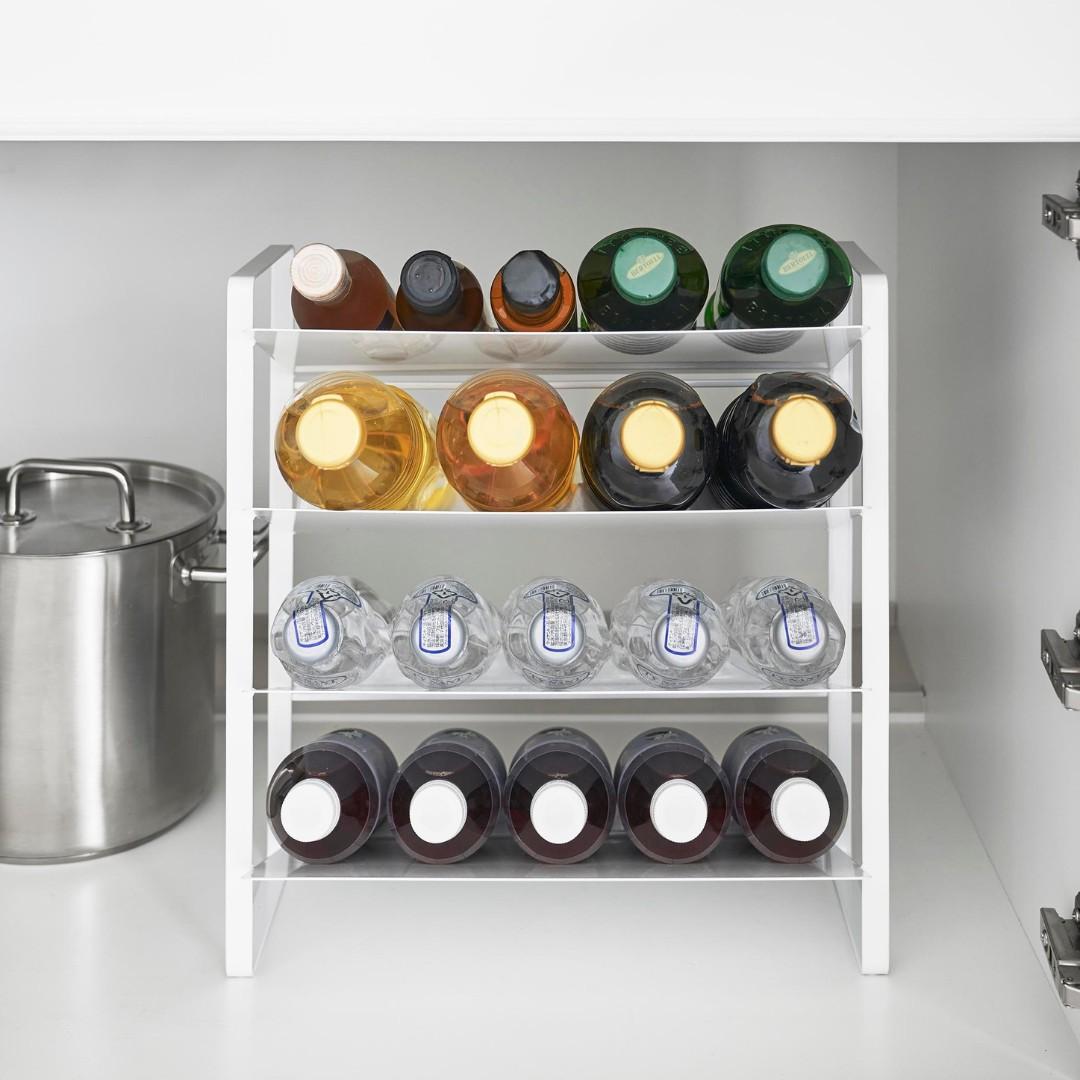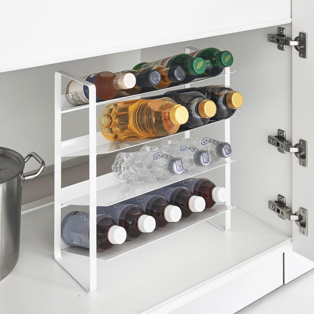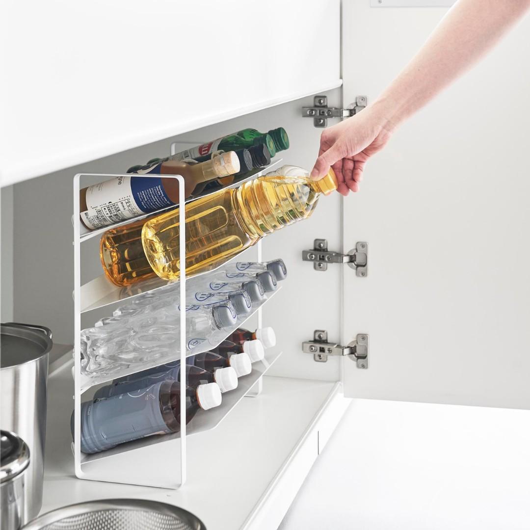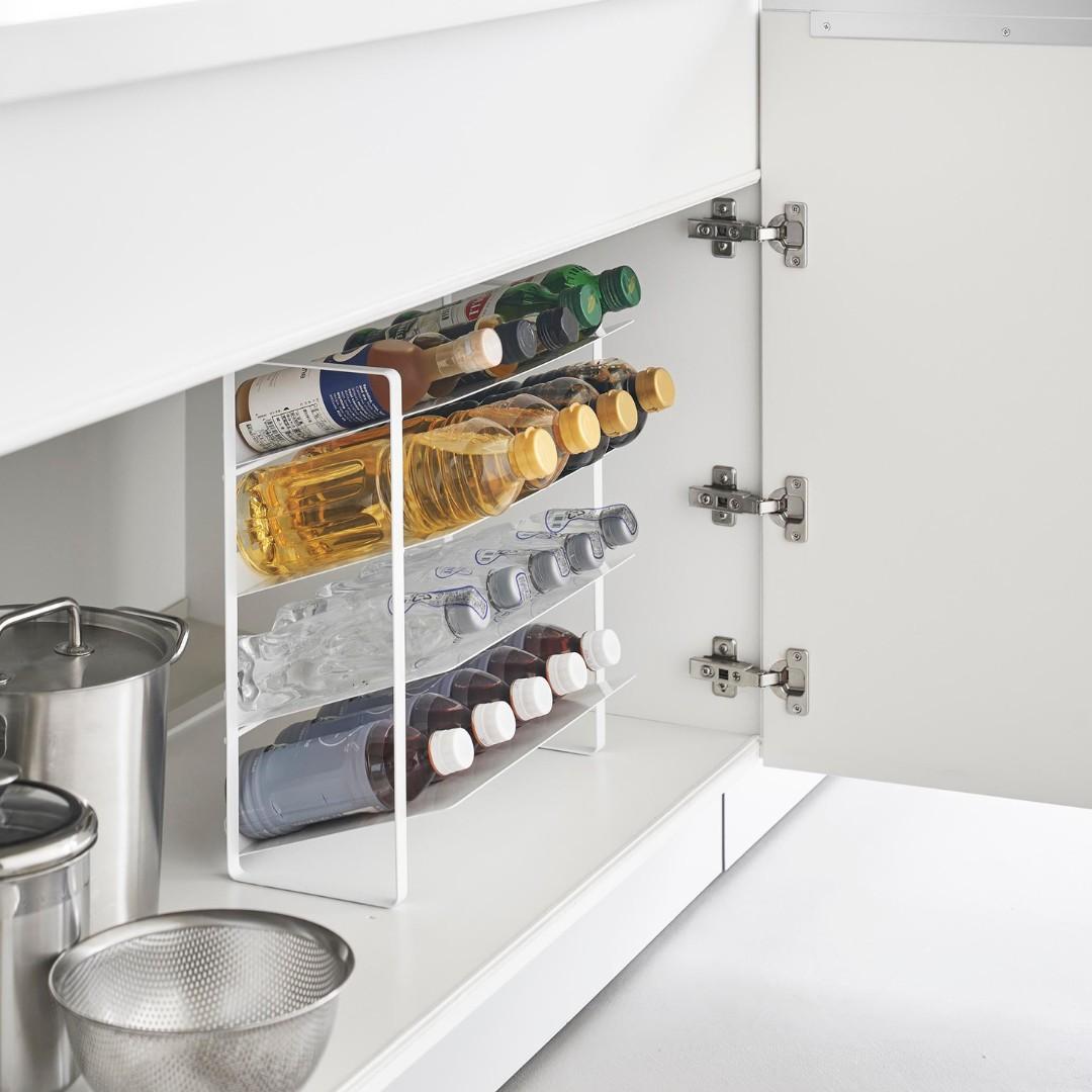 出し入れしやすい、ワイドな大容量ボトルストッカー調味料・洗剤・ストック品などの収納に。キッチン・洗面下収納で使えて、便利な大容量ボトルストッカー。斜めになっているので出し入れしやすく、500mLのペットボトルはなんと20本収納可能。インテリアに馴染みやすい、2色のカラーバリエーションカラーは、清潔感のあるホワイト、スタイリッシュなブラックをご用意しました。ストッカーを置く場所や、ストッカーに置くものの雰囲気に合わせてお好みのカラーをお選びください。たっぷり入って、取り出しやすい目安として、500mLのペットボトルなら20本収納可能。また棚が上向きに傾斜が付いているので、低い位置の収納でも取り出しやすいです。大量にストック買いしがちな飲料水は、ストッカーを活用してキレイにまとめましょう。キッチン以外に、様々な場所で大活躍。キッチンに限らず、洗面台下に設置するのもおすすめ。シャンプーボトル・洗剤ボトル・スプレー缶やチューブ類などを、一か所にまとめて収納しておくのもグッド。ゴチャゴチャしているものを、ストッカーを活用してスッキリ。