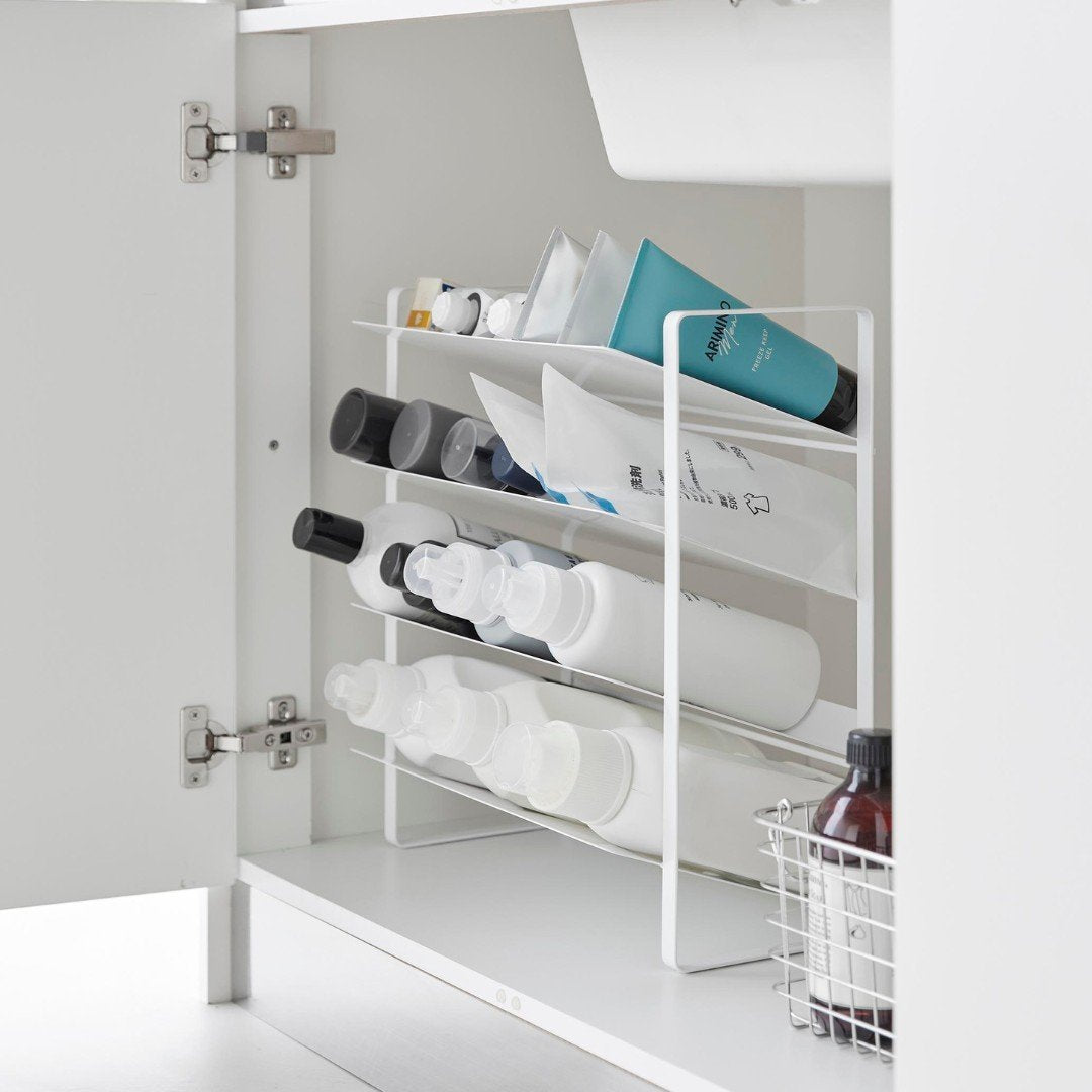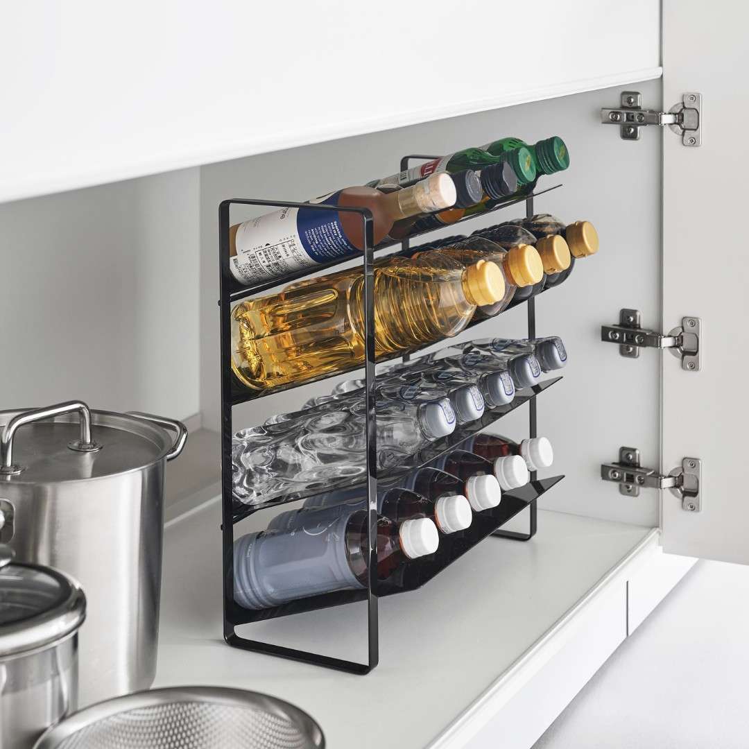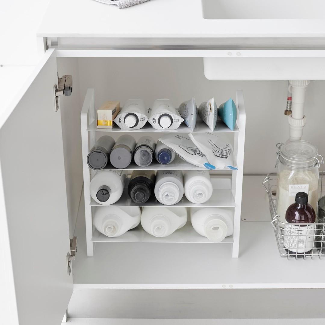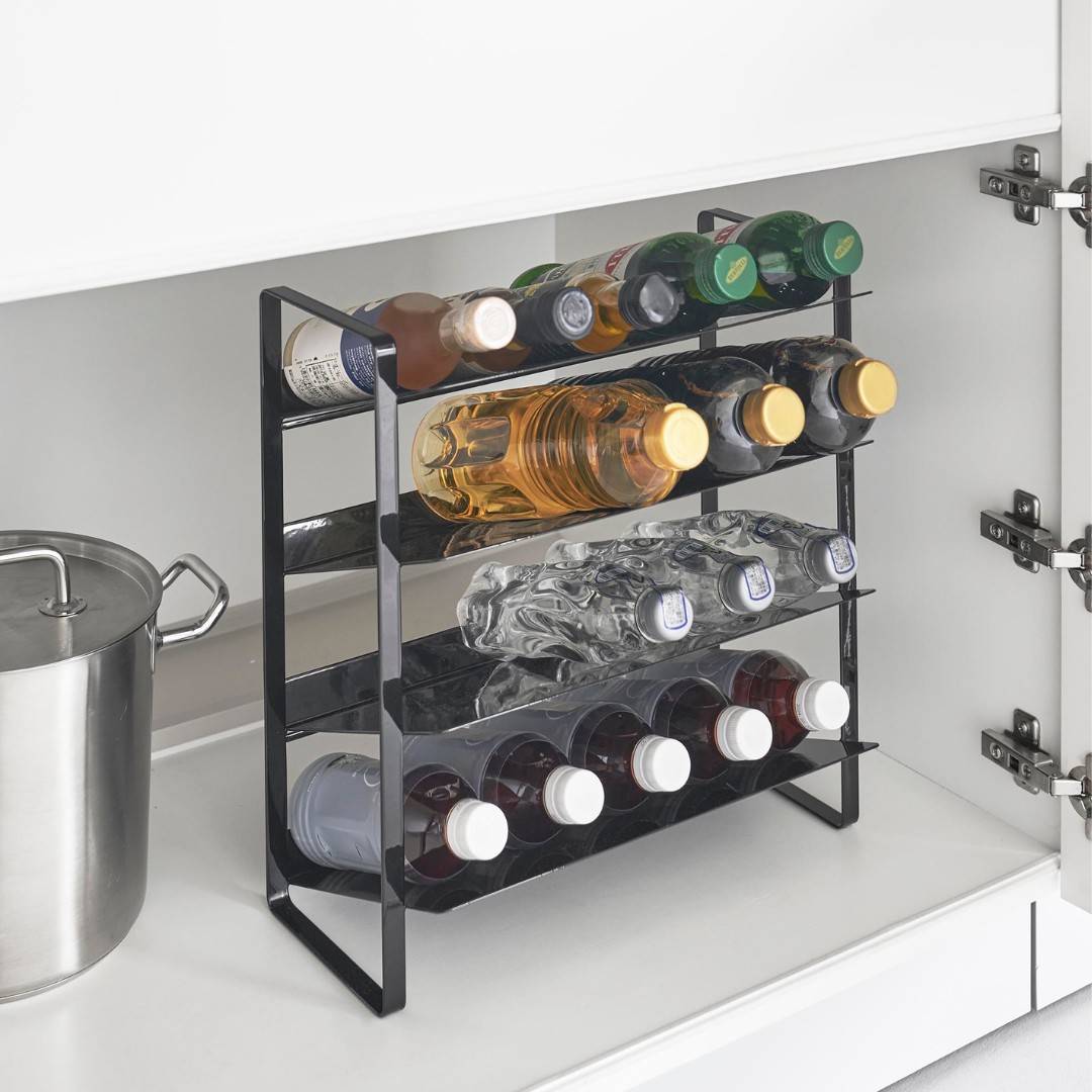 出し入れしやすい、ワイドな大容量ボトルストッカー調味料・洗剤・ストック品などの収納に。キッチン・洗面下収納で使えて、便利な大容量ボトルストッカー。斜めになっているので出し入れしやすく、500mLのペットボトルはなんと20本収納可能。インテリアに馴染みやすい、2色のカラーバリエーションカラーは、清潔感のあるホワイト、スタイリッシュなブラックをご用意しました。ストッカーを置く場所や、ストッカーに置くものの雰囲気に合わせてお好みのカラーをお選びください。たっぷり入って、取り出しやすい目安として、500mLのペットボトルなら20本収納可能。また棚が上向きに傾斜が付いているので、低い位置の収納でも取り出しやすいです。大量にストック買いしがちな飲料水は、ストッカーを活用してキレイにまとめましょう。キッチン以外に、様々な場所で大活躍。キッチンに限らず、洗面台下に設置するのもおすすめ。シャンプーボトル・洗剤ボトル・スプレー缶やチューブ類などを、一か所にまとめて収納しておくのもグッド。ゴチャゴチャしているものを、ストッカーを活用してスッキリ。