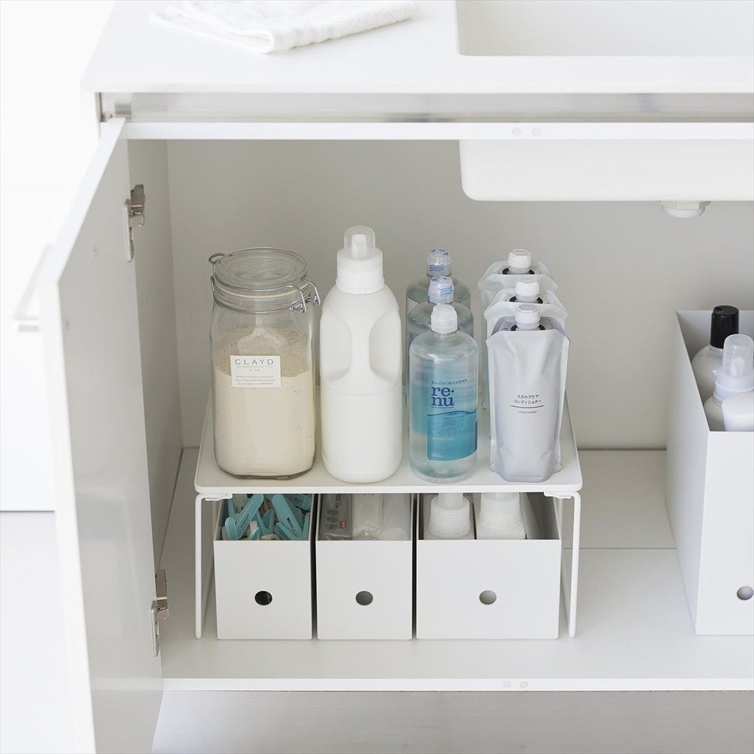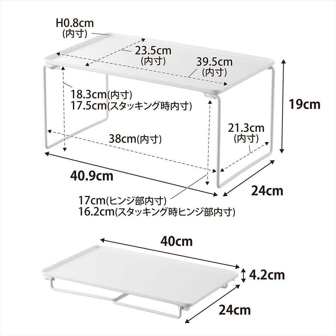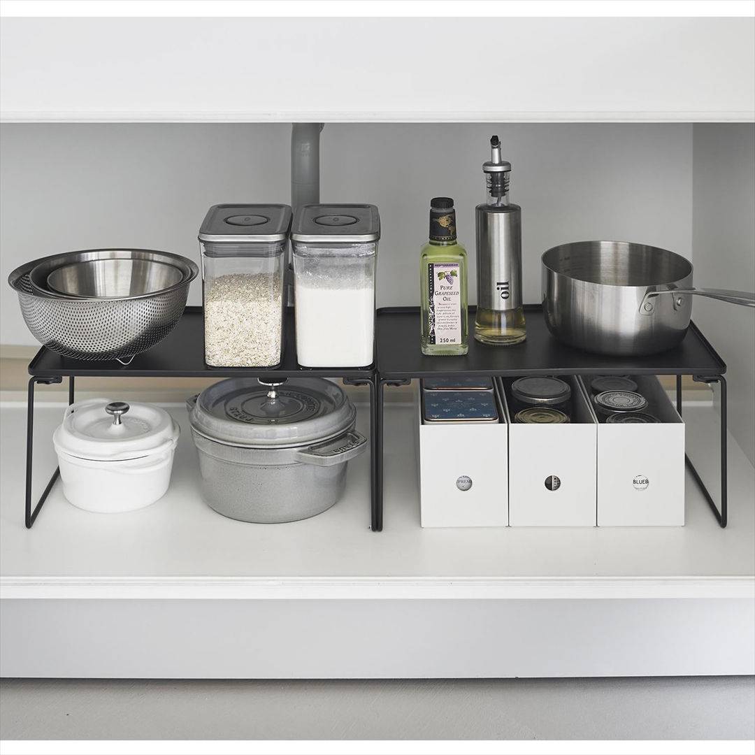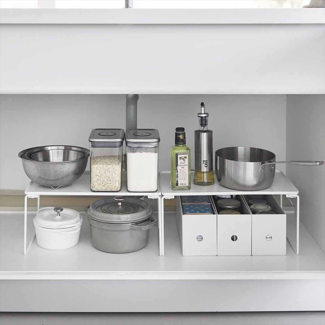 シンク下のスペースを有効活用して収納力をUP。キッチンシンク下や洗面所下のデッドスペースを収納スペースとして活用する積み重ね棚です。利用しないときは折りたたんでスリムに収納できるので邪魔になりません。キッチンシンク上に置いて調味料ラックとしてもご使用いただけます。どんなインテリアにもなじむ、2色のカラーバリエーションカラーは、明るい印象のホワイト、スタイリッシュなブラックをご用意しました。キッチンになじみやすいシンプルなモノトーンカラーです。キッチンや洗面所など設置場所の雰囲気に合わせてお好みのカラーをお選びください。スタッキングして三段収納に収納したお鍋やボウルの上に種を作ることで、いままでデッドスペースになっていた空間を新たな収納スペースとして有効活用します。二個を縦にスタッキングして使えば三段収納にも。お手持ちの収納ボックスと組み合わせれば引き出しのようにも使えます。※こちらは一個組の商品です。調味料を乗せても落下しづらいフチ付き天板天板はフチ付きになっているので上に乗せたものがすべり落ちにくい設計です。耐荷重は4kgあるため調理用油や調味料のストックなども無理なく収納できて便利。使わないときにはスリムに折りたためるので場所を取りません。使用場所に合わせて選べる2サイズ展開高さ19cm/28cmの2パターンをご用意しました。奥行きと横幅は同サイズなので、サイズ違いでも重ねたり並べたりしてご使用いただけます。設置スペースや収納物に合わせて最適なサイズをお選びください。※こちらの商品は『折り畳み積み重ね棚 M』の商品となり、『折り畳み積み重ね棚 L』の商品は別売です。