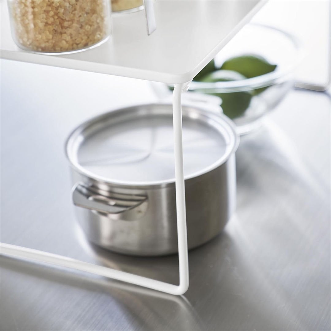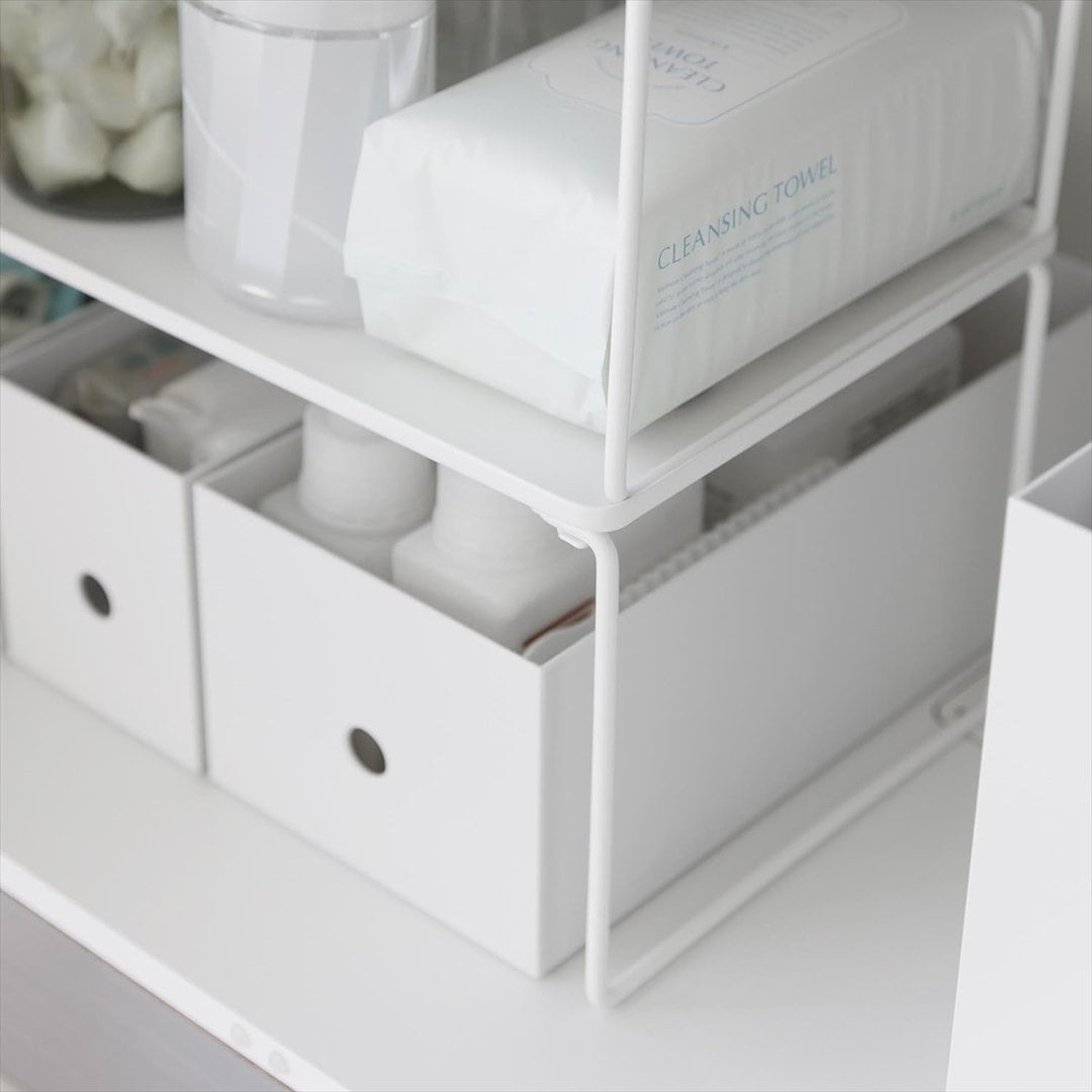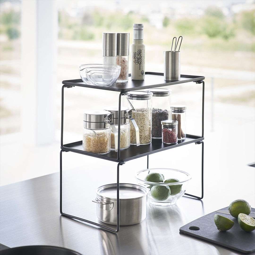 シンク下のスペースを有効活用して収納力をUP。キッチンシンク下や洗面所下のデッドスペースを収納スペースとして活用する積み重ね棚です。利用しないときは折りたたんでスリムに収納できるので邪魔になりません。キッチンシンク上に置いて調味料ラックとしてもご使用いただけます。どんなインテリアにもなじむ、2色のカラーバリエーションカラーは、明るい印象のホワイト、スタイリッシュなブラックをご用意しました。キッチンになじみやすいシンプルなモノトーンカラーです。キッチンや洗面所など設置場所の雰囲気に合わせてお好みのカラーをお選びください。スタッキングして三段収納に収納したお鍋やボウルの上に種を作ることで、いままでデッドスペースになっていた空間を新たな収納スペースとして有効活用します。二個を縦にスタッキングして使えば三段収納にも。お手持ちの収納ボックスと組み合わせれば引き出しのようにも使えます。※こちらは一個組の商品です。調味料を乗せても落下しづらいフチ付き天板天板はフチ付きになっているので上に乗せたものがすべり落ちにくい設計です。耐荷重は4kgあるため調理用油や調味料のストックなども無理なく収納できて便利。使わないときにはスリムに折りたためるので場所を取りません。使用場所に合わせて選べる2サイズ展開高さ19cm/28cmの2パターンをご用意しました。奥行きと横幅は同サイズなので、サイズ違いでも重ねたり並べたりしてご使用いただけます。設置スペースや収納物に合わせて最適なサイズをお選びください。※こちらの商品は『折り畳み積み重ね棚 M』の商品となり、『折り畳み積み重ね棚 L』の商品は別売です。