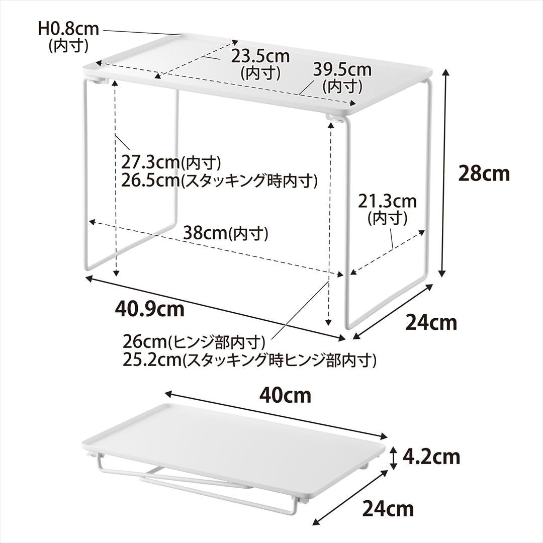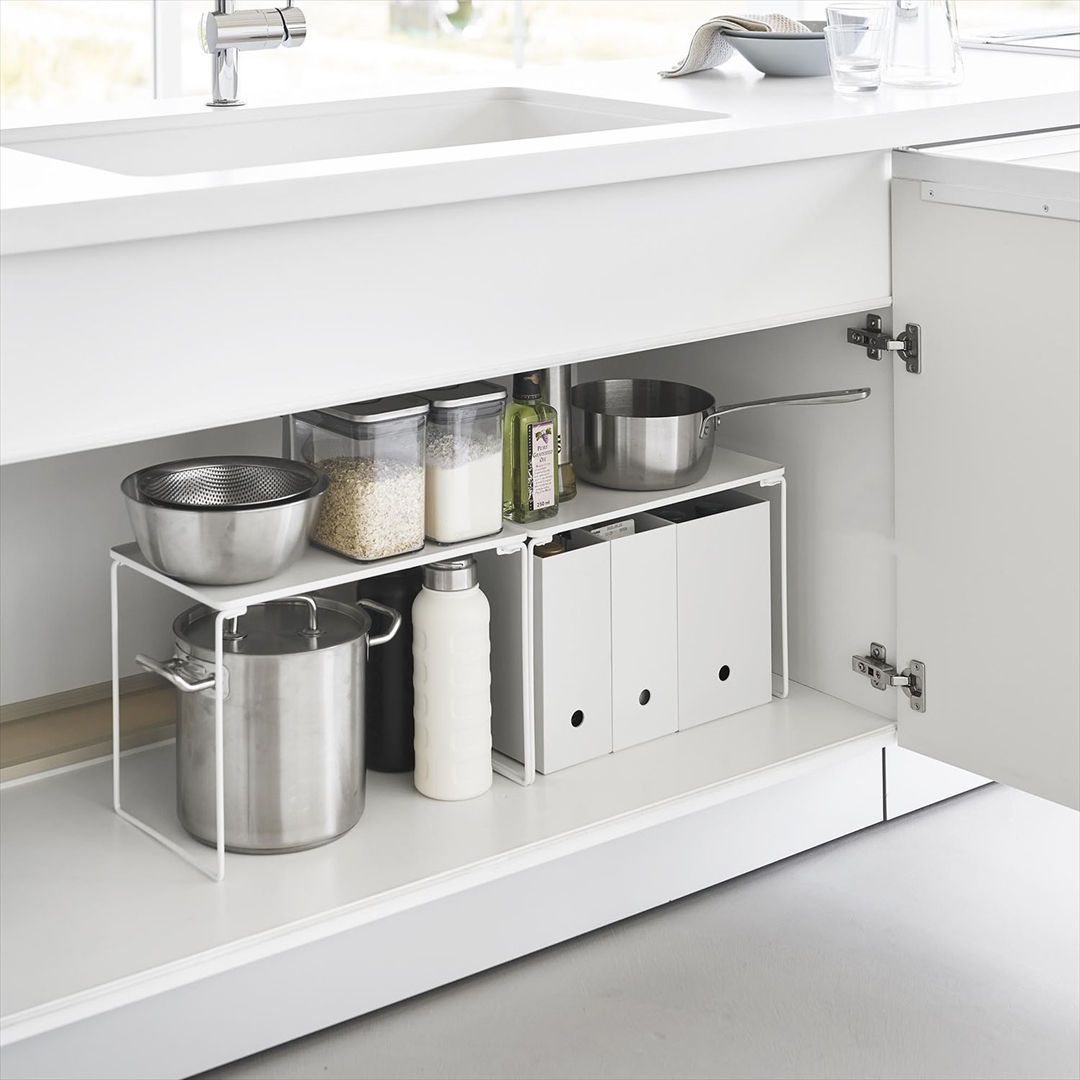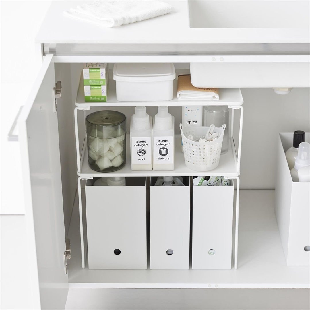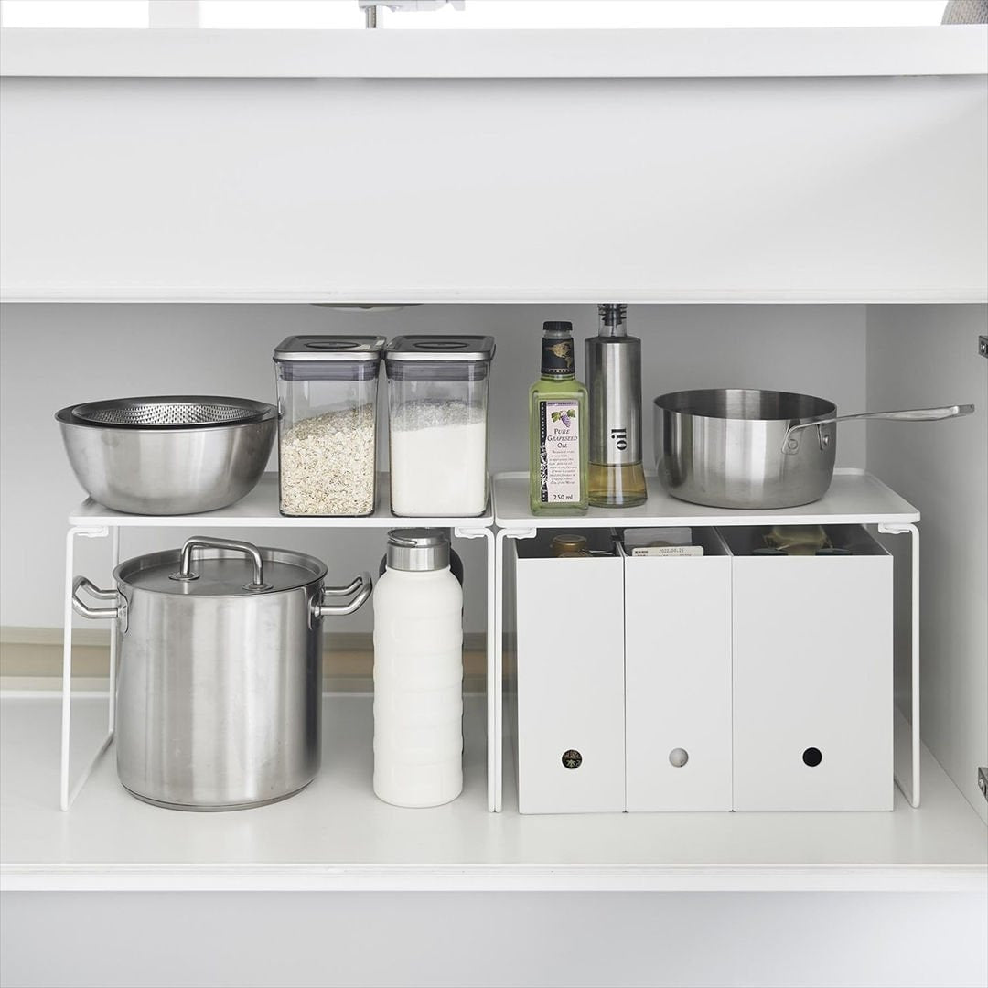 シンク下のスペースを有効活用して収納力をUP。キッチンシンク下や洗面所下のデッドスペースを収納スペースとして活用する積み重ね棚です。利用しないときは折りたたんでスリムに収納できるので邪魔になりません。キッチンシンク上に置いて調味料ラックとしてもご使用いただけます。どんなインテリアにもなじむ、2色のカラーバリエーションカラーは、明るい印象のホワイト、スタイリッシュなブラックをご用意しました。キッチンになじみやすいシンプルなモノトーンカラーです。キッチンや洗面所など設置場所の雰囲気に合わせてお好みのカラーをお選びください。スタッキングして三段収納に収納したお鍋やボウルの上に種を作ることで、いままでデッドスペースになっていた空間を新たな収納スペースとして有効活用します。二個を縦にスタッキングして使えば三段収納にも。お手持ちの収納ボックスと組み合わせれば引き出しのようにも使えます。※こちらは一個組の商品です。調味料を乗せても落下しづらいフチ付き天板天板はフチ付きになっているので上に乗せたものがすべり落ちにくい設計です。耐荷重は4kgあるため調理用油や調味料のストックなども無理なく収納できて便利。使わないときにはスリムに折りたためるので場所を取りません。使用場所に合わせて選べる2サイズ展開高さ19cm/28cmの2パターンをご用意しました。奥行きと横幅は同サイズなので、サイズ違いでも重ねたり並べたりしてご使用いただけます。設置スペースや収納物に合わせて最適なサイズをお選びください。※こちらの商品は『折り畳み積み重ね棚 L』の商品となり、『折り畳み積み重ね棚 M』の商品は別売です。