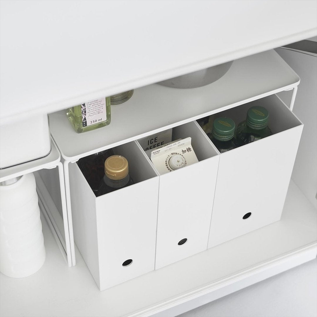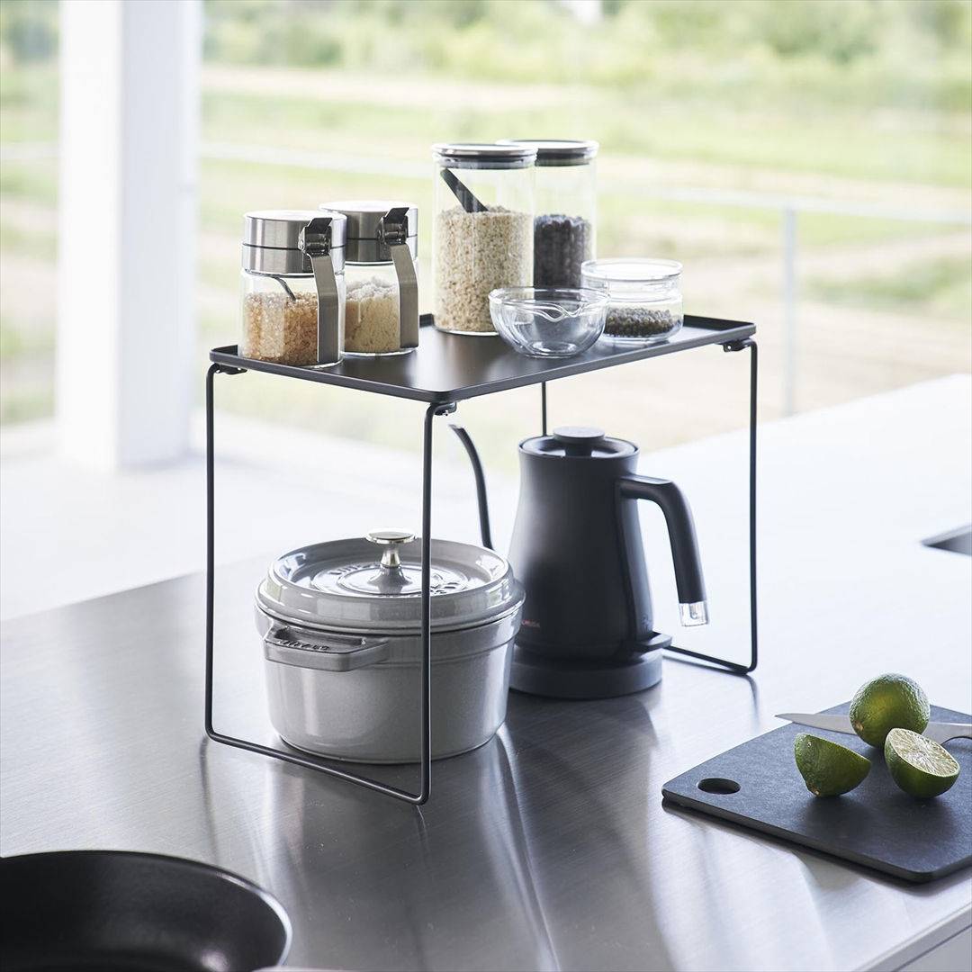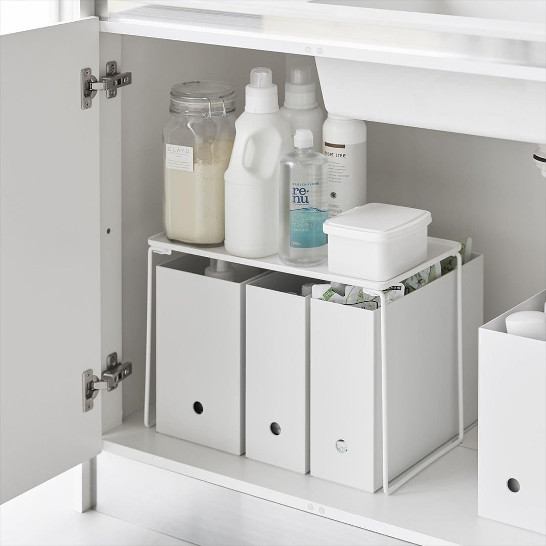 シンク下のスペースを有効活用して収納力をUP。キッチンシンク下や洗面所下のデッドスペースを収納スペースとして活用する積み重ね棚です。利用しないときは折りたたんでスリムに収納できるので邪魔になりません。キッチンシンク上に置いて調味料ラックとしてもご使用いただけます。どんなインテリアにもなじむ、2色のカラーバリエーションカラーは、明るい印象のホワイト、スタイリッシュなブラックをご用意しました。キッチンになじみやすいシンプルなモノトーンカラーです。キッチンや洗面所など設置場所の雰囲気に合わせてお好みのカラーをお選びください。スタッキングして三段収納に収納したお鍋やボウルの上に種を作ることで、いままでデッドスペースになっていた空間を新たな収納スペースとして有効活用します。二個を縦にスタッキングして使えば三段収納にも。お手持ちの収納ボックスと組み合わせれば引き出しのようにも使えます。※こちらは一個組の商品です。調味料を乗せても落下しづらいフチ付き天板天板はフチ付きになっているので上に乗せたものがすべり落ちにくい設計です。耐荷重は4kgあるため調理用油や調味料のストックなども無理なく収納できて便利。使わないときにはスリムに折りたためるので場所を取りません。使用場所に合わせて選べる2サイズ展開高さ19cm/28cmの2パターンをご用意しました。奥行きと横幅は同サイズなので、サイズ違いでも重ねたり並べたりしてご使用いただけます。設置スペースや収納物に合わせて最適なサイズをお選びください。※こちらの商品は『折り畳み積み重ね棚 L』の商品となり、『折り畳み積み重ね棚 M』の商品は別売です。