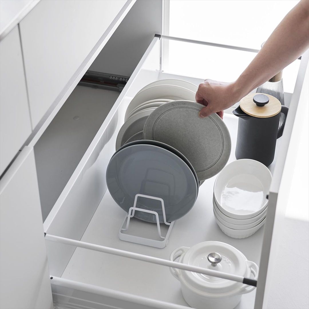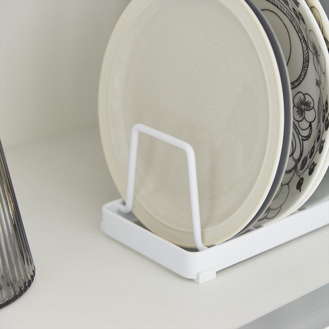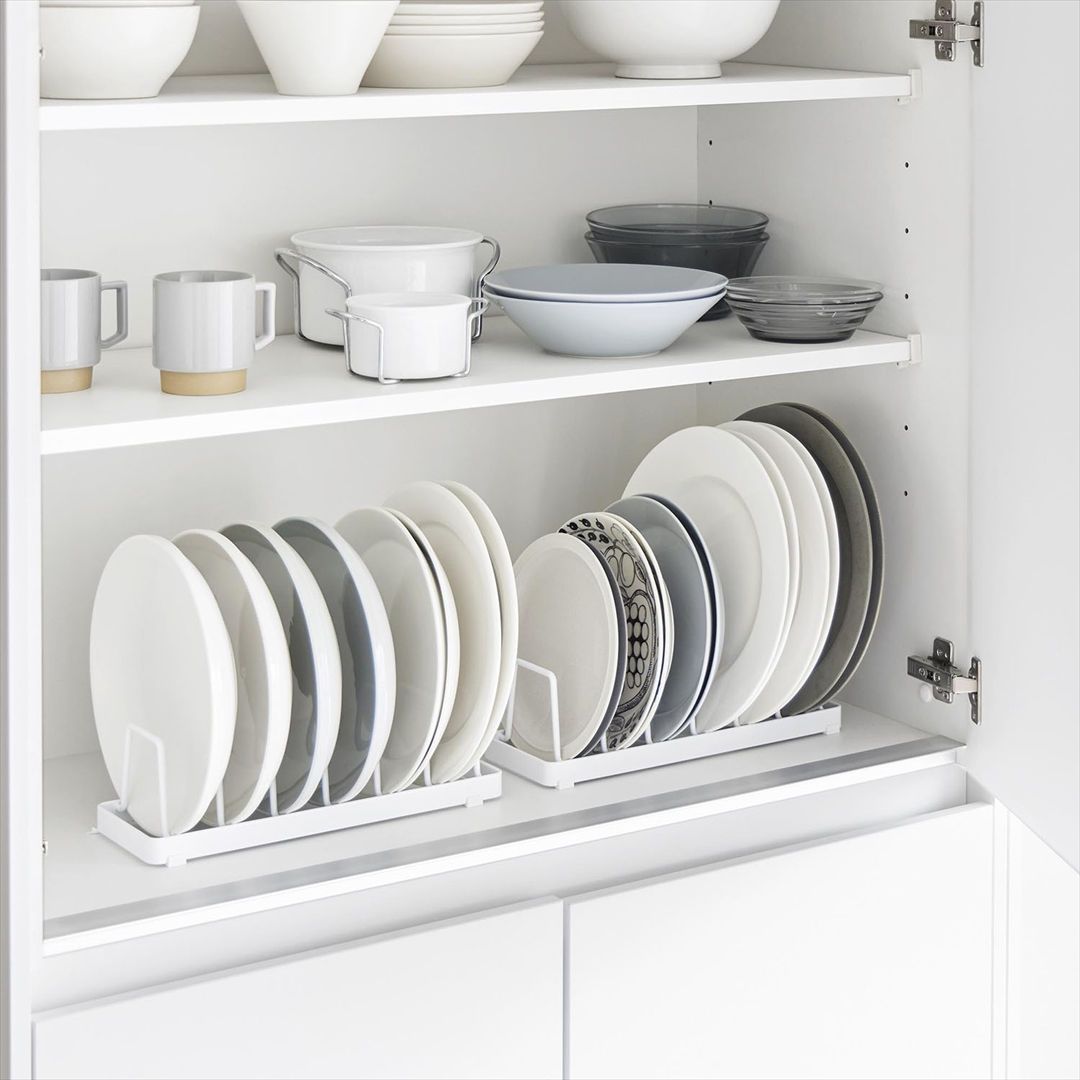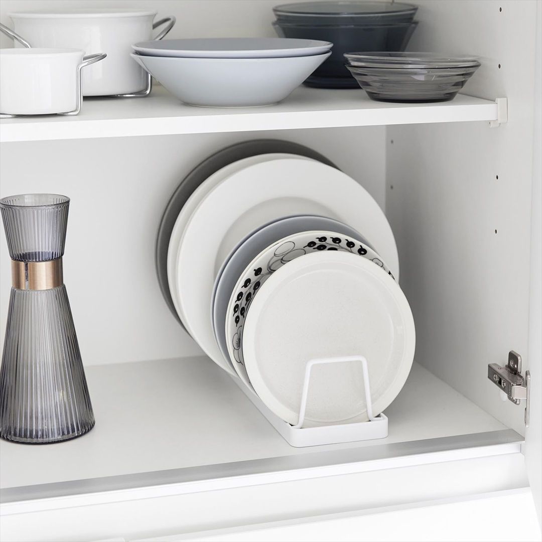 お皿を立てて収納。 取り出しやすく、しまいやすい食器棚の中で場所を取るお皿を立てて収納できるプレートスタンドです。重ねず立てて収納することで取り出しがスムーズになり、器同士がぶつかるのを防ぎます。底面にはシリコーン製の滑り止めが付属しており、スタンドが滑りにくくなるほか食器棚への傷防止にも。キッチンになじむ、2色のカラーバリエーションカラーは、明るい印象のホワイト、スタイリッシュなブラックをご用意しました。キッチンになじみやすいシンプルなモノトーンカラーです。食器棚や器のテイストに合わせてお好みのカラーをお選びください。安定感あるホールド力高さ7cmの仕切り部分が食器をしっかりと固定します。お子さま用の食器として使いやすいプラスチックや樹脂製のほか、重さのある陶磁器製の器もしっかりとおさえてくれるので安心してご使用いただけます。複数使いですっきりとした印象に六つに仕切って収納でき、お皿によっては一ヶ所に二枚など同じ種類のプレートを収納できます。大きさや形状の違う器もすっきりとまとまるから食器棚の中から目的の器をすぐに取り出せます。スタンドを複数使いして器を整理すれば食器棚の中がごちゃごちゃせず、来客時にも視線が気になりません。シリーズを揃えて統一感UP。大皿も中皿もまとめて立てられるから、平積みのお皿をいちいち動かして……という手間が省けます。同シリーズの『お椀スタンド』とあわせてご使用になれば、統一感が出て見た目がよりすっきりと。※こちらの商品は『お皿スタンド』の商品となり、『お椀スタンド』の商品は別売です。