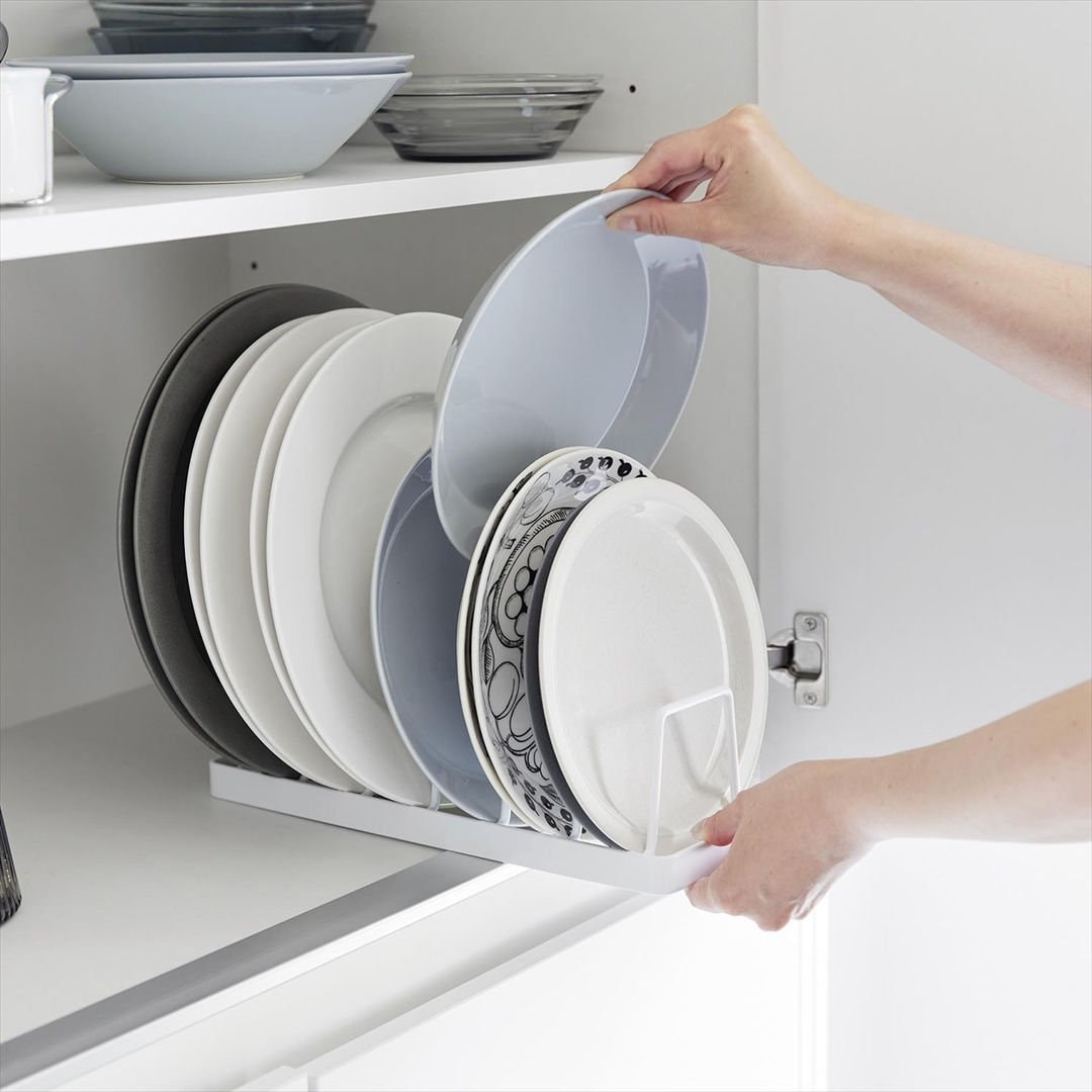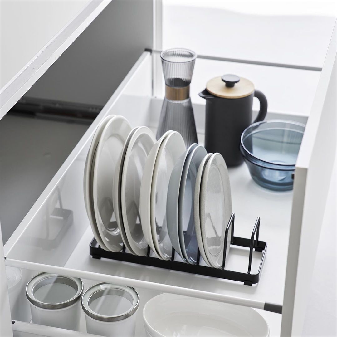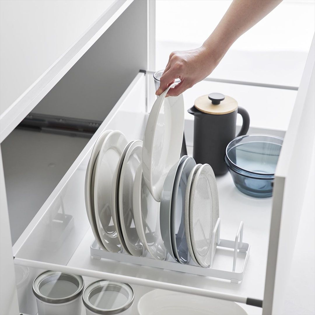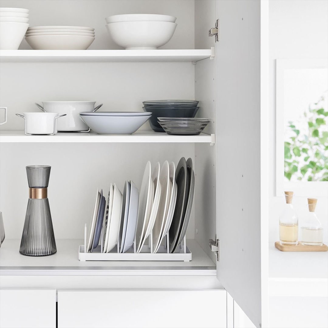 お皿を立てて収納。 取り出しやすく、しまいやすい食器棚の中で場所を取るお皿を立てて収納できるプレートスタンドです。重ねず立てて収納することで取り出しがスムーズになり、器同士がぶつかるのを防ぎます。底面にはシリコーン製の滑り止めが付属しており、スタンドが滑りにくくなるほか食器棚への傷防止にも。キッチンになじむ、2色のカラーバリエーションカラーは、明るい印象のホワイト、スタイリッシュなブラックをご用意しました。キッチンになじみやすいシンプルなモノトーンカラーです。食器棚や器のテイストに合わせてお好みのカラーをお選びください。安定感あるホールド力高さ7cmの仕切り部分が食器をしっかりと固定します。お子さま用の食器として使いやすいプラスチックや樹脂製のほか、重さのある陶磁器製の器もしっかりとおさえてくれるので安心してご使用いただけます。複数使いですっきりとした印象に六つに仕切って収納でき、お皿によっては一ヶ所に二枚など同じ種類のプレートを収納できます。大きさや形状の違う器もすっきりとまとまるから食器棚の中から目的の器をすぐに取り出せます。スタンドを複数使いして器を整理すれば食器棚の中がごちゃごちゃせず、来客時にも視線が気になりません。シリーズを揃えて統一感UP。大皿も中皿もまとめて立てられるから、平積みのお皿をいちいち動かして……という手間が省けます。同シリーズの『お椀スタンド』とあわせてご使用になれば、統一感が出て見た目がよりすっきりと。※こちらの商品は『お皿スタンド』の商品となり、『お椀スタンド』の商品は別売です。