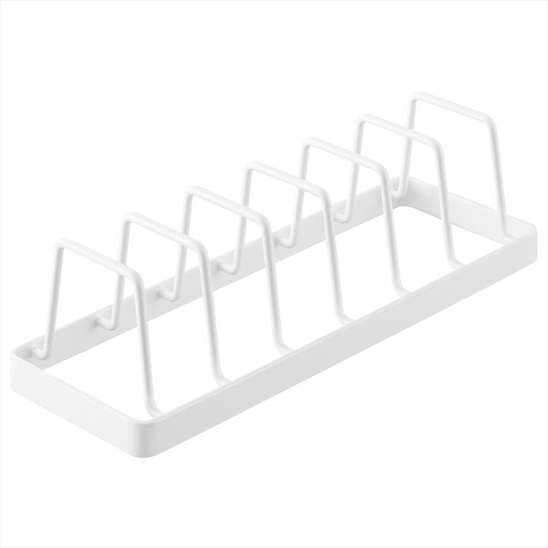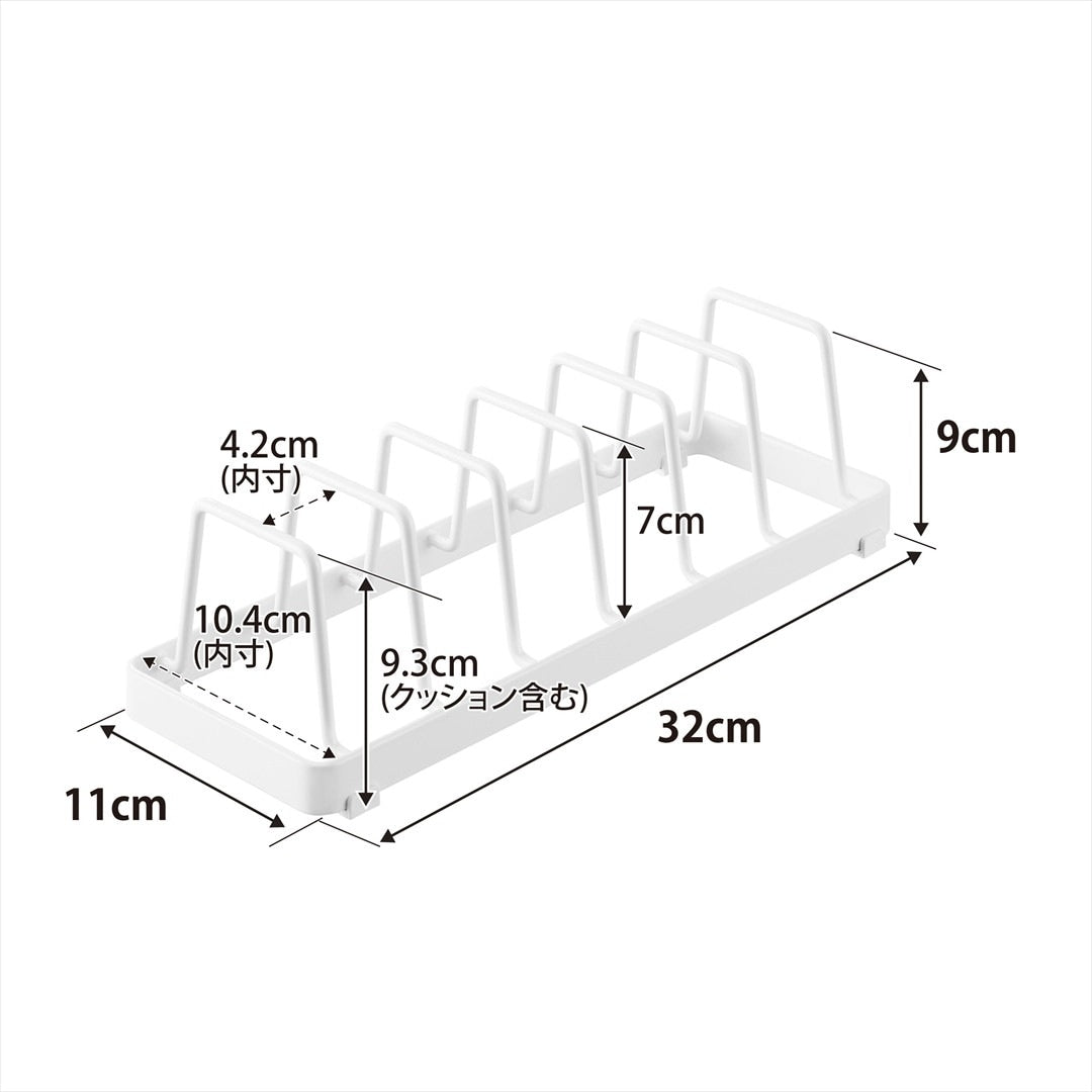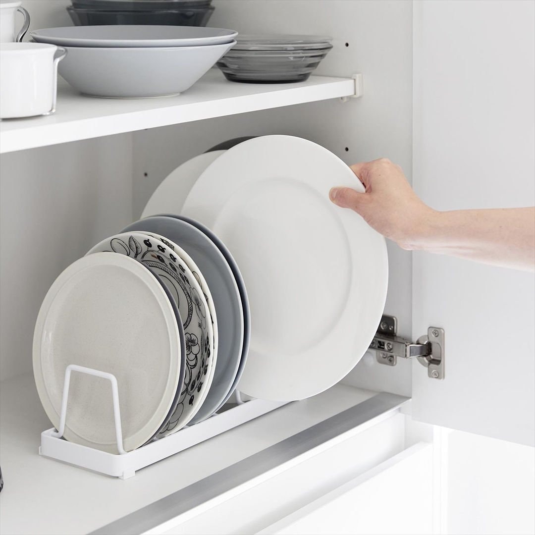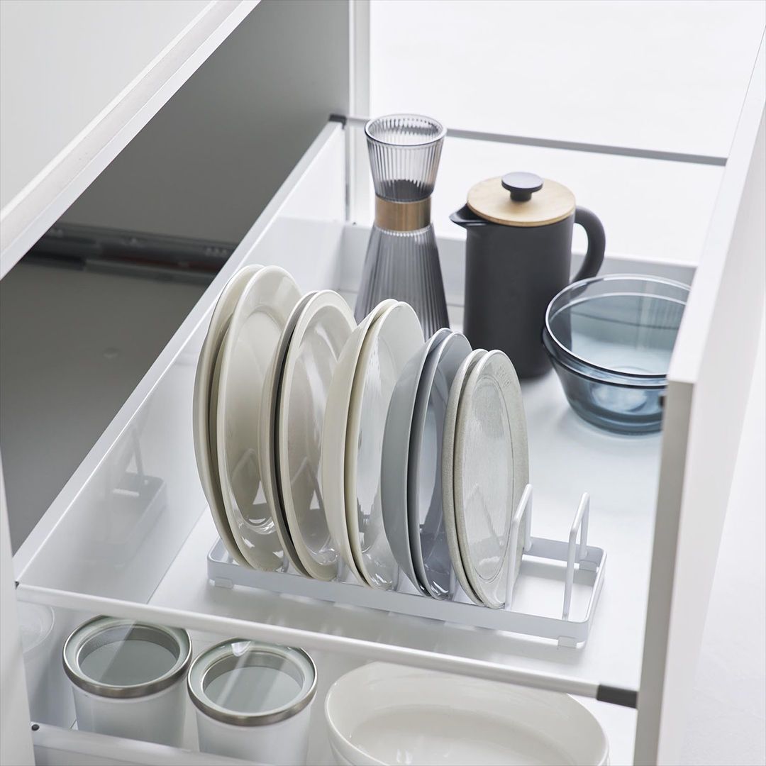 お皿を立てて収納。 取り出しやすく、しまいやすい食器棚の中で場所を取るお皿を立てて収納できるプレートスタンドです。重ねず立てて収納することで取り出しがスムーズになり、器同士がぶつかるのを防ぎます。底面にはシリコーン製の滑り止めが付属しており、スタンドが滑りにくくなるほか食器棚への傷防止にも。キッチンになじむ、2色のカラーバリエーションカラーは、明るい印象のホワイト、スタイリッシュなブラックをご用意しました。キッチンになじみやすいシンプルなモノトーンカラーです。食器棚や器のテイストに合わせてお好みのカラーをお選びください。安定感あるホールド力高さ7cmの仕切り部分が食器をしっかりと固定します。お子さま用の食器として使いやすいプラスチックや樹脂製のほか、重さのある陶磁器製の器もしっかりとおさえてくれるので安心してご使用いただけます。複数使いですっきりとした印象に六つに仕切って収納でき、お皿によっては一ヶ所に二枚など同じ種類のプレートを収納できます。大きさや形状の違う器もすっきりとまとまるから食器棚の中から目的の器をすぐに取り出せます。スタンドを複数使いして器を整理すれば食器棚の中がごちゃごちゃせず、来客時にも視線が気になりません。シリーズを揃えて統一感UP。大皿も中皿もまとめて立てられるから、平積みのお皿をいちいち動かして……という手間が省けます。同シリーズの『お椀スタンド』とあわせてご使用になれば、統一感が出て見た目がよりすっきりと。※こちらの商品は『お皿スタンド』の商品となり、『お椀スタンド』の商品は別売です。