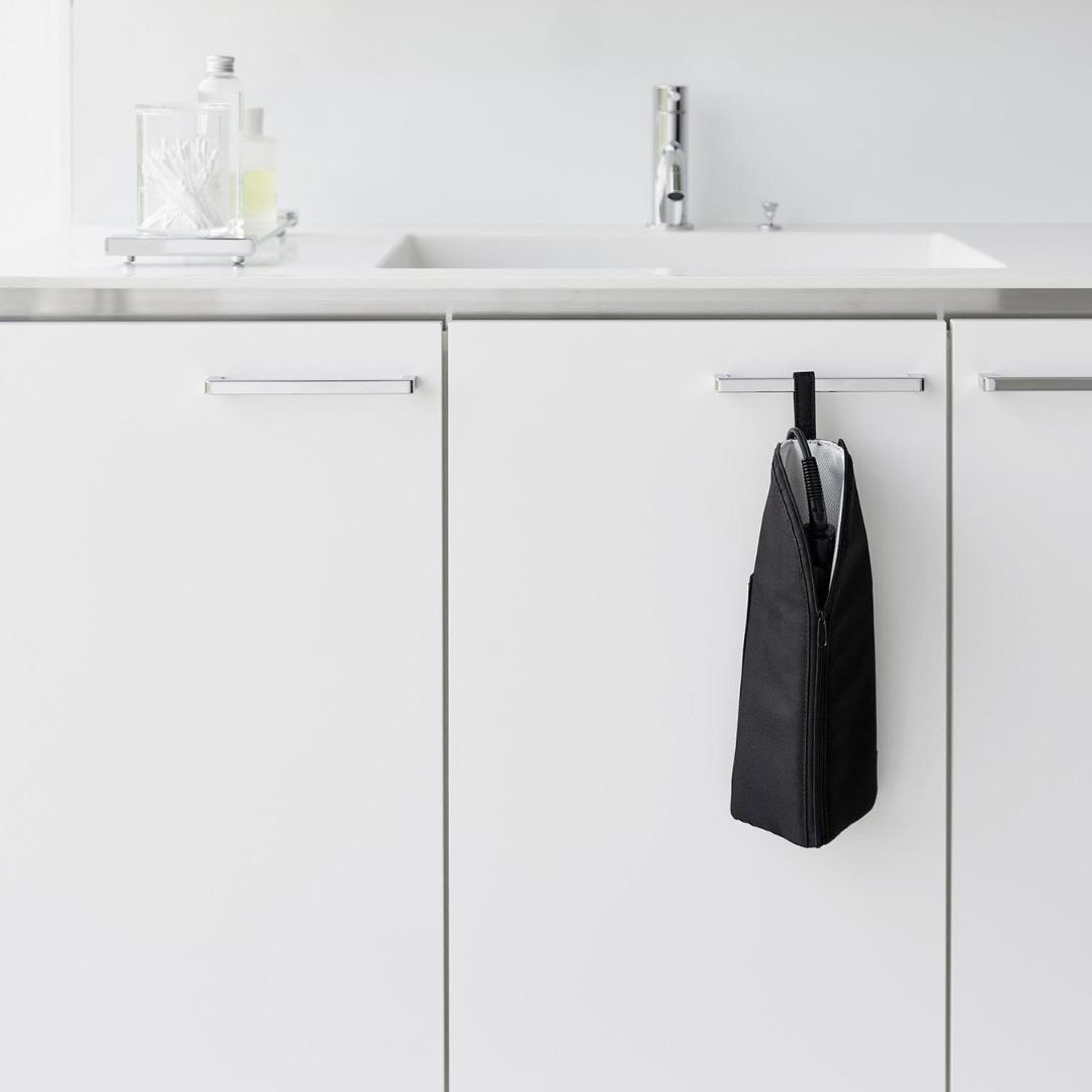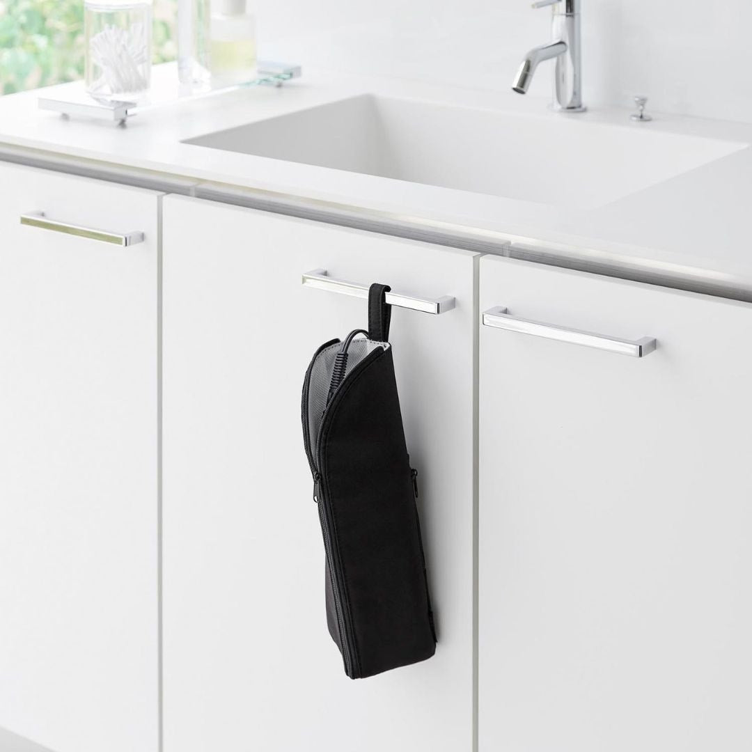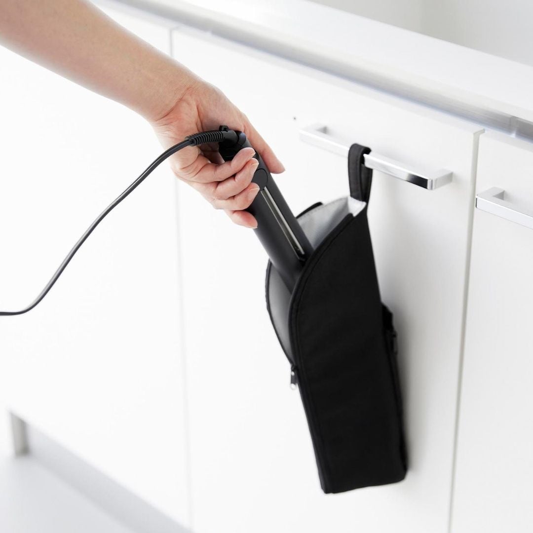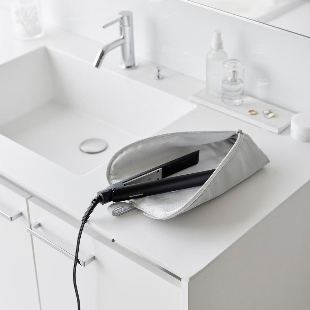 熱いアイロンをすぐに収納。 お出かけ用ポーチにもまだ熱いままのヘアーアイロンを冷める前に収納できるポーチです。スナップボタン付きストラップでタオルバーなどに引っ掛けてご使用いただけます。ポーチ背面にはコードや櫛などをまとめて収納できるポケット付き。旅行時のアイロンポーチとしても◎。スタイリッシュな、2色のカラーバリエーションカラーは、明るい印象のライトグレー、スタイリッシュなブラックをご用意しました。上品さを感じさせるシンプルなモノトーンカラーです。お持ちのアイロンのお色などに合わせてお好みのカラーをお選びください。冷めるのを待てない朝に便利耐熱性に優れた素材を使用しているため、使い終わったばかりで熱い状態のアイロンも収納できます。冷めるのを待たなくていいので、お出かけ前のバタバタしているシーンにうれしい機能。吊るしたポーチにサッと入れるだけの簡単収納で手間を感じません。洗面台を傷めずポーチで一時置きファスナーを広げた状態で洗面所に置けば、スタイリング中の一時置き場としてもご使用可能です。内側記事の耐熱温度は300℃なので厚いままの熱いままのアイロンにも安心してお使いいただけます。※ポーチ表面は耐熱生地でないため、熱いアイロンが触れないようご注意ください。アイロンに合わせて選べる2サイズ展開ミニアイロンにちょうど良いサイズ感のMサイズ、ストレートアイロン/カールアイロン/ブラシ型アイロンなど幅広く使えるLサイズの2パターンをご用意しました。お持ちのアイロンに合わせて最適なサイズをお選びください。※こちらの商品は『耐熱ヘアーアイロンポーチ M』の商品となり、『耐熱ヘアーアイロンポーチ L』の商品は別売です。
