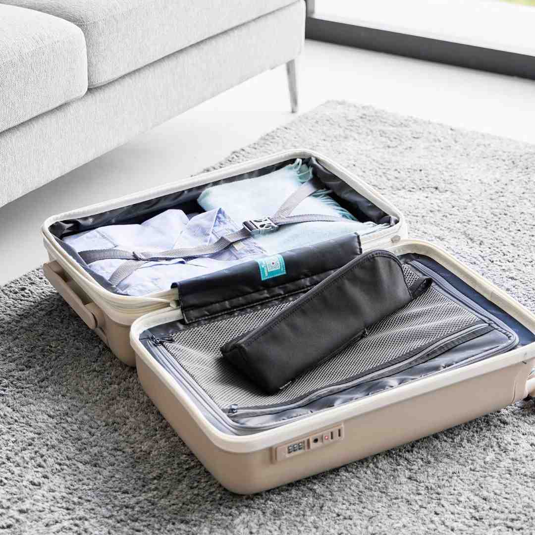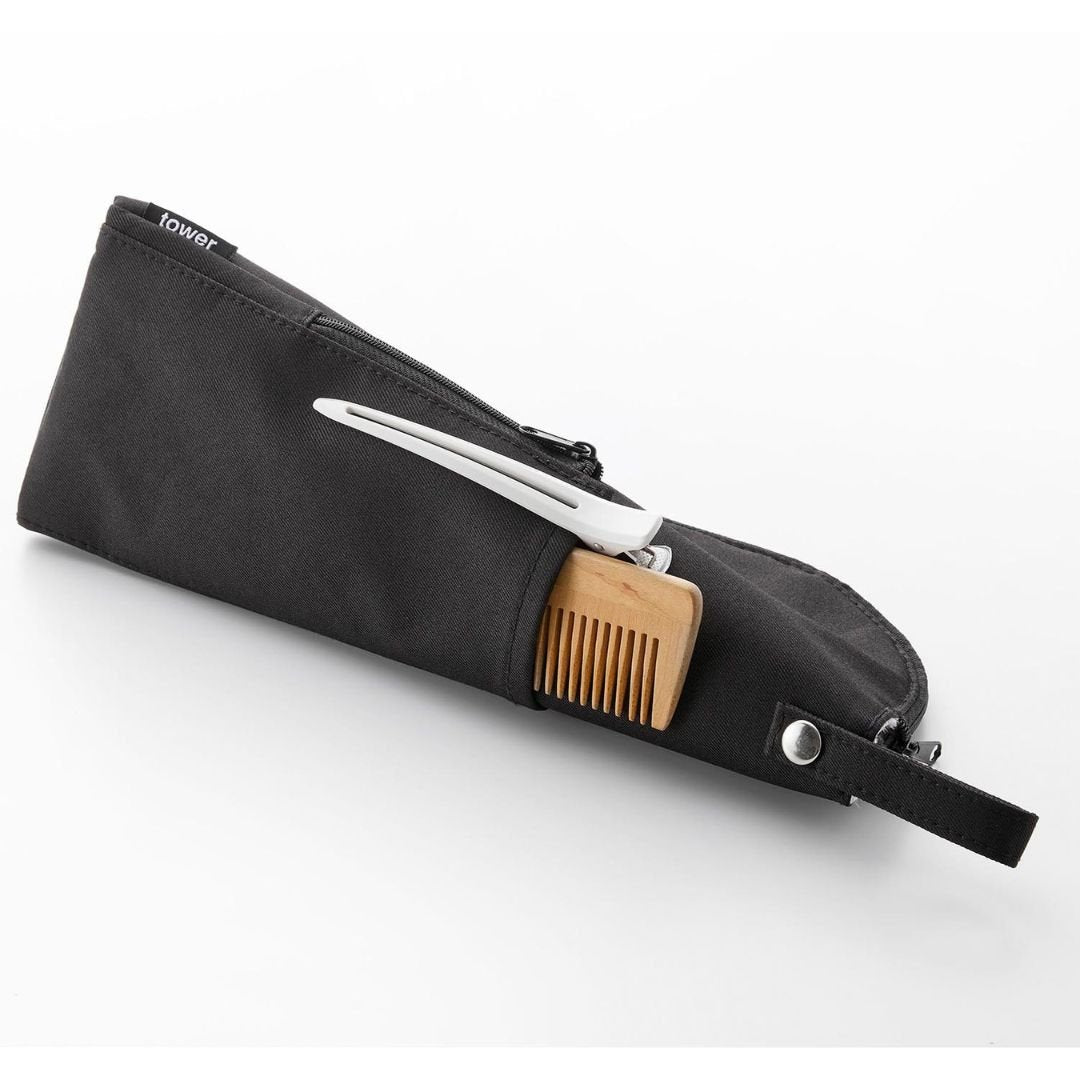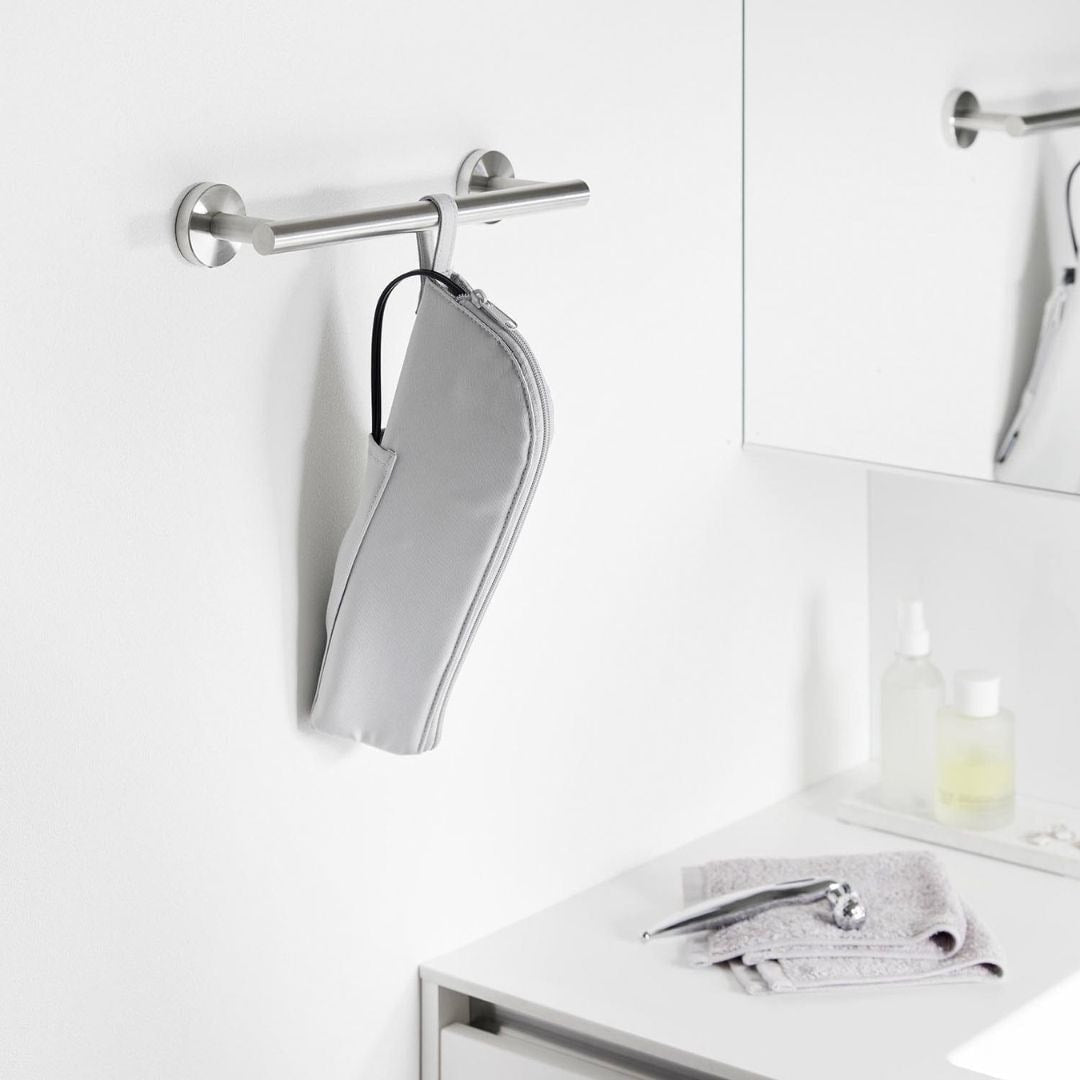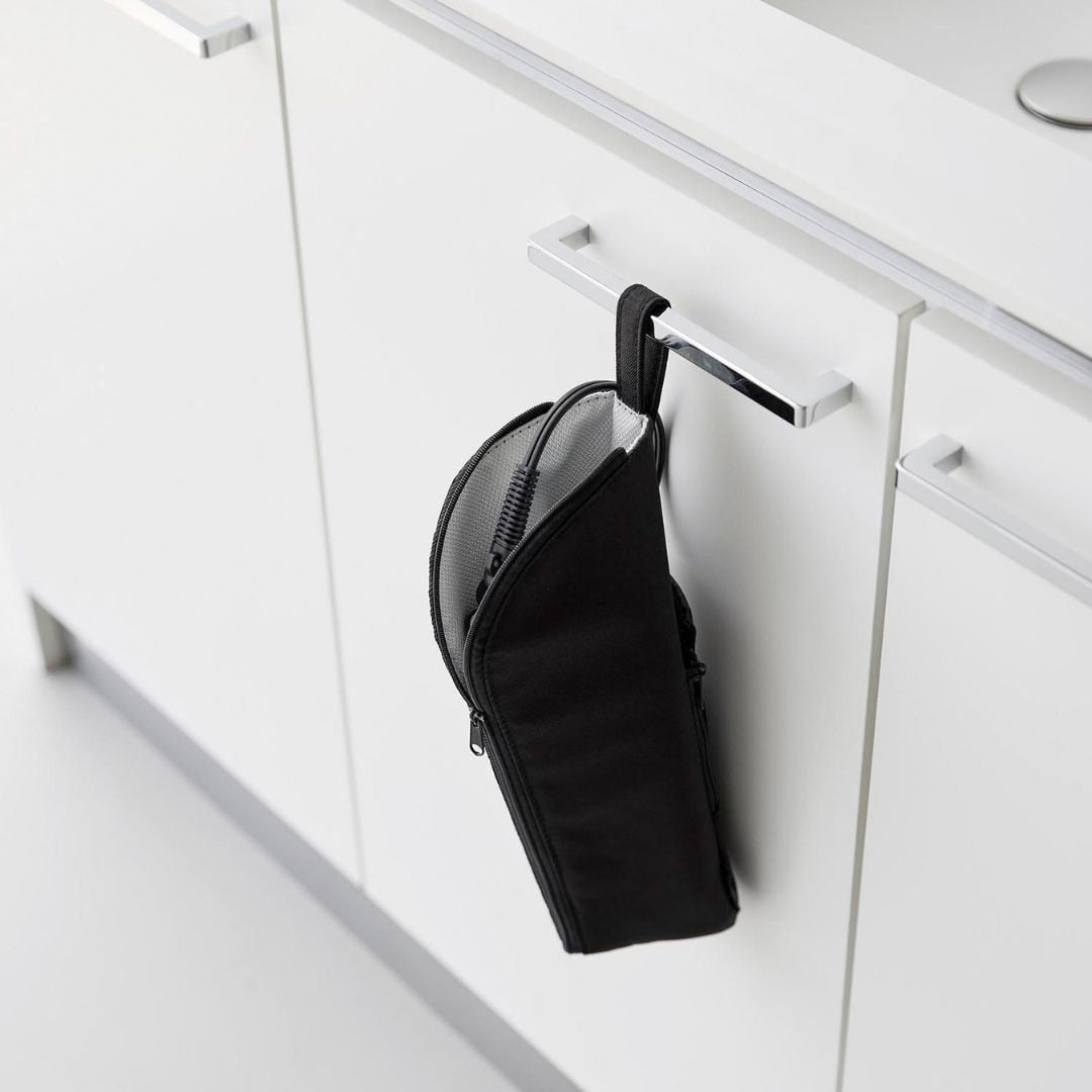 熱いアイロンをすぐに収納。 お出かけ用ポーチにもまだ熱いままのヘアーアイロンを冷める前に収納できるポーチです。スナップボタン付きストラップでタオルバーなどに引っ掛けてご使用いただけます。ポーチ背面にはコードや櫛などをまとめて収納できるポケット付き。旅行時のアイロンポーチとしても◎。スタイリッシュな、2色のカラーバリエーションカラーは、明るい印象のライトグレー、スタイリッシュなブラックをご用意しました。上品さを感じさせるシンプルなモノトーンカラーです。お持ちのアイロンのお色などに合わせてお好みのカラーをお選びください。冷めるのを待てない朝に便利耐熱性に優れた素材を使用しているため、使い終わったばかりで熱い状態のアイロンも収納できます。冷めるのを待たなくていいので、お出かけ前のバタバタしているシーンにうれしい機能。吊るしたポーチにサッと入れるだけの簡単収納で手間を感じません。洗面台を傷めずポーチで一時置きファスナーを広げた状態で洗面所に置けば、スタイリング中の一時置き場としてもご使用可能です。内側記事の耐熱温度は300℃なので厚いままの熱いままのアイロンにも安心してお使いいただけます。※ポーチ表面は耐熱生地でないため、熱いアイロンが触れないようご注意ください。アイロンに合わせて選べる2サイズ展開ミニアイロンにちょうど良いサイズ感のMサイズ、ストレートアイロン/カールアイロン/ブラシ型アイロンなど幅広く使えるLサイズの2パターンをご用意しました。お持ちのアイロンに合わせて最適なサイズをお選びください。※こちらの商品は『耐熱ヘアーアイロンポーチ M』の商品となり、『耐熱ヘアーアイロンポーチ L』の商品は別売です。