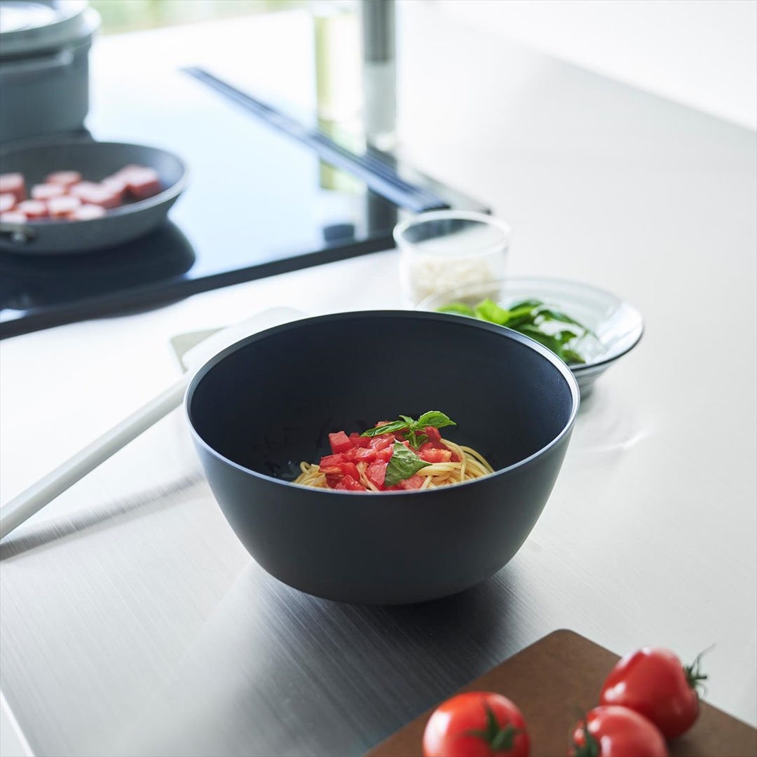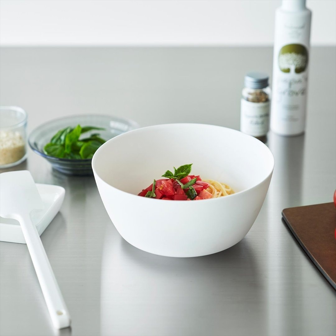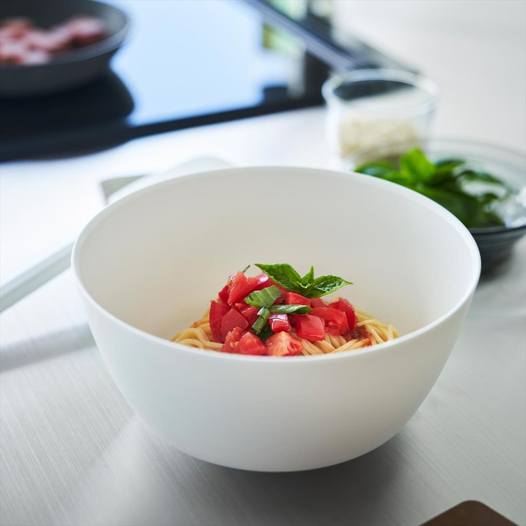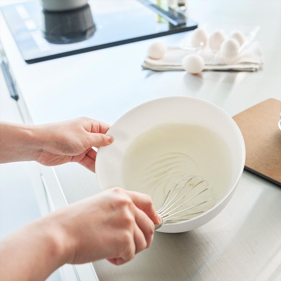 安定感抜群。 斜めがキープできる万能ボウル材料を混ぜ合わせるときに斜めの角度をキープしてくれるから手首が疲れにくい。卵や生クリームの混ぜ合わせがしやすくなった万能調理ボウルです。電子レンジにも使える耐熱タイプなのであらゆる調理に対応可能。スタイリッシュなデザインだから器としてそのまま食卓にも出せます。キッチンになじむ、2色のカラーバリエーションカラーは、清潔感のあるホワイト、シックなブラックをご用意しました。キッチンになじみやすいシンプルなモノトーンカラーです。お手持ちの調理ツールやテーブルウェアに合わせてお好みのカラーをお選びください。軽い力で角度をキープできる底面が傾斜構造になっていて、ボウルを傾けた際に斜めをキープしてくれる設計です。軽く持つだけで角度が保たれるので抑えている手首に負担が掛かりにくいのがうれしいポイント。混ぜている最中に斜めに傾けすぎて中身がこぼれる、なんてアクシデントを起こしづらく作業がスムーズです。電子レンジ・食洗機対応で使い勝手◎電子レンジにもご使用いただける耐熱ボウルです。電子レンジでの野菜の下茹でや、お菓子づくりでよく使う溶かしバターを作ったりもできます。ガラス製とは異なり非常に軽量なので重さを感じづらく扱いやすいです。食洗機にも対応しているのでお手入れもラクちんです。用途に合わせて選べる3サイズ展開調味料の混ぜ合わせやドレッシング作りにぴったりなSサイズ、野菜やフルーツなどを洗うのに程よいサイズ感のMサイズ、かさばる葉物野菜や家族でシェアするのにちょうど良いLサイズの3サイズをご用意しました。ご使用シーンに合わせて最適なサイズをお選びください。※こちらの商品は『傾けて混ぜやすい調理ボウル M 電子レンジ対応』の商品となり、他サイズは別ページにてご用意しております。