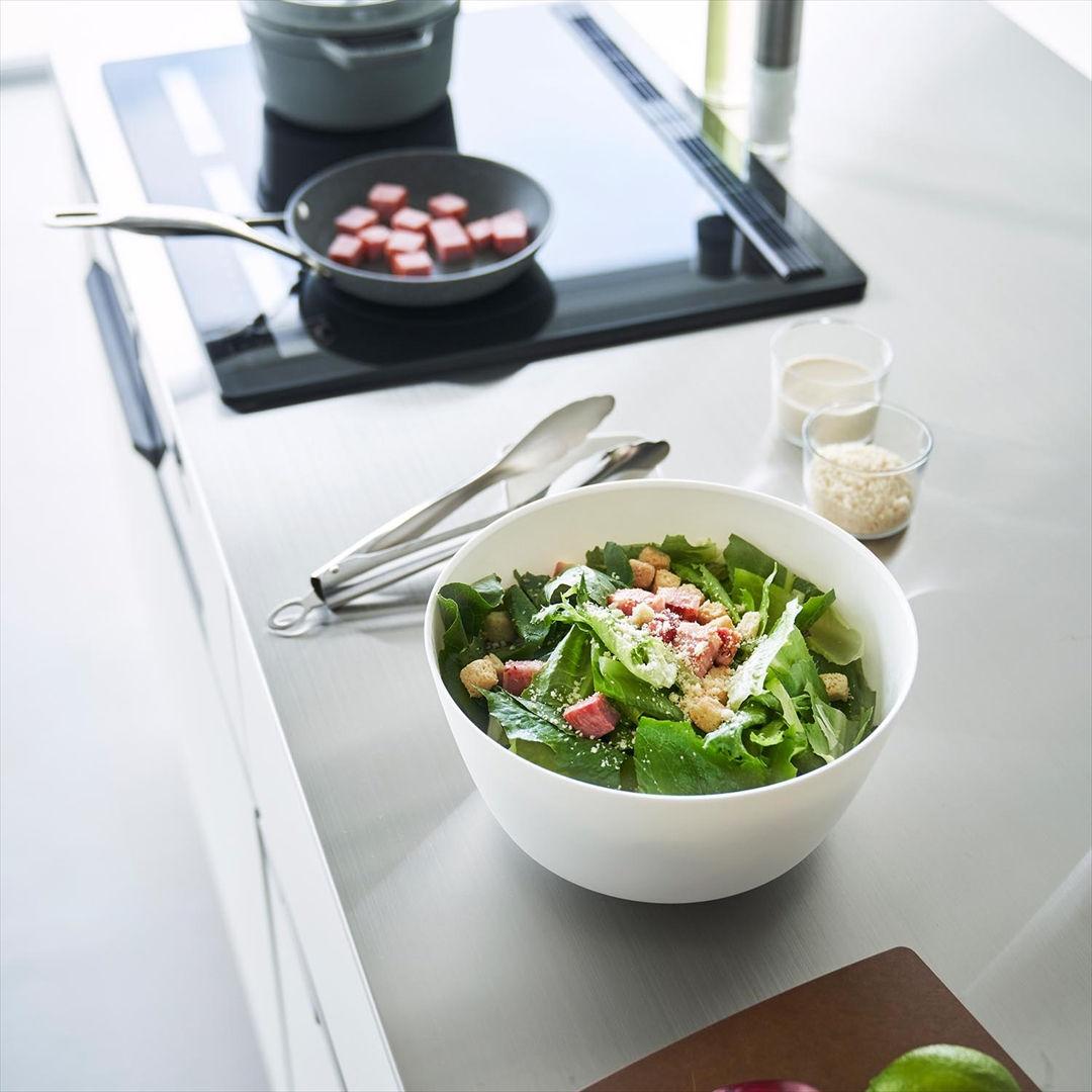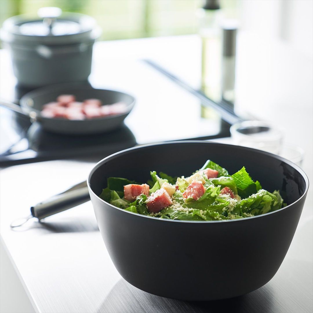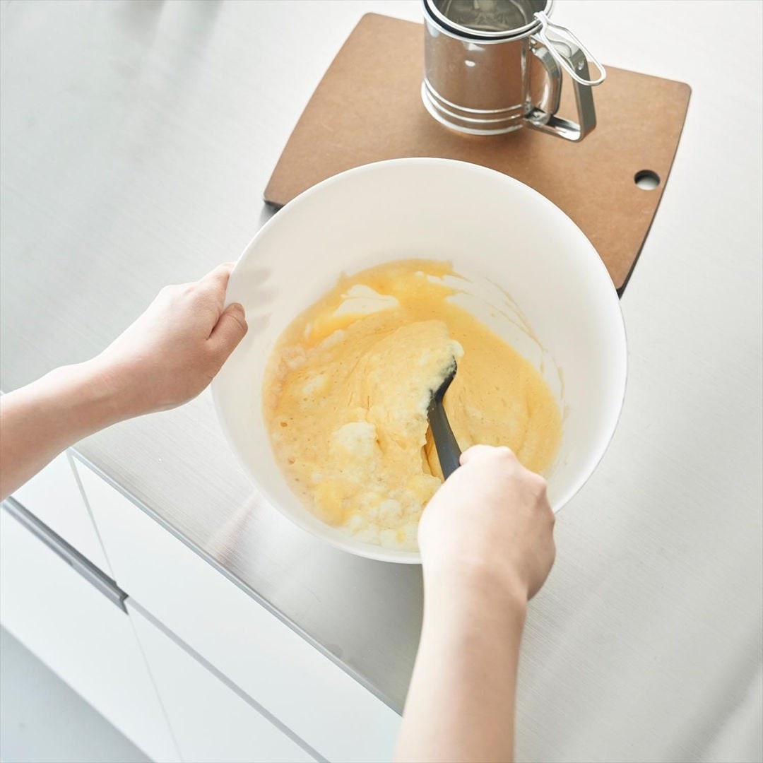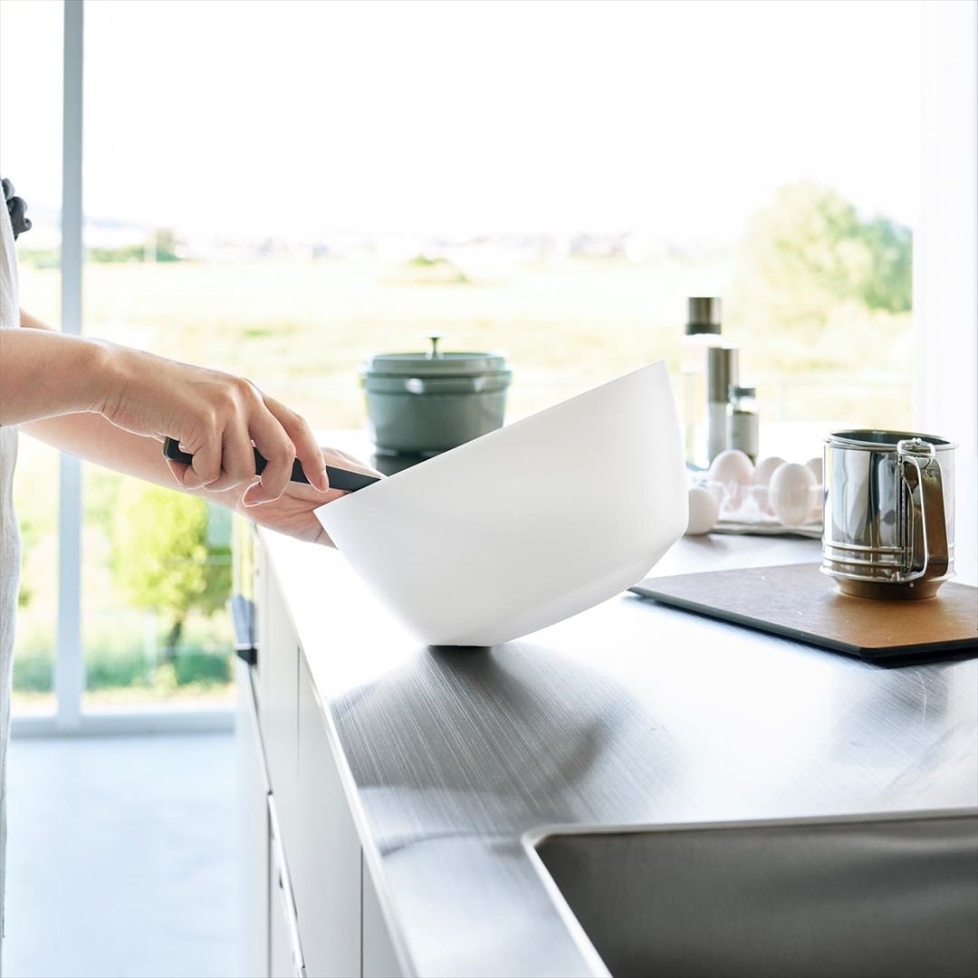 安定感抜群。 斜めがキープできる万能ボウル材料を混ぜ合わせるときに斜めの角度をキープしてくれるから手首が疲れにくい。卵や生クリームの混ぜ合わせがしやすくなった万能調理ボウルです。電子レンジにも使える耐熱タイプなのであらゆる調理に対応可能。スタイリッシュなデザインだから器としてそのまま食卓にも出せます。キッチンになじむ、2色のカラーバリエーションカラーは、清潔感のあるホワイト、シックなブラックをご用意しました。キッチンになじみやすいシンプルなモノトーンカラーです。お手持ちの調理ツールやテーブルウェアに合わせてお好みのカラーをお選びください。軽い力で角度をキープできる底面が傾斜構造になっていて、ボウルを傾けた際に斜めをキープしてくれる設計です。軽く持つだけで角度が保たれるので抑えている手首に負担が掛かりにくいのがうれしいポイント。混ぜている最中に斜めに傾けすぎて中身がこぼれる、なんてアクシデントを起こしづらく作業がスムーズです。電子レンジ・食洗機対応で使い勝手◎電子レンジにもご使用いただける耐熱ボウルです。電子レンジでの野菜の下茹でや、お菓子づくりでよく使う溶かしバターを作ったりもできます。ガラス製とは異なり非常に軽量なので重さを感じづらく扱いやすいです。食洗機にも対応しているのでお手入れもラクちんです。用途に合わせて選べる3サイズ展開調味料の混ぜ合わせやドレッシング作りにぴったりなSサイズ、野菜やフルーツなどを洗うのに程よいサイズ感のMサイズ、かさばる葉物野菜や家族でシェアするのにちょうど良いLサイズの3サイズをご用意しました。ご使用シーンに合わせて最適なサイズをお選びください。※こちらの商品は『傾けて混ぜやすい調理ボウル L 電子レンジ対応』の商品となり、他サイズは別ページにてご用意しております。
