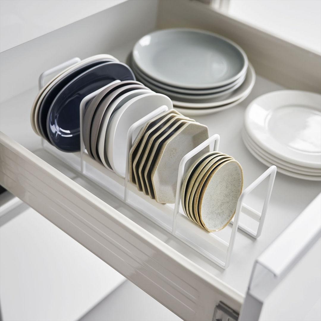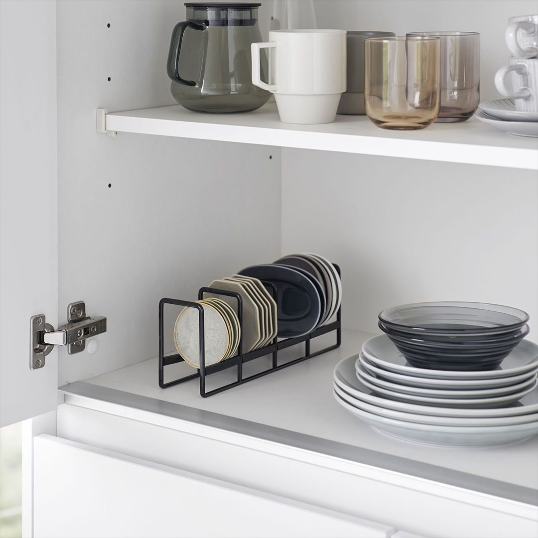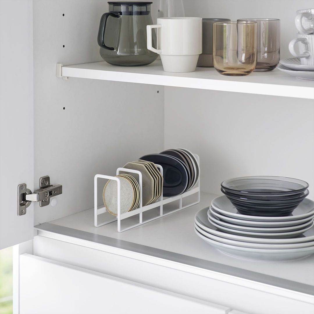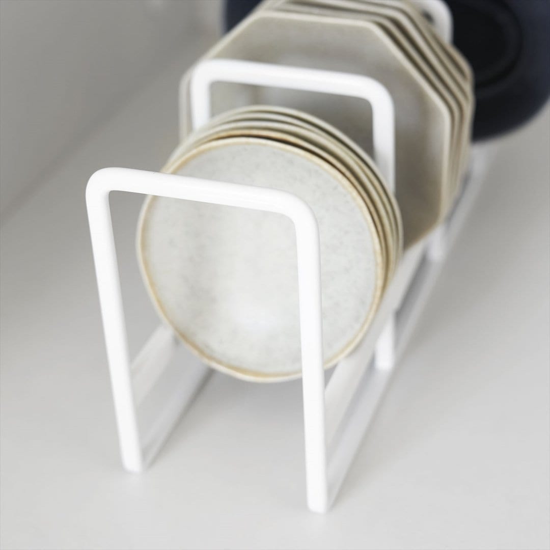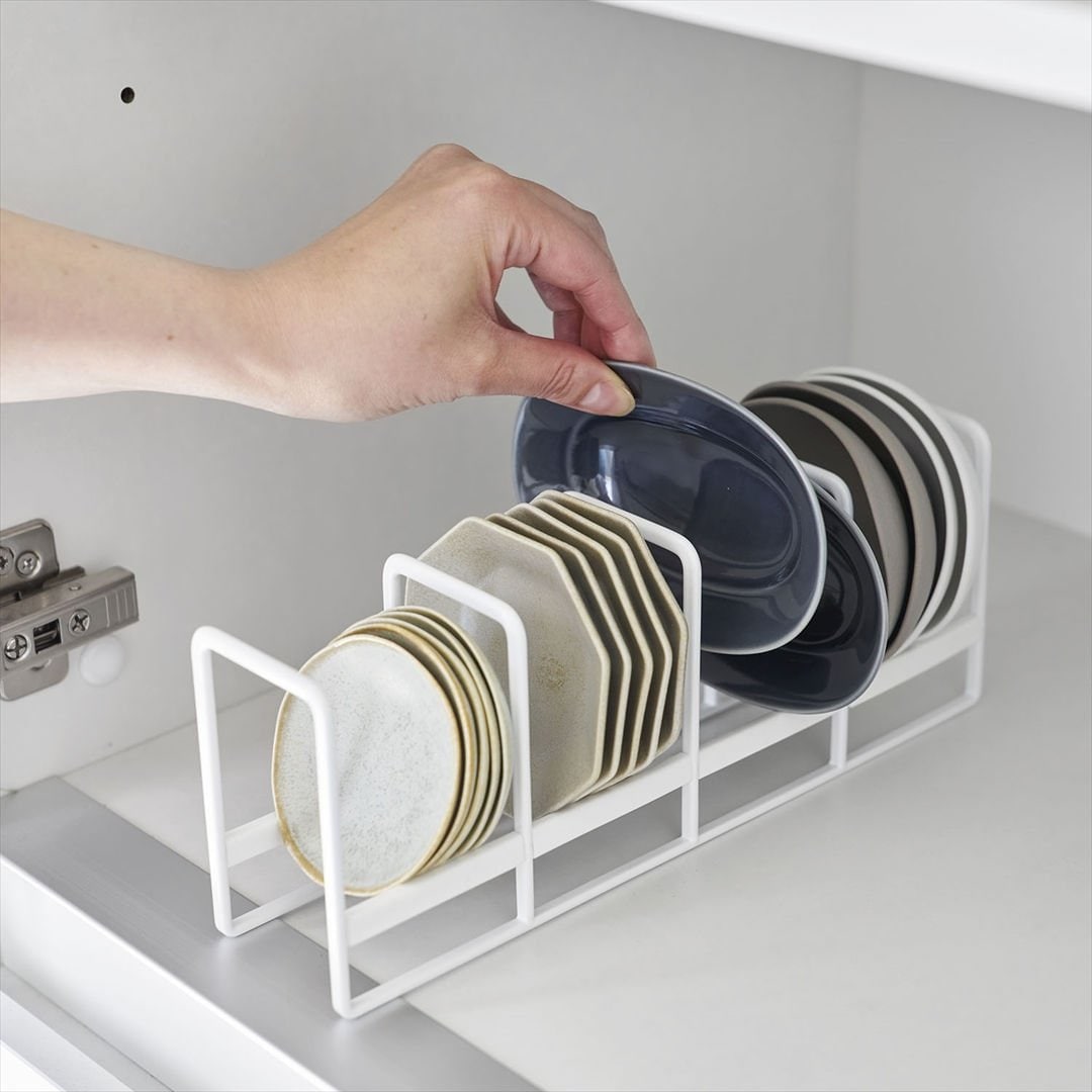 小さな豆皿を立てて収納。 取り出しやすく、しまいやすい食器棚の中で場所を取るお皿を立てて収納できる豆皿&小鉢用ラックです。重ねず立てて収納することで取り出しがスムーズに。ラックの左右にはシリコーン製のストッパーが付き。小さくて軽量な豆皿をしっかりと固定します。キッチンになじむ、2色のカラーバリエーションカラーは、明るい印象のホワイト、スタイリッシュなブラックをご用意しました。キッチンになじみやすいシンプルなモノトーンカラーです。食器棚や器のテイストに合わせてお好みのカラーをお選びください。引き出しの中にも収まるコンパクトさ高さ10cmのコンパクトさだから、引き出しでもお使いいただけます。引き出しを開けたときにパッと一目で種類と枚数がわかるから、どの器を使おうか判断しやすくなります。料理や相手に合わせての器選びが楽しく♪複数使いですっきりとした印象に四つに仕切られていて、豆皿を種類ごとに分類して収納できます。大きさや形状の違う器もすっきりとまとまるから食器棚の中から目的の器をすぐに取り出せます。ラックを複数使いして器を整理すれば食器棚の中がごちゃごちゃせず、来客時にも視線が気になりません。シリーズを揃えて統一感UP。一つの仕切りの中には豆皿が四~五枚ほど収納可能です。同シリーズの『お椀&お茶碗収納ラック』とあわせてご使用になれば、統一感が出て見た目がよりすっきりと。※こちらの商品は『豆皿収納ラック』の商品となり、『お椀&お茶碗収納ラック』の商品は別売です。