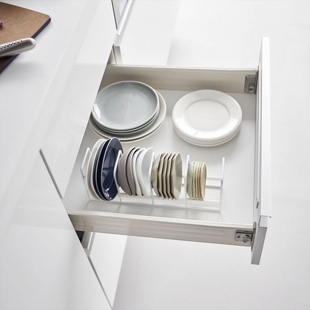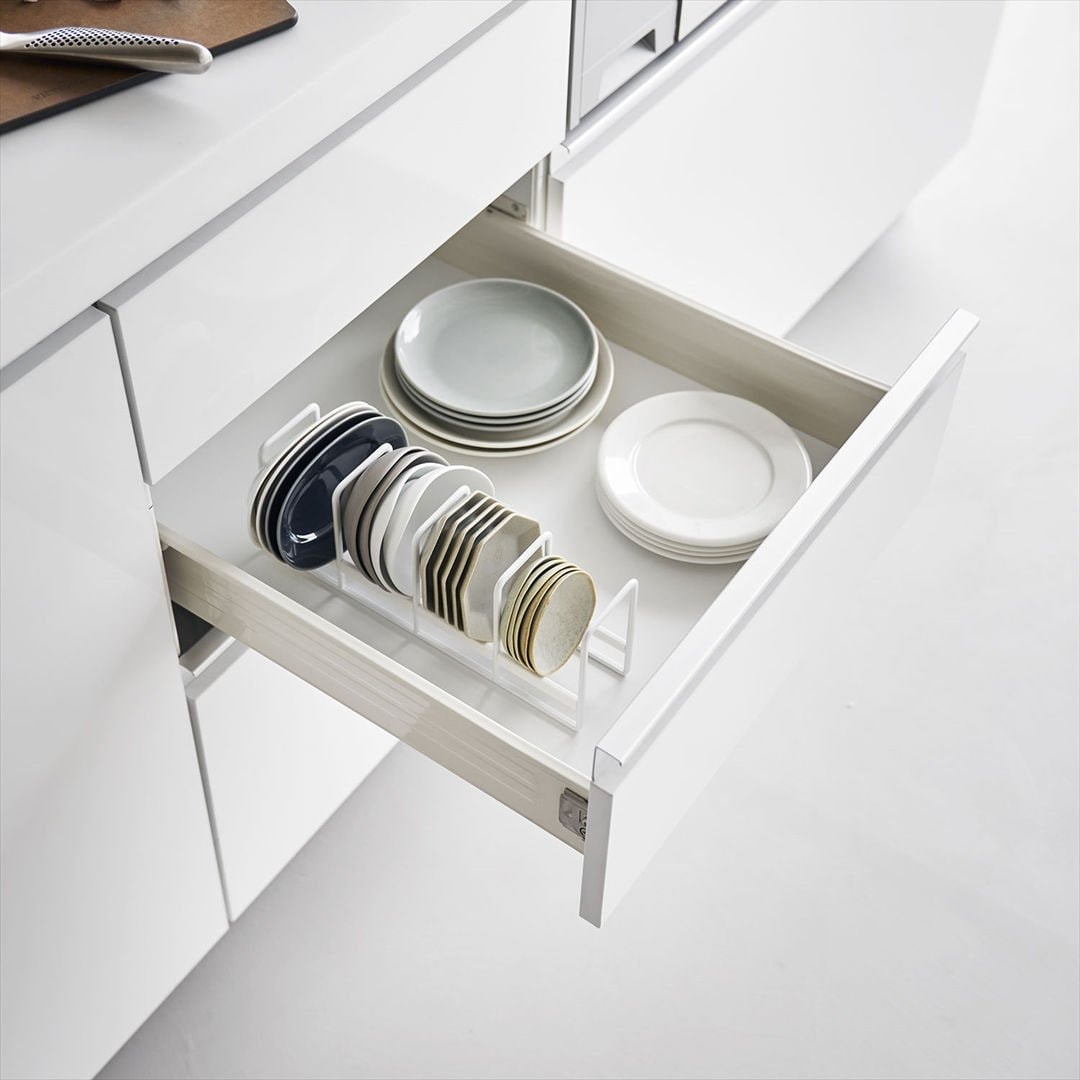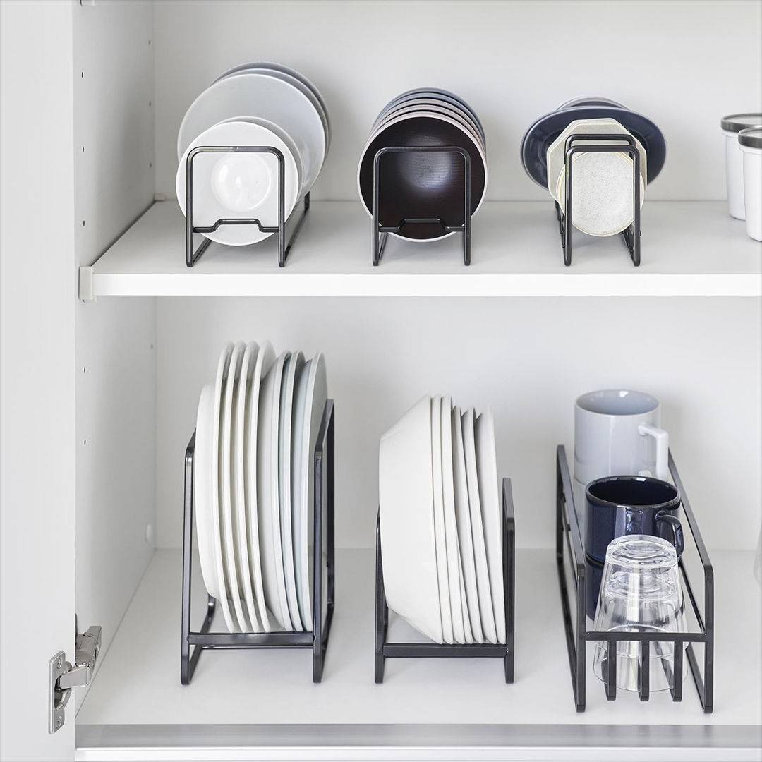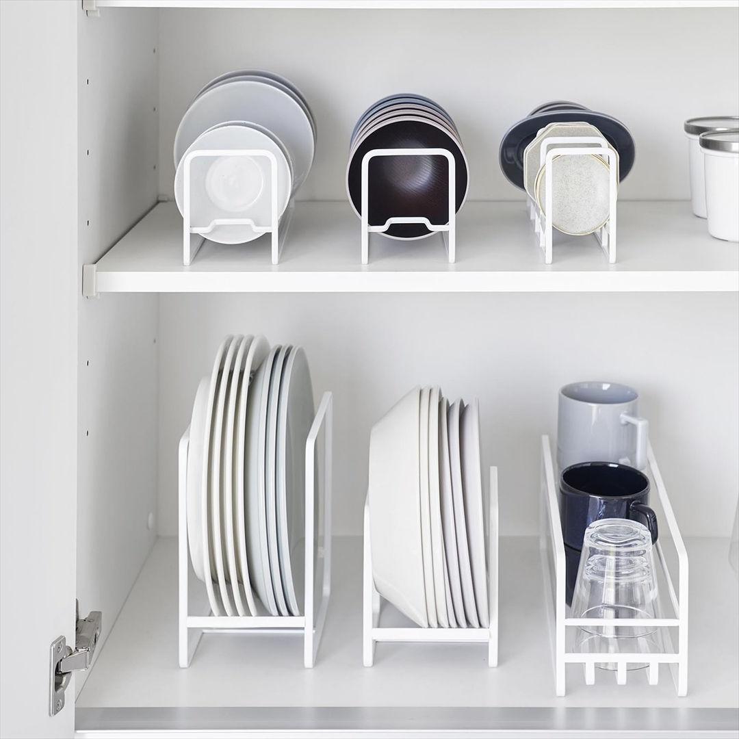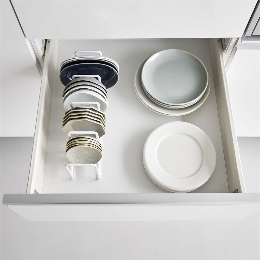 小さな豆皿を立てて収納。 取り出しやすく、しまいやすい食器棚の中で場所を取るお皿を立てて収納できる豆皿&小鉢用ラックです。重ねず立てて収納することで取り出しがスムーズに。ラックの左右にはシリコーン製のストッパーが付き。小さくて軽量な豆皿をしっかりと固定します。キッチンになじむ、2色のカラーバリエーションカラーは、明るい印象のホワイト、スタイリッシュなブラックをご用意しました。キッチンになじみやすいシンプルなモノトーンカラーです。食器棚や器のテイストに合わせてお好みのカラーをお選びください。引き出しの中にも収まるコンパクトさ高さ10cmのコンパクトさだから、引き出しでもお使いいただけます。引き出しを開けたときにパッと一目で種類と枚数がわかるから、どの器を使おうか判断しやすくなります。料理や相手に合わせての器選びが楽しく♪複数使いですっきりとした印象に四つに仕切られていて、豆皿を種類ごとに分類して収納できます。大きさや形状の違う器もすっきりとまとまるから食器棚の中から目的の器をすぐに取り出せます。ラックを複数使いして器を整理すれば食器棚の中がごちゃごちゃせず、来客時にも視線が気になりません。シリーズを揃えて統一感UP。一つの仕切りの中には豆皿が四~五枚ほど収納可能です。同シリーズの『お椀&お茶碗収納ラック』とあわせてご使用になれば、統一感が出て見た目がよりすっきりと。※こちらの商品は『豆皿収納ラック』の商品となり、『お椀&お茶碗収納ラック』の商品は別売です。