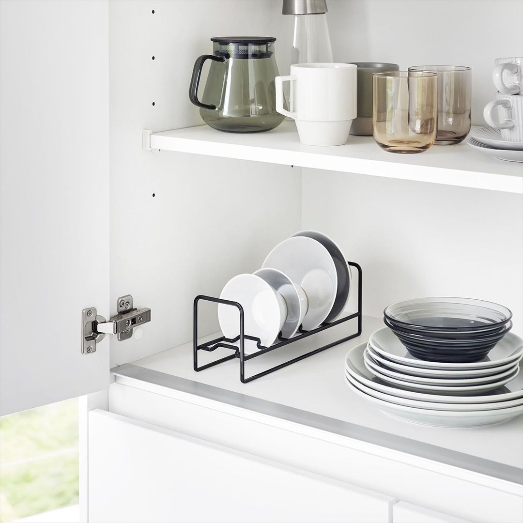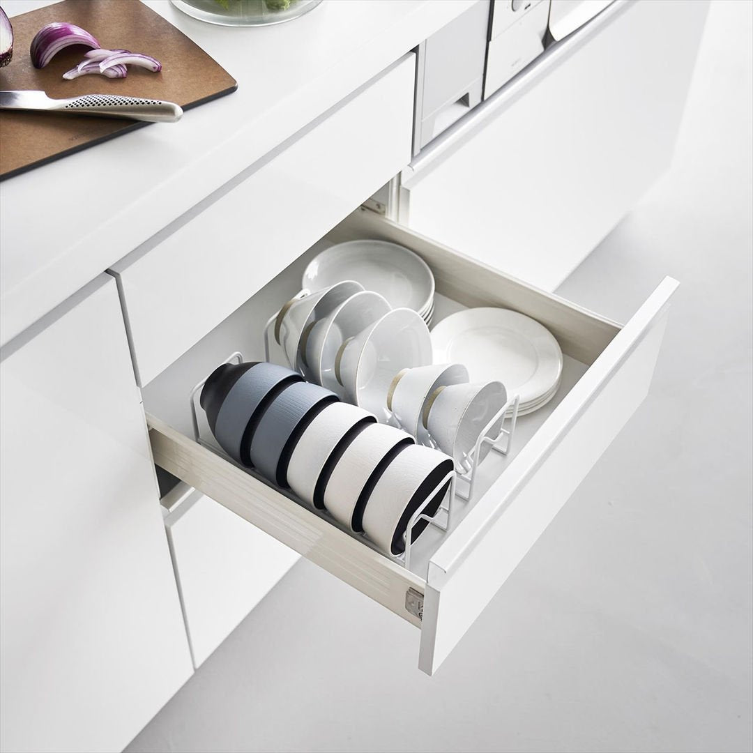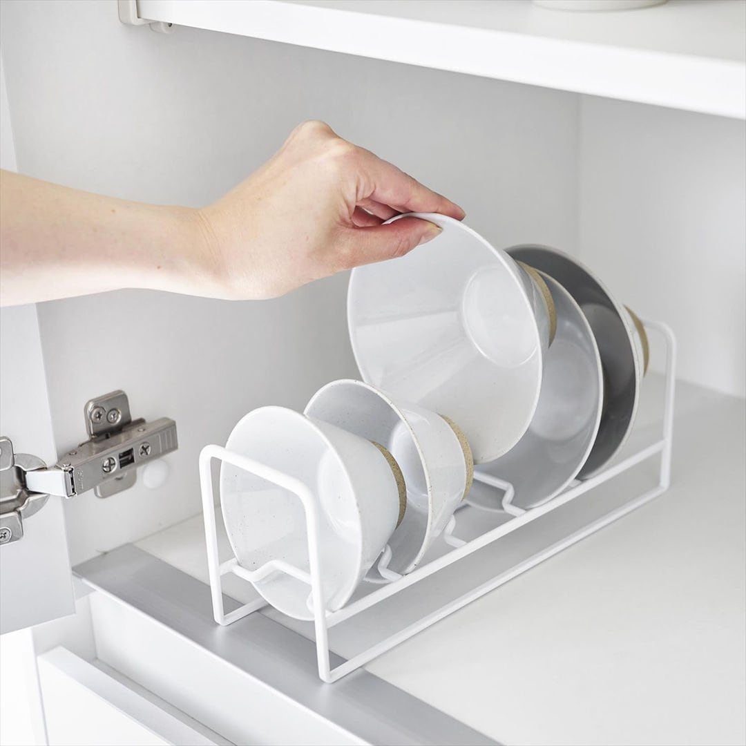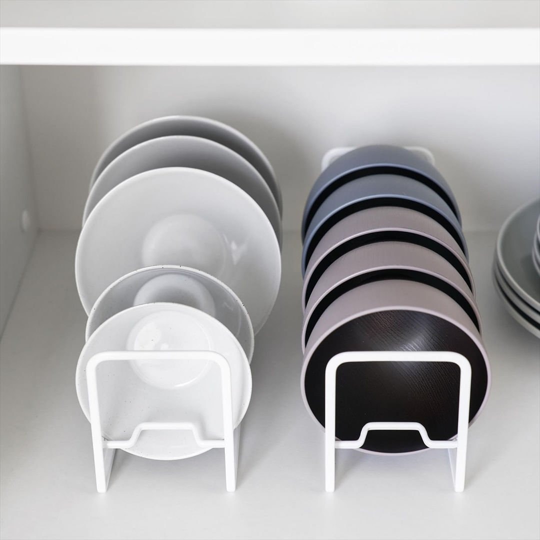 お茶碗と汁椀を立てて収納。 引き出し収納も可能お茶碗や汁椀を立てて収納できるお椀スタンドです。重ねず立てて収納することで取り出しがスムーズで、器同士がぶつかるのを防ぎます。棚への収納はもちろん、引き出し内でのご使用もおすすめです。キッチンになじむ、2色のカラーバリエーションカラーは、明るい印象のホワイト、スタイリッシュなブラックをご用意しました。キッチンになじみやすいシンプルなモノトーンカラーです。食器棚や器のテイストに合わせてお好みのカラーをお選びください。安定感あるホールド力斜めに立ち上がった仕切り部分が食器をしっかりと固定します。お子さま用の食器として使いやすいプラスチックや樹脂製のほか、重さのある陶磁器製の器もしっかりとおさえてくれるので安心してご使用いただけます。お茶碗と汁椀で分けて収納も最大五個の食器を収納可能です。大きさや形状の違う器もすっきりとまとまるから食器棚の中から目的の器をすぐに取り出せます。お茶碗用・汁椀用とラッを分けたりしながら整理すれば食器棚の中がごちゃごちゃせず、来客時にも視線が気になりません。シリーズを揃えて統一感UP。一つの仕切りの中には豆皿が四~五枚ほど収納可能です。同シリーズの『豆皿収納ラック』とあわせてご使用になれば、統一感が出て見た目がよりすっきりと。※こちらの商品は『お椀&お茶碗収納ラック』の商品となり、『豆皿収納ラック』の商品は別売です。