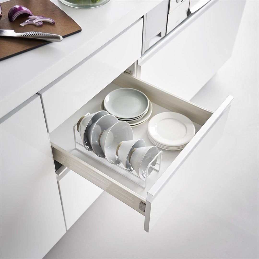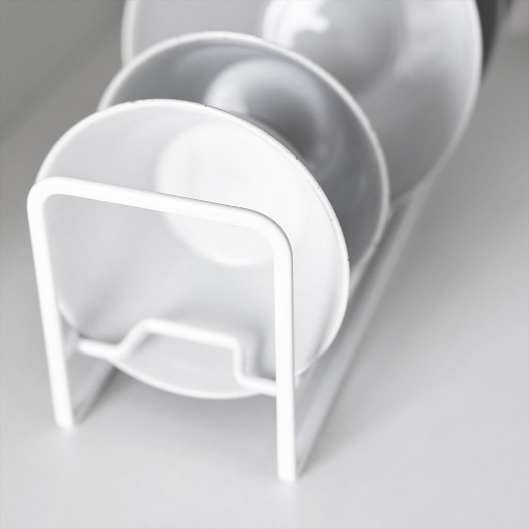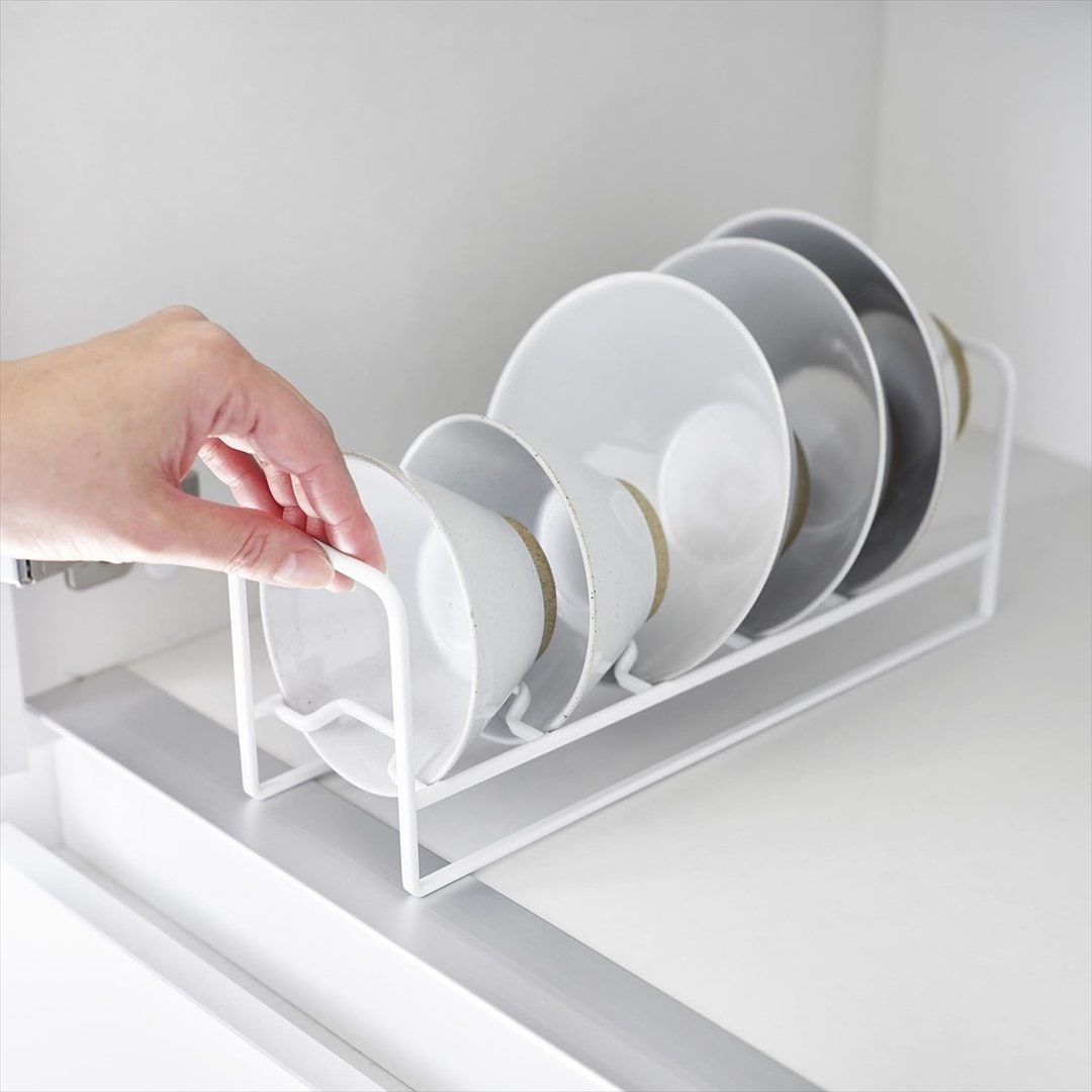 お茶碗と汁椀を立てて収納。 引き出し収納も可能お茶碗や汁椀を立てて収納できるお椀スタンドです。重ねず立てて収納することで取り出しがスムーズで、器同士がぶつかるのを防ぎます。棚への収納はもちろん、引き出し内でのご使用もおすすめです。キッチンになじむ、2色のカラーバリエーションカラーは、明るい印象のホワイト、スタイリッシュなブラックをご用意しました。キッチンになじみやすいシンプルなモノトーンカラーです。食器棚や器のテイストに合わせてお好みのカラーをお選びください。安定感あるホールド力斜めに立ち上がった仕切り部分が食器をしっかりと固定します。お子さま用の食器として使いやすいプラスチックや樹脂製のほか、重さのある陶磁器製の器もしっかりとおさえてくれるので安心してご使用いただけます。お茶碗と汁椀で分けて収納も最大五個の食器を収納可能です。大きさや形状の違う器もすっきりとまとまるから食器棚の中から目的の器をすぐに取り出せます。お茶碗用・汁椀用とラッを分けたりしながら整理すれば食器棚の中がごちゃごちゃせず、来客時にも視線が気になりません。シリーズを揃えて統一感UP。一つの仕切りの中には豆皿が四~五枚ほど収納可能です。同シリーズの『豆皿収納ラック』とあわせてご使用になれば、統一感が出て見た目がよりすっきりと。※こちらの商品は『お椀&お茶碗収納ラック』の商品となり、『豆皿収納ラック』の商品は別売です。