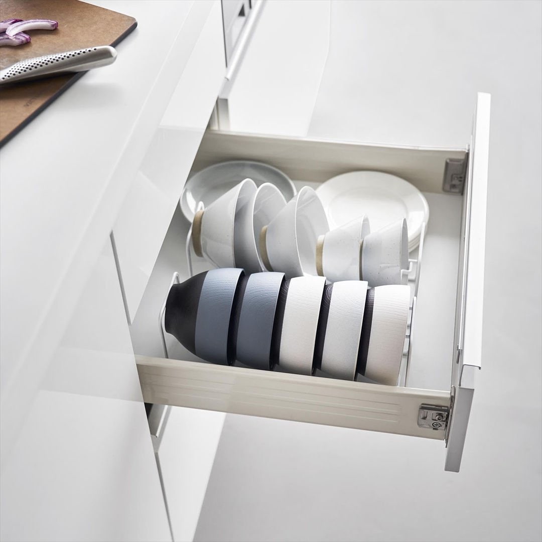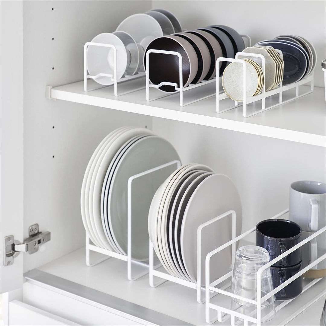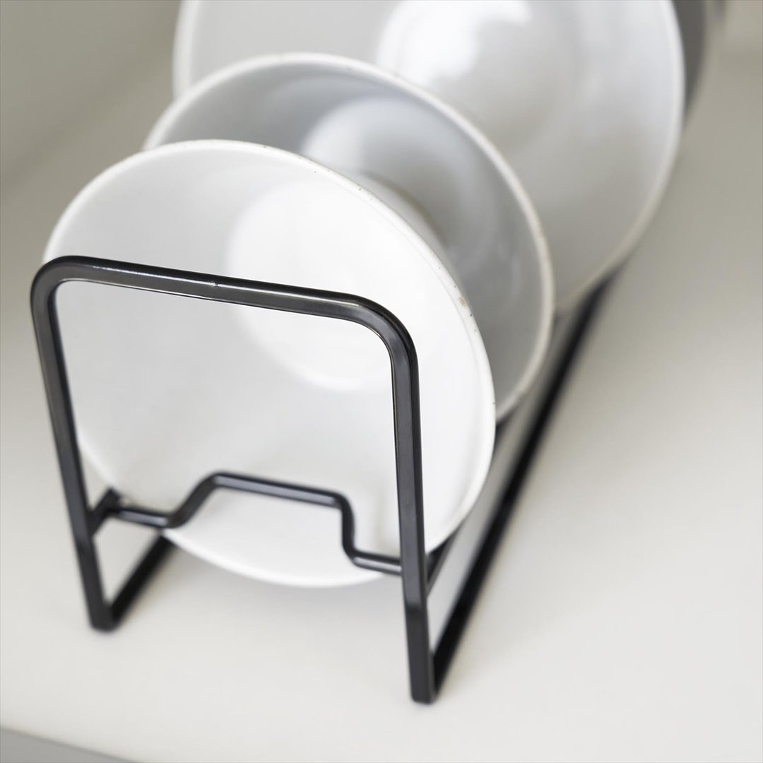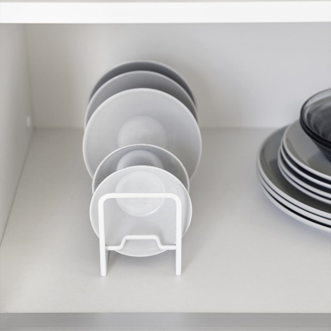お茶碗と汁椀を立てて収納。 引き出し収納も可能お茶碗や汁椀を立てて収納できるお椀スタンドです。重ねず立てて収納することで取り出しがスムーズで、器同士がぶつかるのを防ぎます。棚への収納はもちろん、引き出し内でのご使用もおすすめです。キッチンになじむ、2色のカラーバリエーションカラーは、明るい印象のホワイト、スタイリッシュなブラックをご用意しました。キッチンになじみやすいシンプルなモノトーンカラーです。食器棚や器のテイストに合わせてお好みのカラーをお選びください。安定感あるホールド力斜めに立ち上がった仕切り部分が食器をしっかりと固定します。お子さま用の食器として使いやすいプラスチックや樹脂製のほか、重さのある陶磁器製の器もしっかりとおさえてくれるので安心してご使用いただけます。お茶碗と汁椀で分けて収納も最大五個の食器を収納可能です。大きさや形状の違う器もすっきりとまとまるから食器棚の中から目的の器をすぐに取り出せます。お茶碗用・汁椀用とラッを分けたりしながら整理すれば食器棚の中がごちゃごちゃせず、来客時にも視線が気になりません。シリーズを揃えて統一感UP。一つの仕切りの中には豆皿が四~五枚ほど収納可能です。同シリーズの『豆皿収納ラック』とあわせてご使用になれば、統一感が出て見た目がよりすっきりと。※こちらの商品は『お椀&お茶碗収納ラック』の商品となり、『豆皿収納ラック』の商品は別売です。