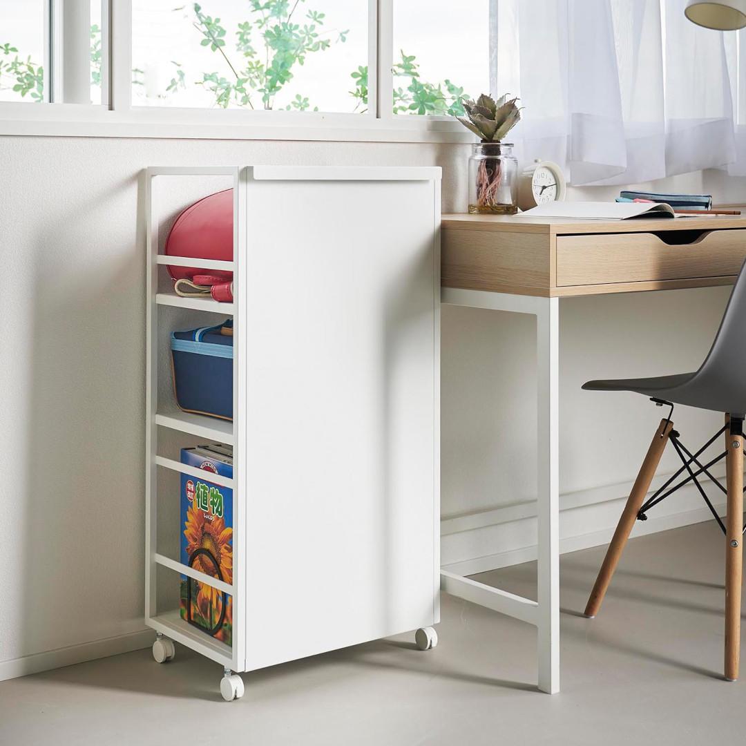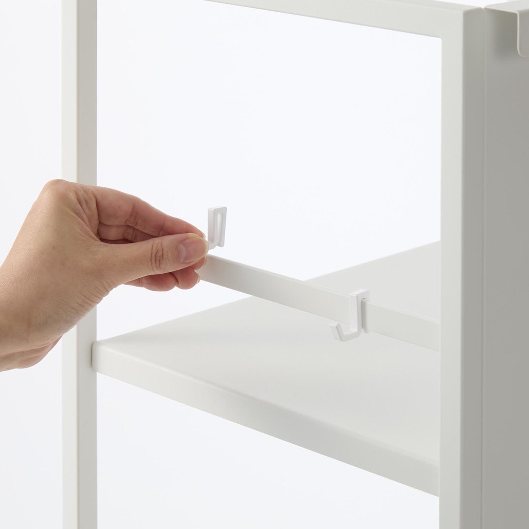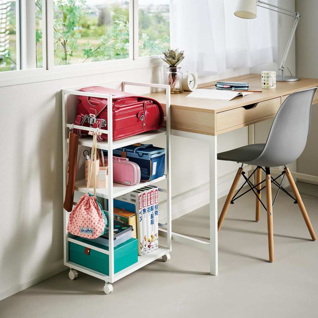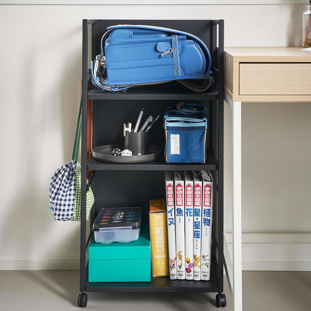生活感をシャットアウト。 目隠しワゴン子ども部屋、書斎、リビングなどでかさばる物を目隠ししながら収納できるキャスター付き3段ワゴンです。ワゴンの前後を裏返せば収納物を隠せるのでお部屋がすっきりとして見えます。小物収納に使えるフック4つ付きです。どのお部屋にもなじみやすい、2色のカラーバリエーションカラーは、明るい印象のホワイト、スタイリッシュなブラックをご用意しました。リビングにも書斎にもマッチするシンプルなモノトーンカラーです。お部屋の雰囲気にあわせてお好みのカラーをお選びください。子ども部屋でランドセル置き場にも一段目にはランドセル、二段目には絵の具やお習字の道具、三段目には図鑑や国語辞典など分類しながらすっきりと収納できます。学用品がひとまとめに片付くのでお部屋がすっきりとし、物の定位置を決めることでお子さんの片付け習慣も身に付きます。生活雑貨・日用品の収納にミシンやアイロンなど毎日は使わないけれど、必要なシーンが必ずあるアイテムも目隠しワゴンに収納。めったに使わないアイテムこそ取り出しにくい場所に収納していると途端に面倒くさくなってしまうので、普段は隠していつでも使えるように。収納物に合わせて棚の高さを二段階調整サイドフレームに棚板を掛けて簡単に取り付けられます。工具などは不要で、3つの棚はすべて収納する物に合わせて二段階で調整が可能です。付属のフックをサイドフレームに取り付ければ小物を引っ掛けて収納もできます。