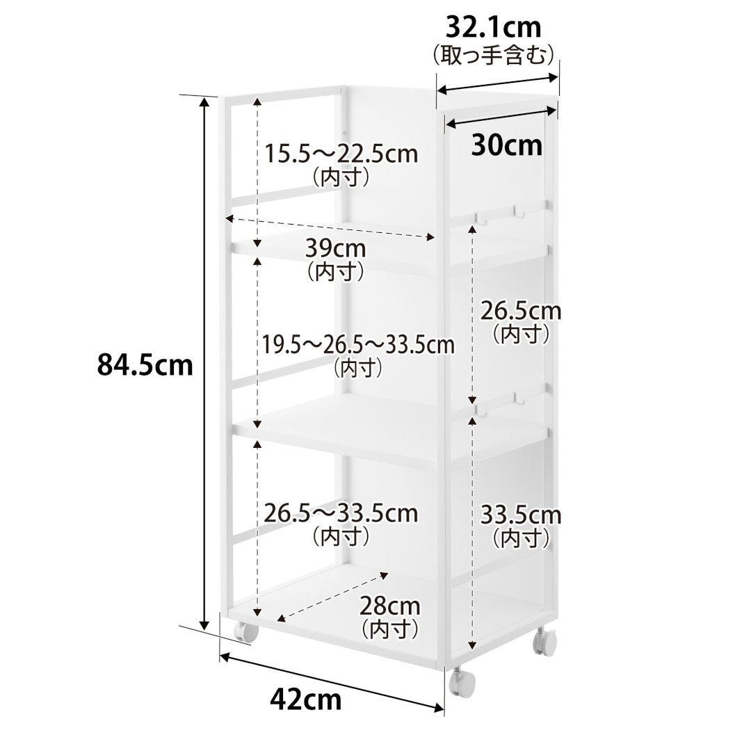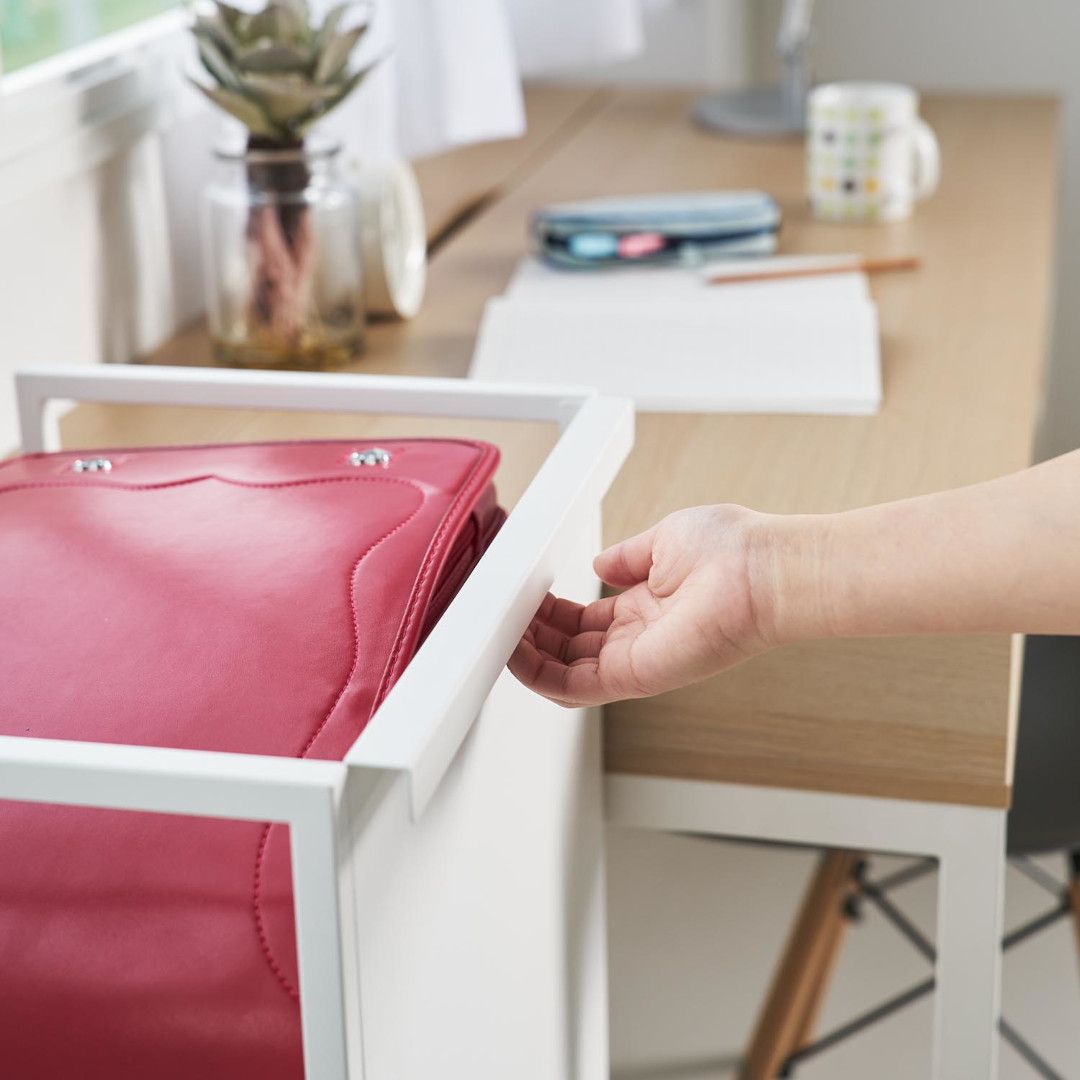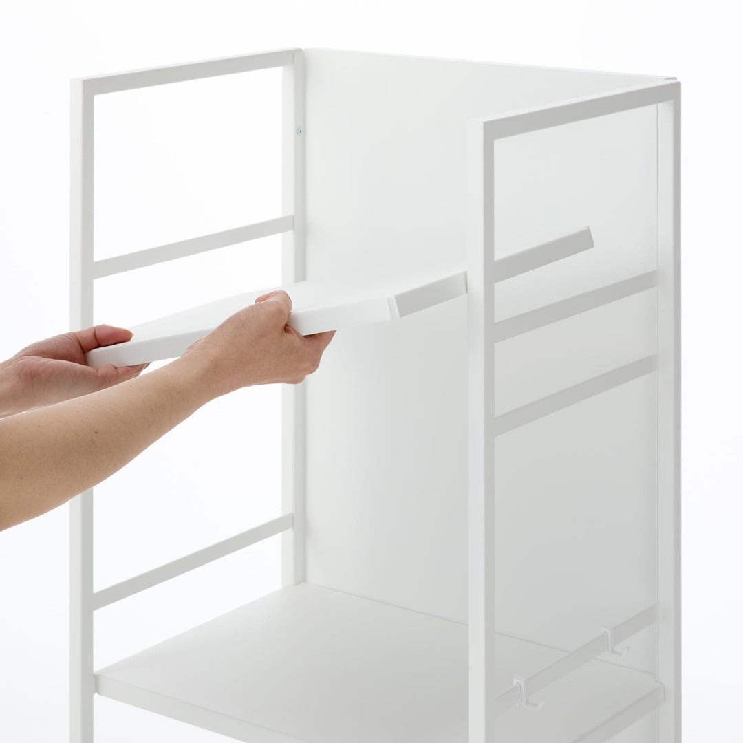 生活感をシャットアウト。 目隠しワゴン子ども部屋、書斎、リビングなどでかさばる物を目隠ししながら収納できるキャスター付き3段ワゴンです。ワゴンの前後を裏返せば収納物を隠せるのでお部屋がすっきりとして見えます。小物収納に使えるフック4つ付きです。どのお部屋にもなじみやすい、2色のカラーバリエーションカラーは、明るい印象のホワイト、スタイリッシュなブラックをご用意しました。リビングにも書斎にもマッチするシンプルなモノトーンカラーです。お部屋の雰囲気にあわせてお好みのカラーをお選びください。子ども部屋でランドセル置き場にも一段目にはランドセル、二段目には絵の具やお習字の道具、三段目には図鑑や国語辞典など分類しながらすっきりと収納できます。学用品がひとまとめに片付くのでお部屋がすっきりとし、物の定位置を決めることでお子さんの片付け習慣も身に付きます。生活雑貨・日用品の収納にミシンやアイロンなど毎日は使わないけれど、必要なシーンが必ずあるアイテムも目隠しワゴンに収納。めったに使わないアイテムこそ取り出しにくい場所に収納していると途端に面倒くさくなってしまうので、普段は隠していつでも使えるように。収納物に合わせて棚の高さを二段階調整サイドフレームに棚板を掛けて簡単に取り付けられます。工具などは不要で、3つの棚はすべて収納する物に合わせて二段階で調整が可能です。付属のフックをサイドフレームに取り付ければ小物を引っ掛けて収納もできます。