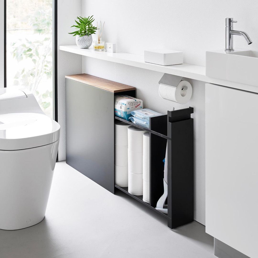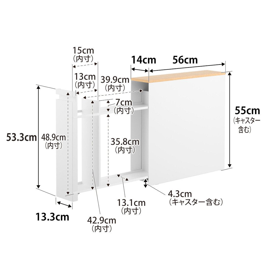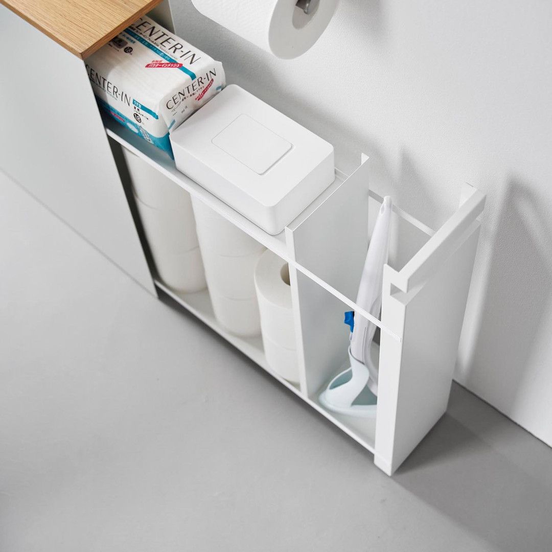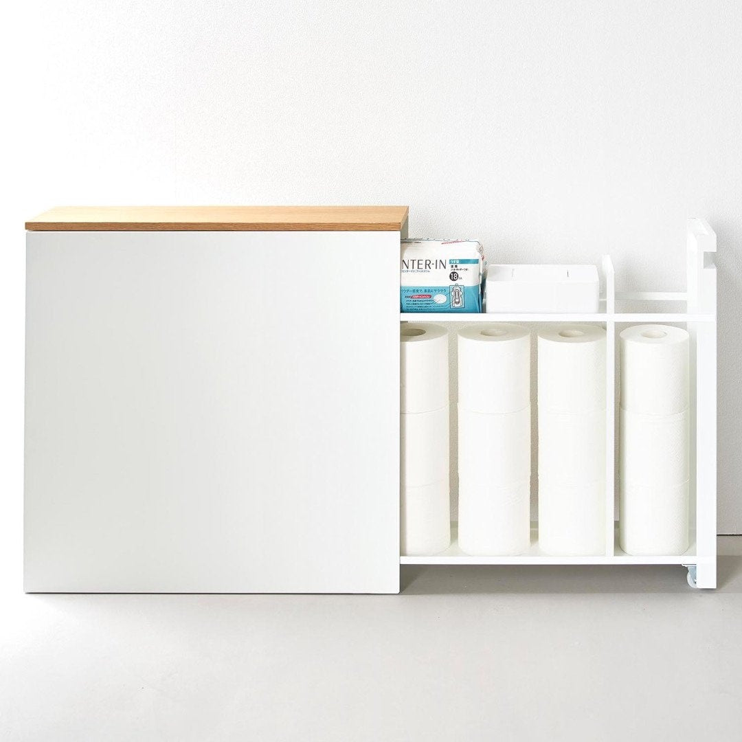 引き出して大容量。 スリムに置けるトイレ収納トイレ小物を隠しながら大容量収納が叶うキャスター付き引き出し収納です。スリムだからトイレの中に置いても邪魔になりません。左右・引き出しの向きなどお好きな置き方ができるからどのご家庭のトイレにも導入しやすいアイテムです。どんなトイレインテリアにもOK。 2色のカラーバリエーションカラーは、清潔感のあるホワイト、スタイリッシュなブラックをご用意しました。どのお家のトイレにもマッチするシンプルなモノトーンカラーです。天板も本体カラーに合わせたカラーリングになっています。トイレの中にスマートに設置幅14cm×高さ55cm×奥行き56cmのスリムさは狭いトイレ空間でも圧迫感なく設置できます。低めの高さで設計されているので、手洗いカウンター下にも無理なく置けるサイズ感です。本体はスチール製なため側面をマグネット収納としてもご使用いただけます。スリムなのに大容量。 トイレ小物がすっきりと収まるキャスター付きの引き出しには、トイレロールは縦に三段×三列で九個、トイレブラシ、お掃除用ウェットシートなどを区分けして収納できます。トイレブラシはスタンドごと収納できるのが◎サニタリー用品や使い捨てトイレブラシのストックを収納しておくのもおすすめです。ホコリの侵入をブロック。 収納物はキレイなままキャスターと取っ手付きだからたくさんの物を収納していても引き出しがスムーズです。引き出し部だけでなく本体側にも底板があるためホコリの侵入を防ぎます。収納部も中の収納物もしっかりと汚れから守れて安心してお使いいただけます。