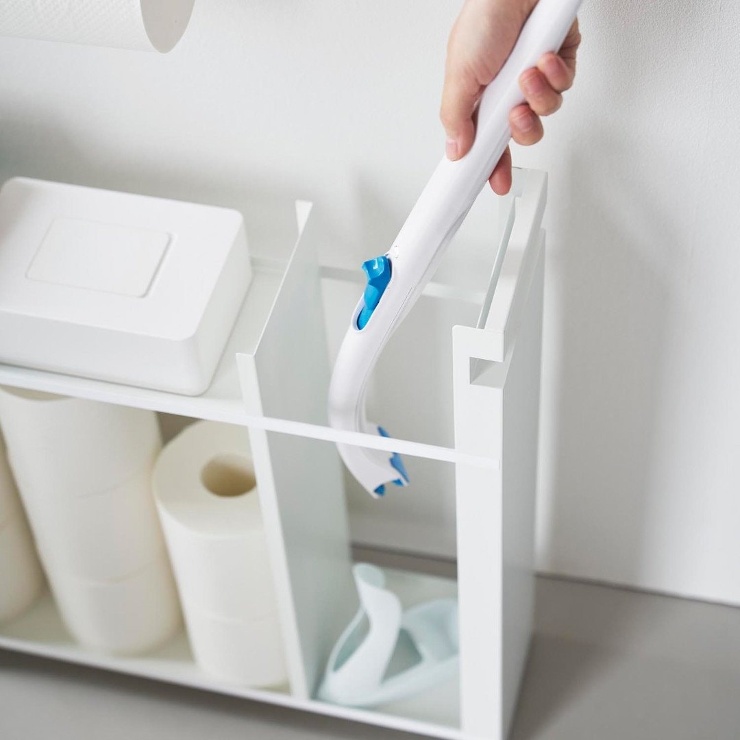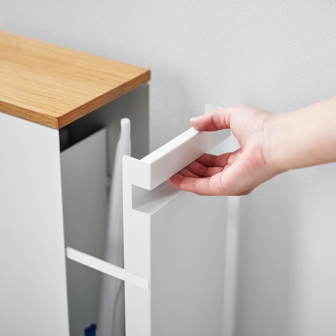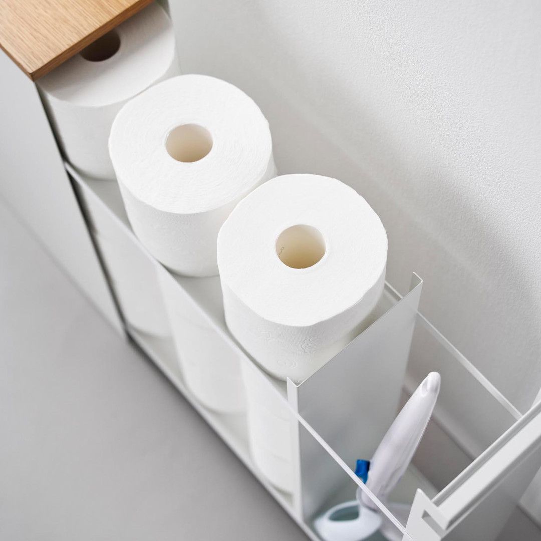 引き出して大容量。 スリムに置けるトイレ収納トイレ小物を隠しながら大容量収納が叶うキャスター付き引き出し収納です。スリムだからトイレの中に置いても邪魔になりません。左右・引き出しの向きなどお好きな置き方ができるからどのご家庭のトイレにも導入しやすいアイテムです。どんなトイレインテリアにもOK。 2色のカラーバリエーションカラーは、清潔感のあるホワイト、スタイリッシュなブラックをご用意しました。どのお家のトイレにもマッチするシンプルなモノトーンカラーです。天板も本体カラーに合わせたカラーリングになっています。トイレの中にスマートに設置幅14cm×高さ55cm×奥行き56cmのスリムさは狭いトイレ空間でも圧迫感なく設置できます。低めの高さで設計されているので、手洗いカウンター下にも無理なく置けるサイズ感です。本体はスチール製なため側面をマグネット収納としてもご使用いただけます。スリムなのに大容量。 トイレ小物がすっきりと収まるキャスター付きの引き出しには、トイレロールは縦に三段×三列で九個、トイレブラシ、お掃除用ウェットシートなどを区分けして収納できます。トイレブラシはスタンドごと収納できるのが◎サニタリー用品や使い捨てトイレブラシのストックを収納しておくのもおすすめです。ホコリの侵入をブロック。 収納物はキレイなままキャスターと取っ手付きだからたくさんの物を収納していても引き出しがスムーズです。引き出し部だけでなく本体側にも底板があるためホコリの侵入を防ぎます。収納部も中の収納物もしっかりと汚れから守れて安心してお使いいただけます。
